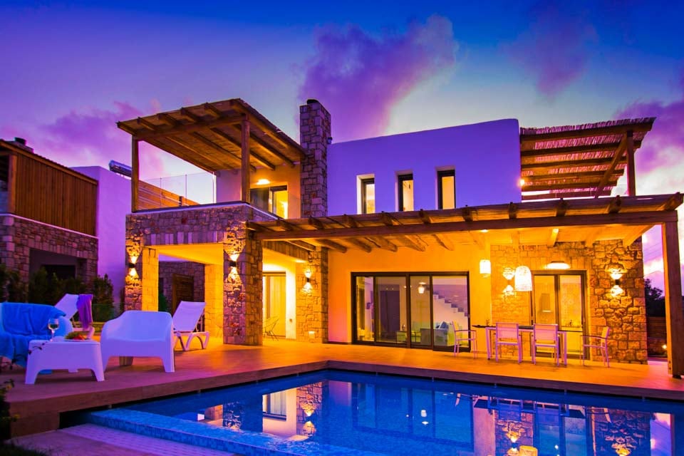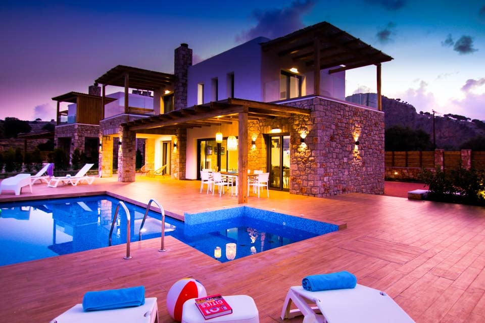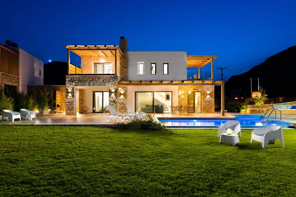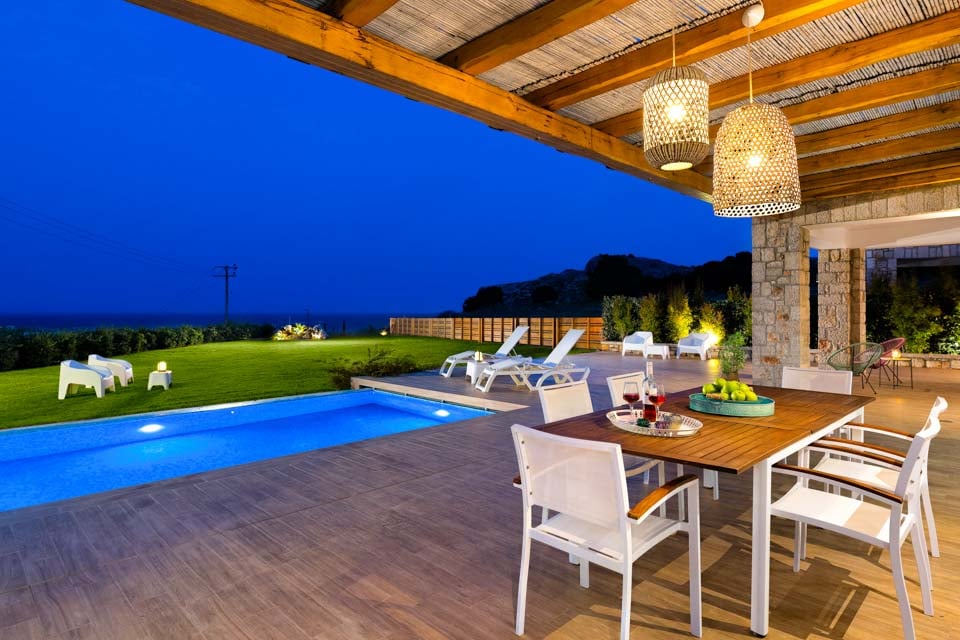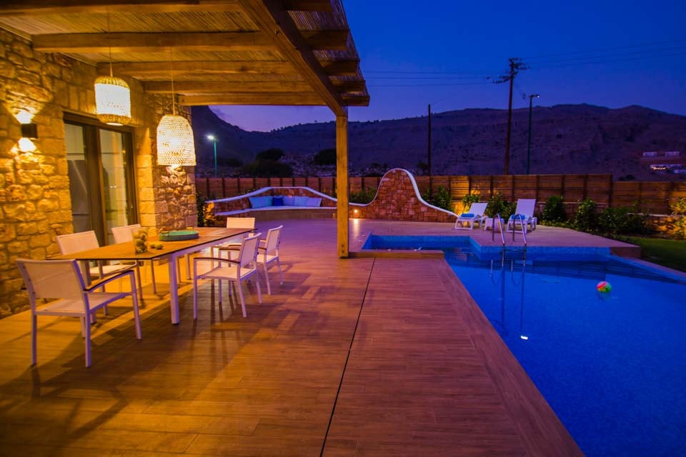 Villa on kaksikerroksinen ja sinne mahtuu mukavasti jopa kuusi henkilöä. Pohjakerroksessa on yksi ilmastoitu makuuhuone omalla kylpyhuoneella, olohuone, jossa on mukava oleskelualue ja suuri taulutelevisio, avoin täysin varusteltu keittiö ruokailutilalla ja vieras-WC. Olohuoneesta on käynti suurelle kalustetulle verannalle, jossa on grillausmahdollisuus. Verannalla voit rentoutua ja nauttia upeasta näköalasta siniselle merelle ja puutarhaan. Täältä löydät myös suuren yksityisen lämmitetyn uima-altaan, jossa on poreallas, aurinkotuoleja ja -varjoja.