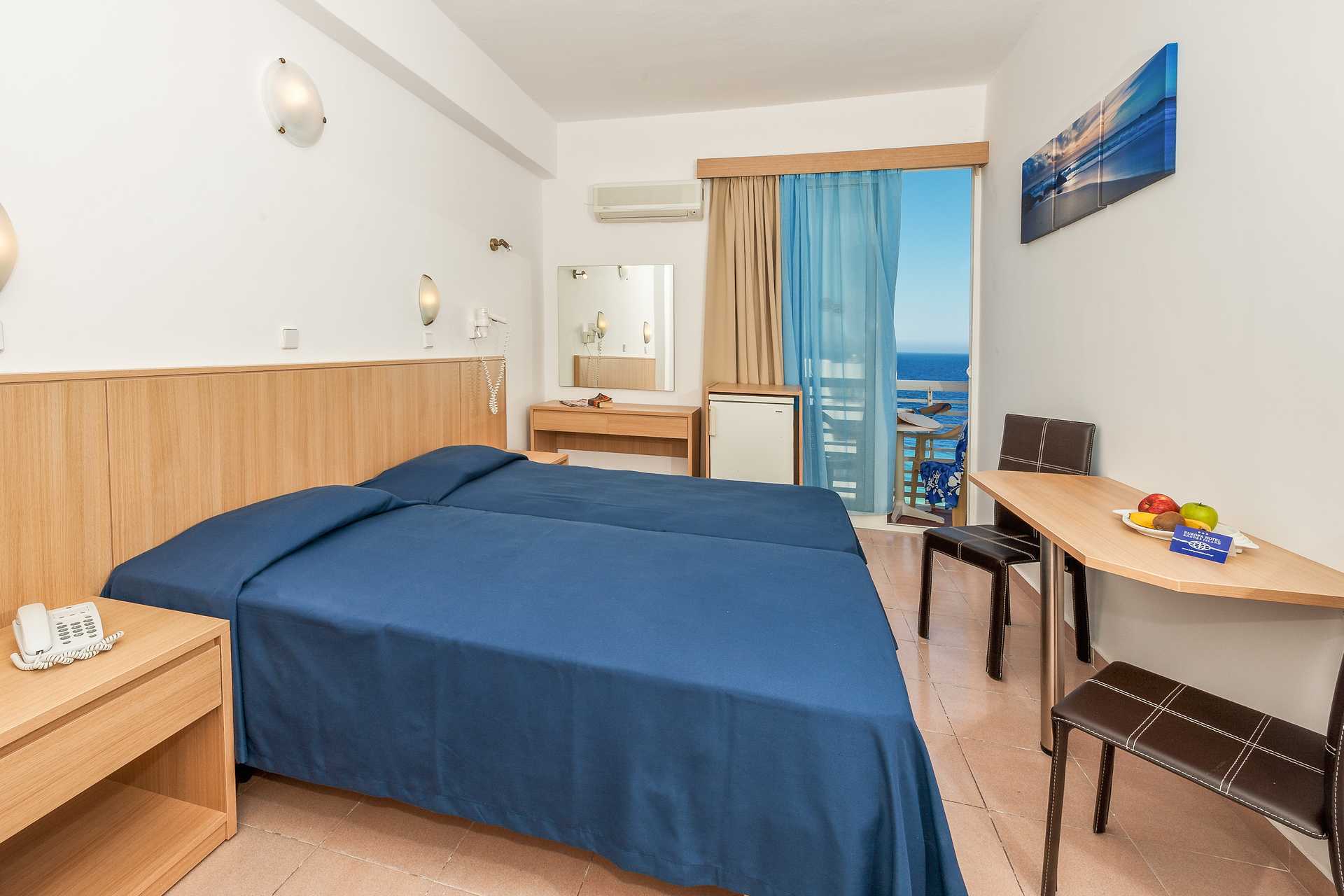 Kahden hengen huone parvekkeella. Kaksi yhden hengen sänkyä. Lisävuodemahdollisuus yhden hengen sängystä. Maksuton wifi, tallelokero ja ilmastointi. Jääkaappi. Tv kansainvälisillä kanavilla. Hiustenkuivain. Kylpyamme tai suihku ja wc. Siivous 6 krt/viikko.