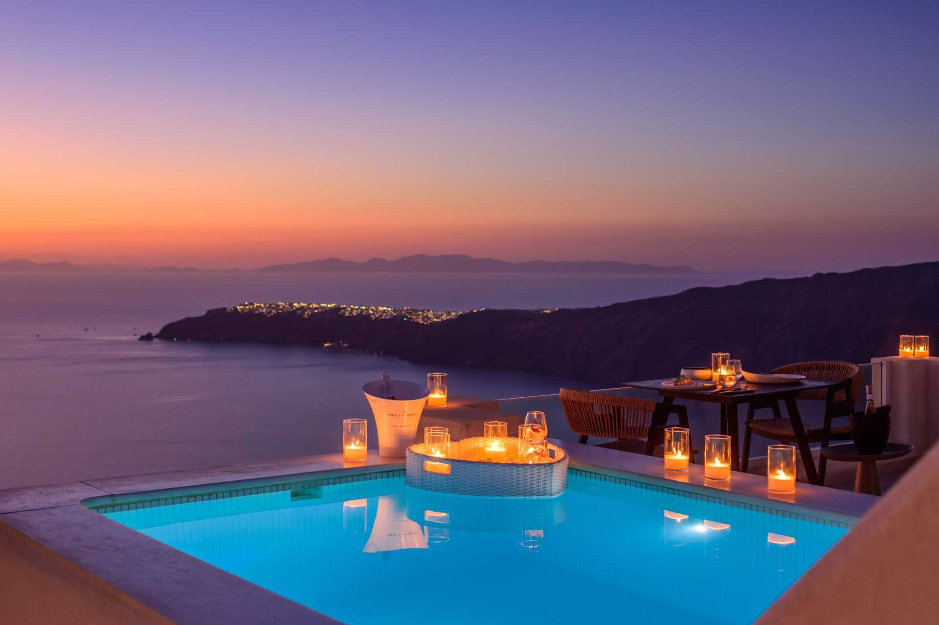 Andromeda Villas & Spa Resort on täydellinen valinta romanttista lomaa Santorinilla etsiville. Vastustamattomat auringonlaskut luovat taustan vierailullesi, ja hotelli-ravintolan houkutteleviin tuoksuihin ja makuihin on helppo ihastua. Unohtumattomaan kokemukseen suosittelemme sviittiä yksityisellä porealtaalla tai Deluxe-sviittiä omalla uima-altaalla.