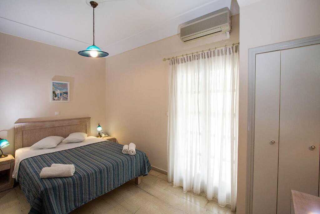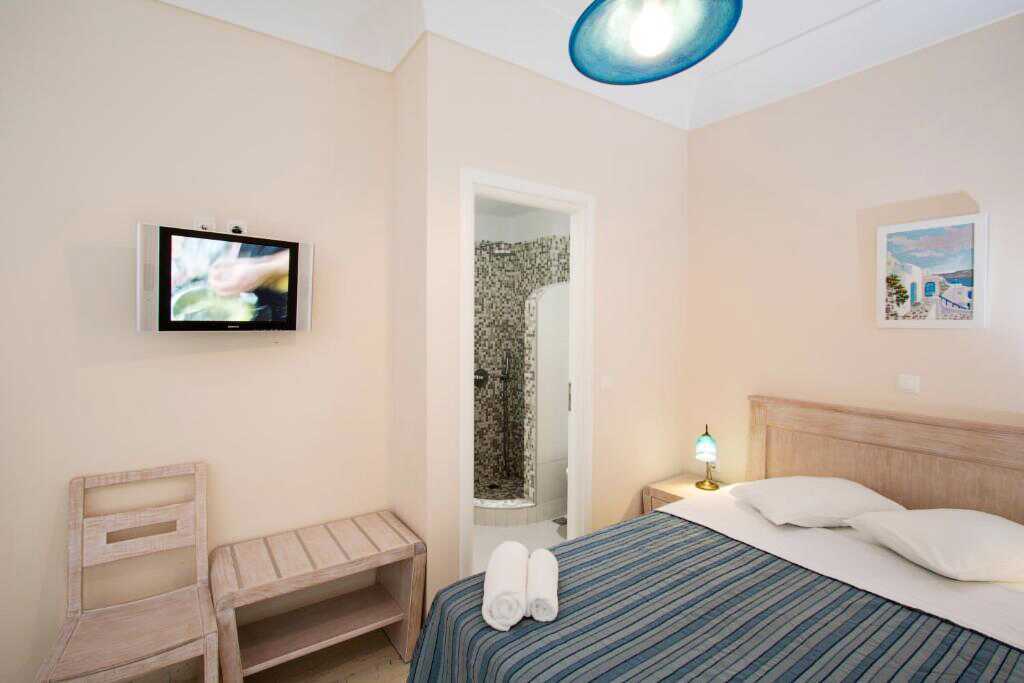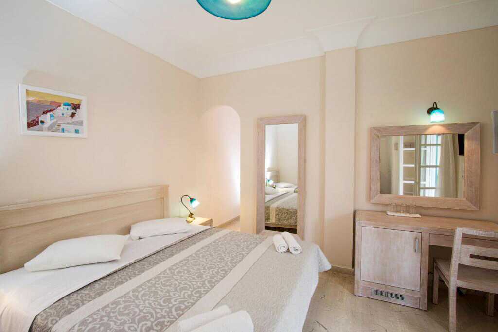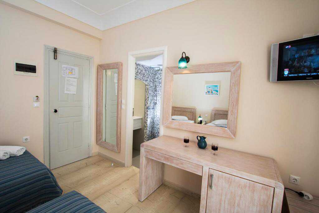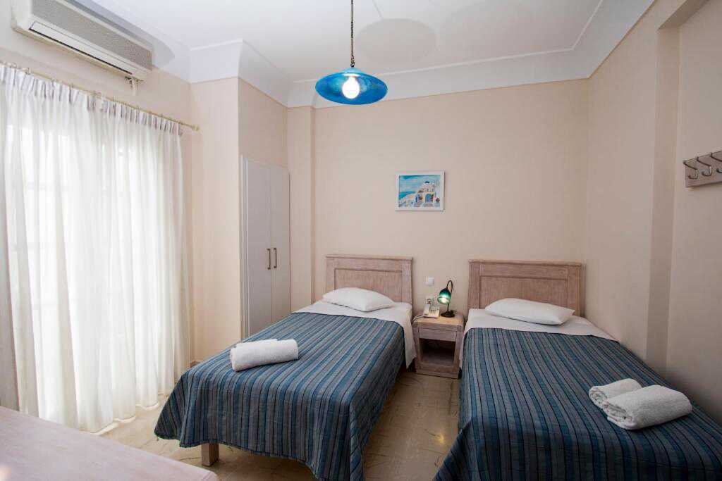 Kolmen hengen huone parvekkeella tai terassilla. Parivuode ja yhden hengen vuode. Maksuton wifi ja ilmastointi. Tallelokero lisämaksusta. Jääkaappi. Tv kansainvälisillä kanavilla. Hiustenkuivain. Kylpyhuoneessa suihku ja wc. Siivous 6 krt/viikko.