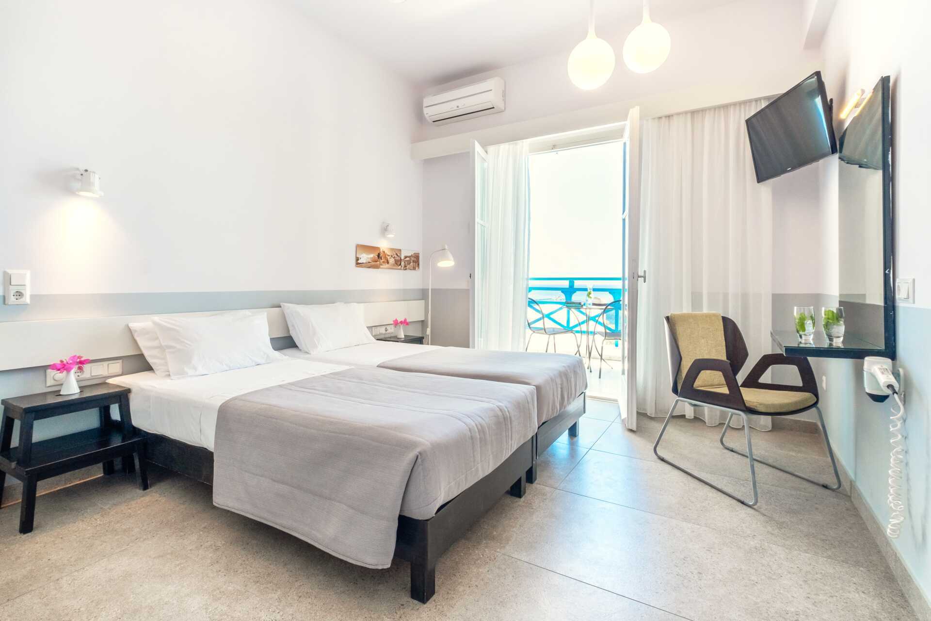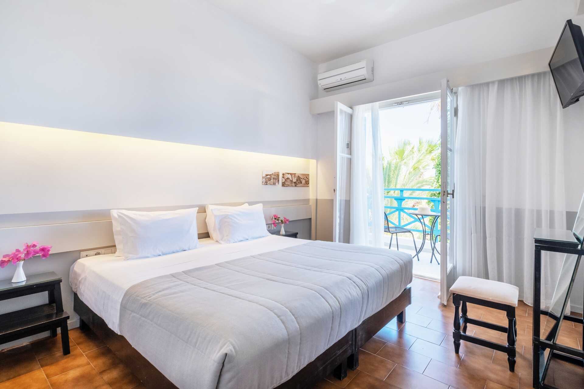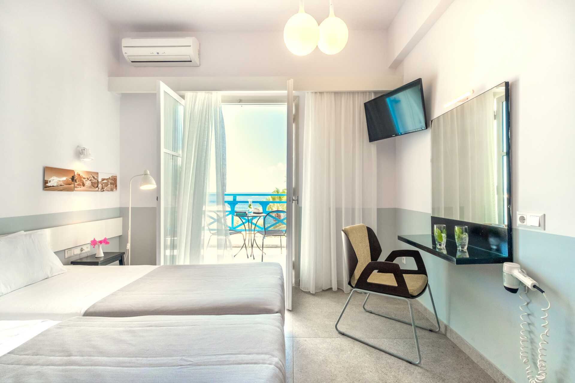 Kahden hengen huoneissa on parivuode tai kaksi erillistä vuodetta. Parveke, osa merinäköalalla. Tv kansainvälisillä kanavilla. Jääkaappi. Maksuton wifi, ilmastointi ja tallelokero. Hiustenkuivain. Kylpyamme/suihku ja wc. Siivous 7 krt/viikko. Huomioithan, että alle 2 -vuotiaat lapset lasketaan lisävuoteella majoittuviksi henkilöiksi.