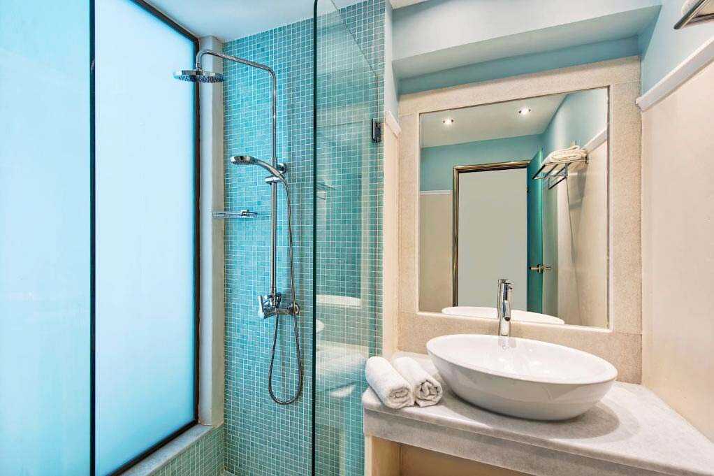 Kahden hengen huone parvekkeella tai terassilla. Parivuode tai kaksi yhden hengen sänkyä. Maksuton wifi, ilmastointi ja tallelokero. Jääkaappi. Tv kansainvälisillä kanavilla. Hiustenkuivain. Kylpyhuoneessa suihku ja wc. Siivous 6 krt/viikko.