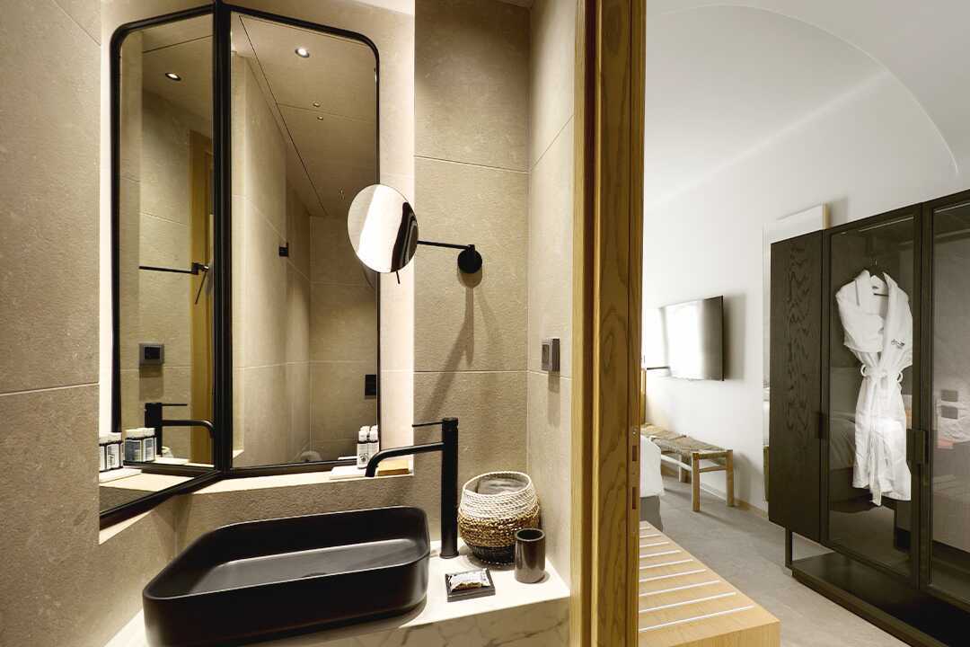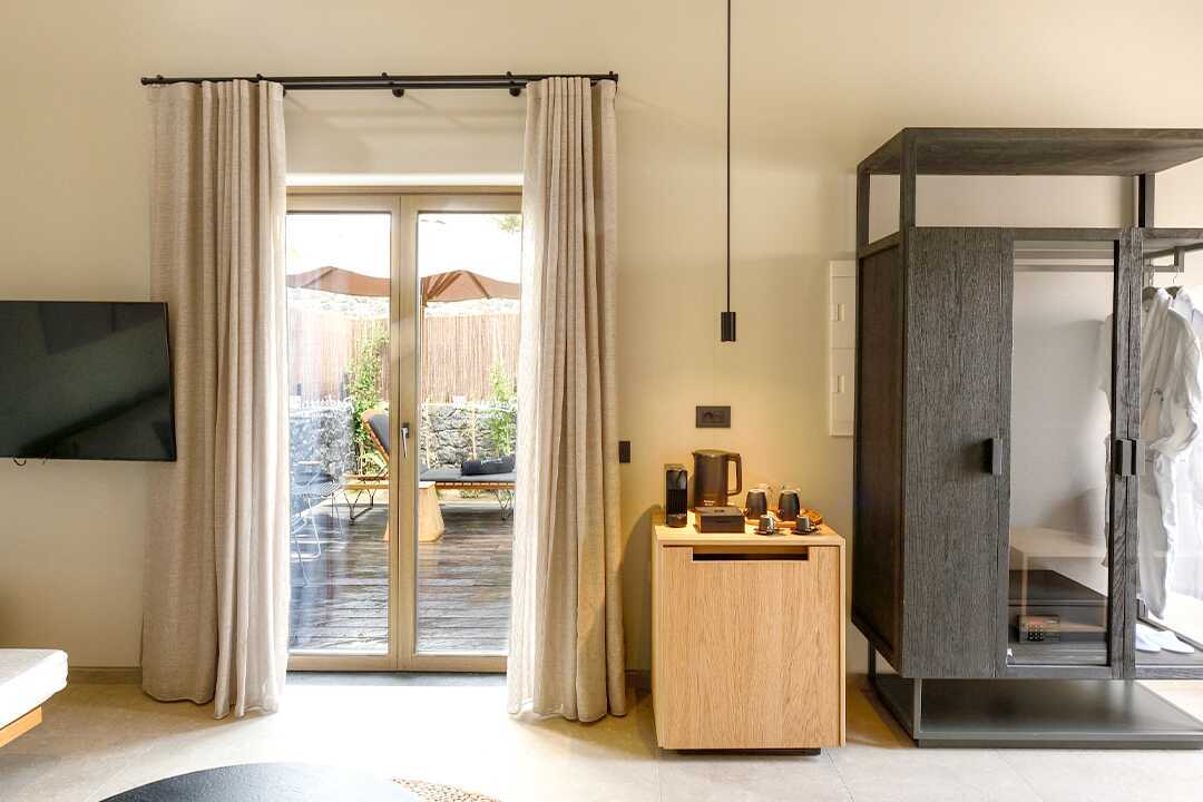 Kahden hengen huoneita, joissa on maaterassi ja jacuzzi ulkotilassa. Parivuode tai kaksi yhden hengen vuodetta. Maksuton wifi, ilmastointi ja tallelokero. Jääkaappi, vesi sisältyy hintaan. Nespressokeitin. Vedenkeitin, kahvia ja teetä. Tv kansainvälisillä kanavilla. Kylpytakit ja tossut. Hiustenkuivain. Kylpyhuoneessa osittain avoin pohjaratkaisu, erillinen suihku ja wc. Siivous 7 krt/viikko.