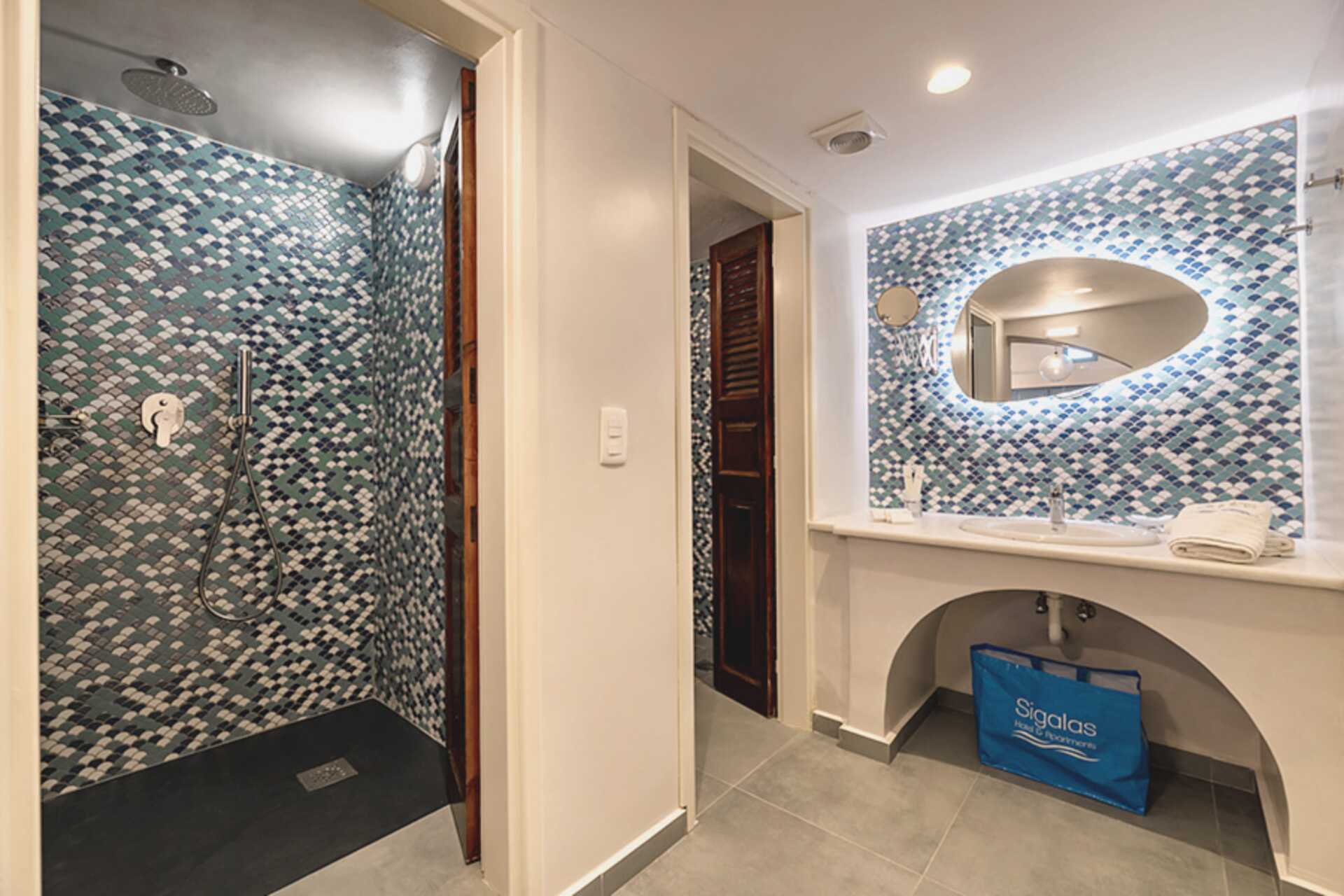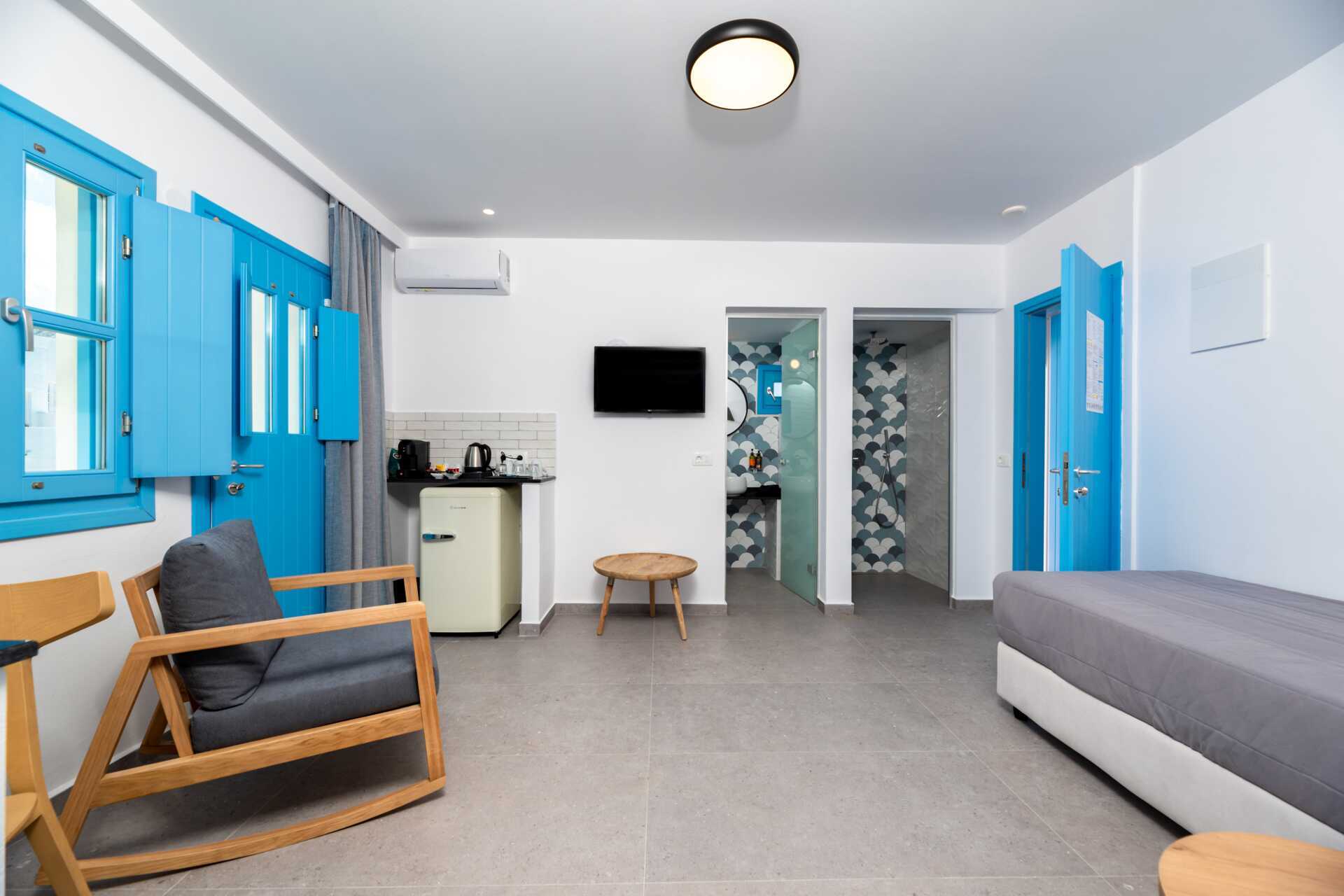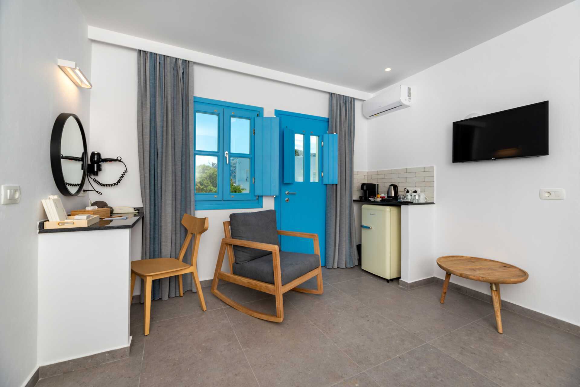 Sviitti maaterassilla. Terassilla on portti. Makuuhuone ja olohuonealue. Parivuode. Lisävuodemahdollisuus vuodesohvasta. Tyynymenu. Maksuton wifi, ilmastointi ja tallelokero. Jääkaappi. Kahvinkeitin. Illy-espressokeitin. Vedenkeitin, kahvia ja teetä. Tv kansainvälisillä kanavilla. Rantakassi, jossa on allas- ja rantapyyhkeet. Kylpytakit ja tossut. Hiustenkuivain. Suihku ja wc. Siivous 7 krt/viikko. Alle 2-vuotiaat lapset lasketaan lisävuoteella majoittuviksi henkilöiksi.