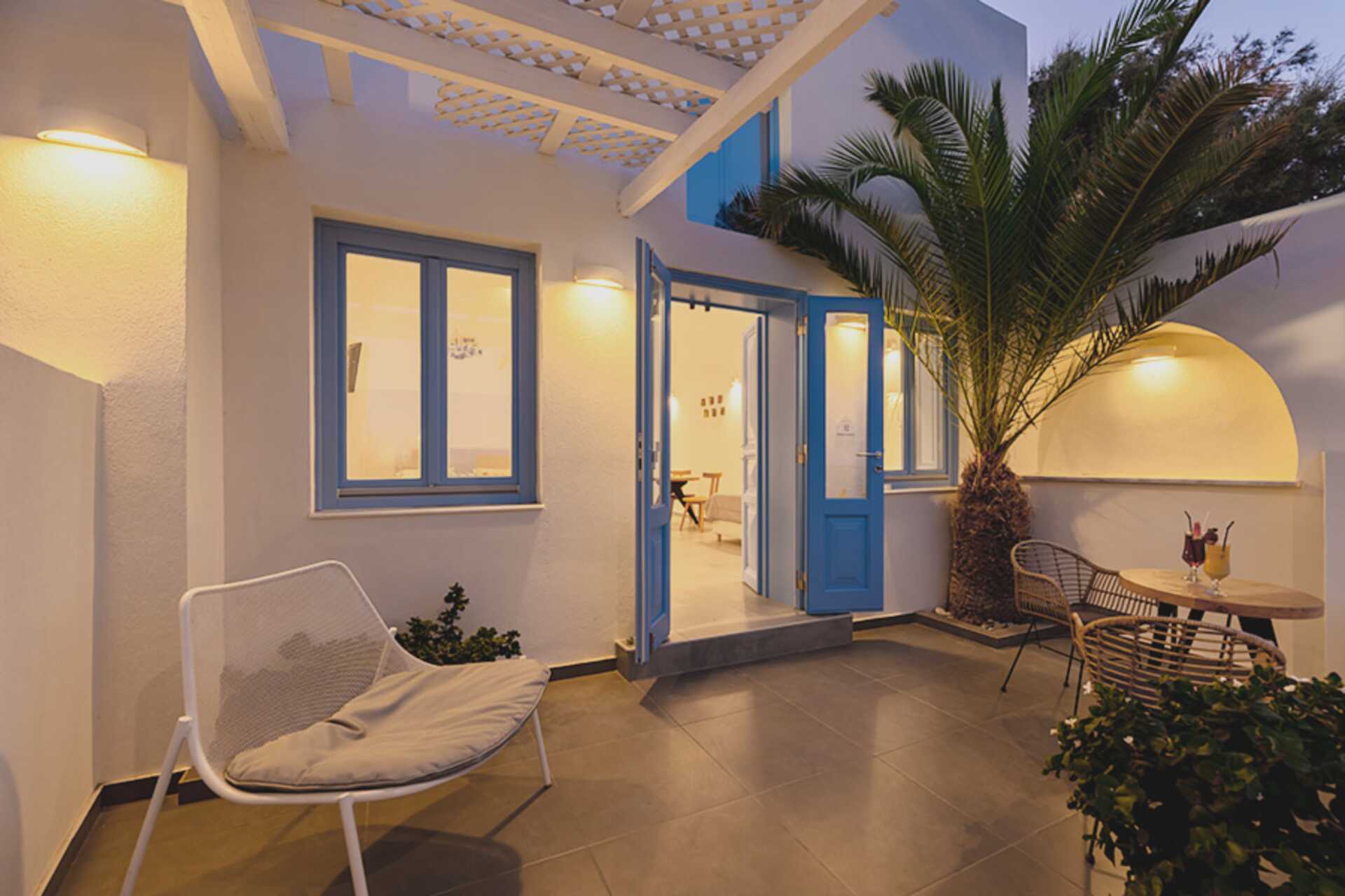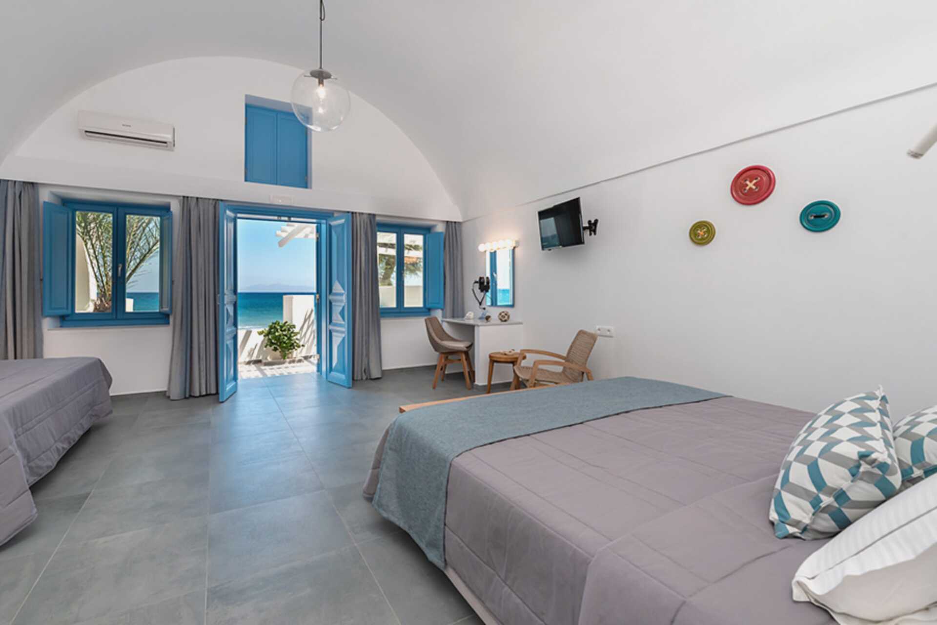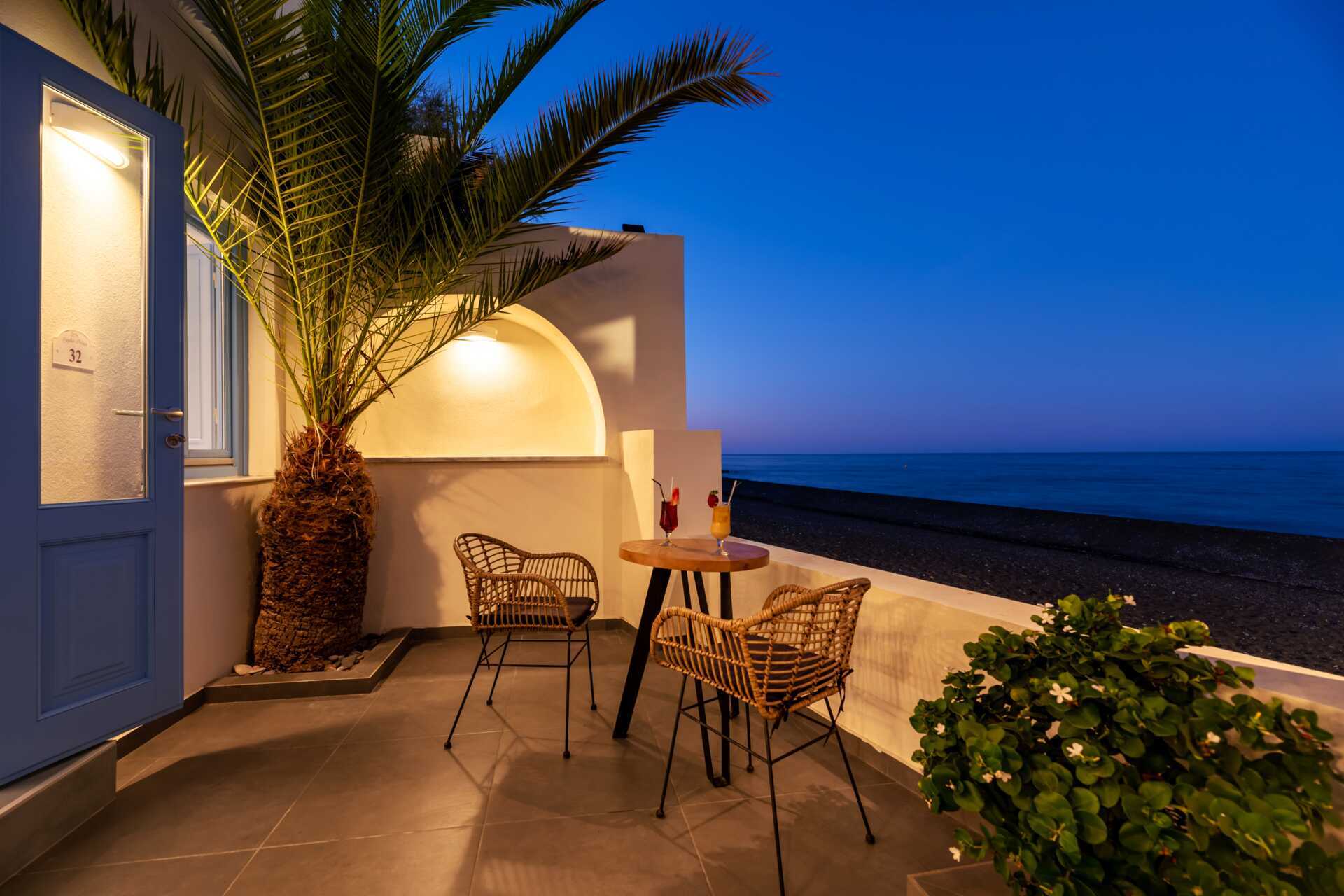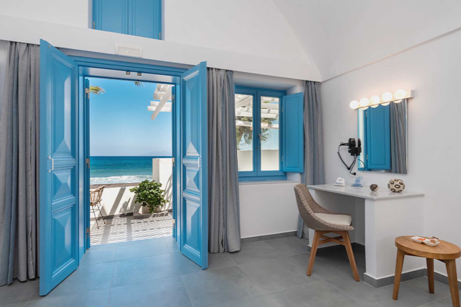 Deluxe-sviitti, jossa on maaterassi ja merinäköala. Sviitti sijaitsee lähimpänä rantaa ja koostuu makuuhuoneesta ja olohuoneesta. Parivuode. Lisävuodemahdollisuus vuodesohvasta. Maksuton wifi, ilmastointi ja tallelokero. Jääkaappi. Illy-espressokeitin. Vedenkeitin. Tv kansainvälisillä kanavilla. Rantakassi, jossa on allas- ja rantapyyhkeet. Kylpytakit ja tossut. Hiustenkuivain. Suihku ja wc. Siivous 7 krt/viikko. Alle 2-vuotiaat lapset lasketaan lisävuoteella majoittuviksi henkilöiksi.