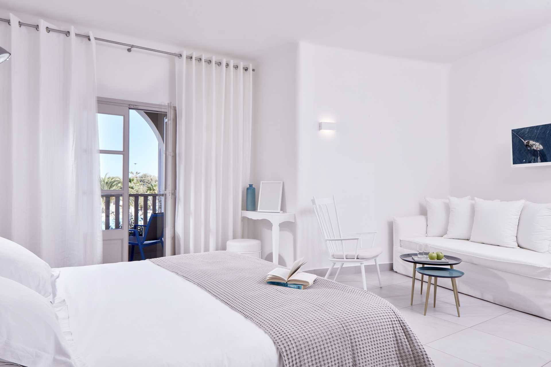 Juniorsviitti parvekkeella tai terassilla. Makuuhuoneen ja olohuoneen välissä avoin pohjaratkaisu. Parivuode tai kaksi yhden hengen sänkyä. Lisävuodemahdollisuus kahdelle vuodesohvalla. Jääkaappi. Maksuton wifi, ilmastointi ja tallelokero. Tv kansainvälisillä kanavilla. Hiustenkuivain. Kylpyhuoneessa suihku ja wc. Siivous 7 krt/viikko.