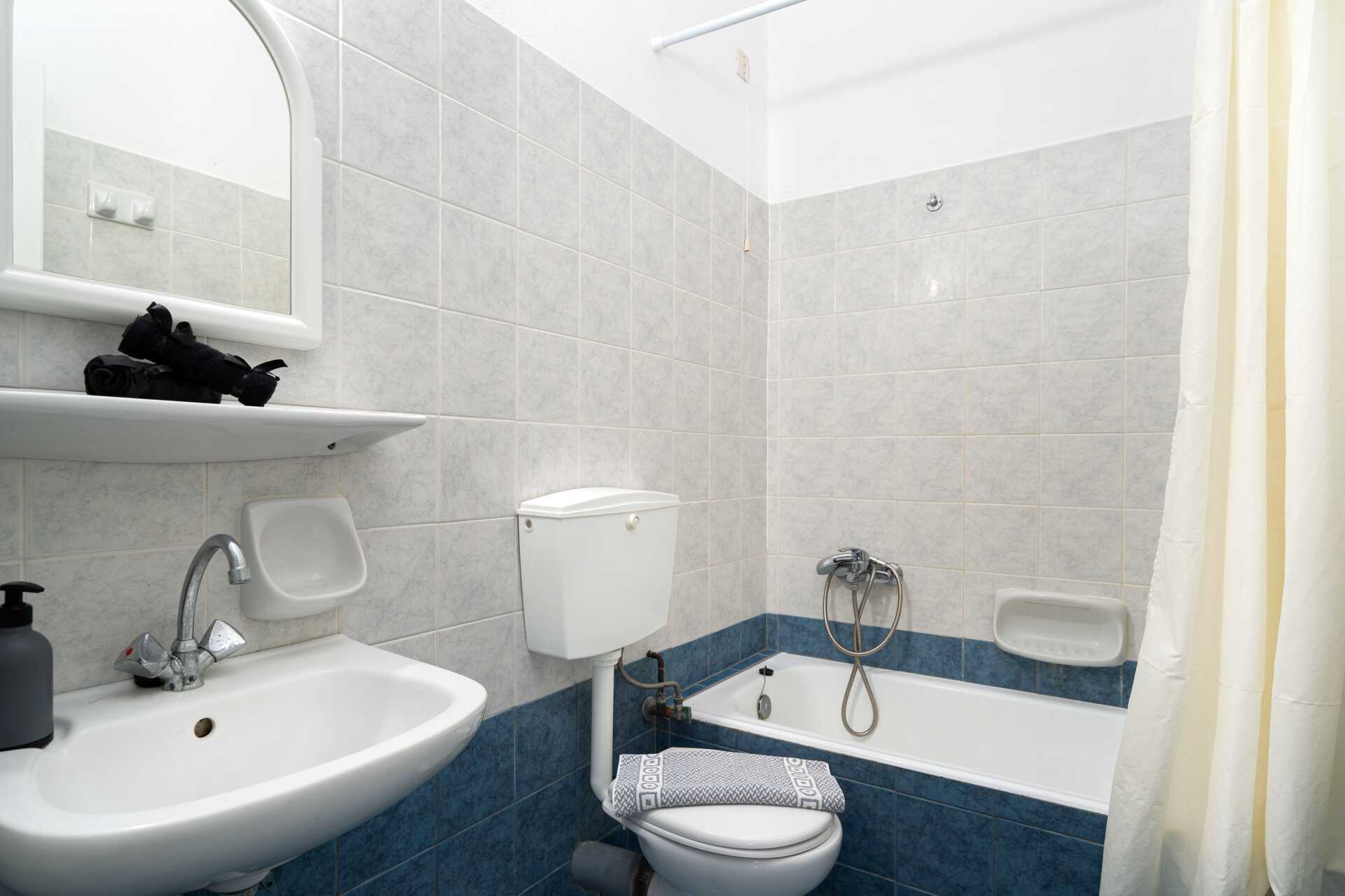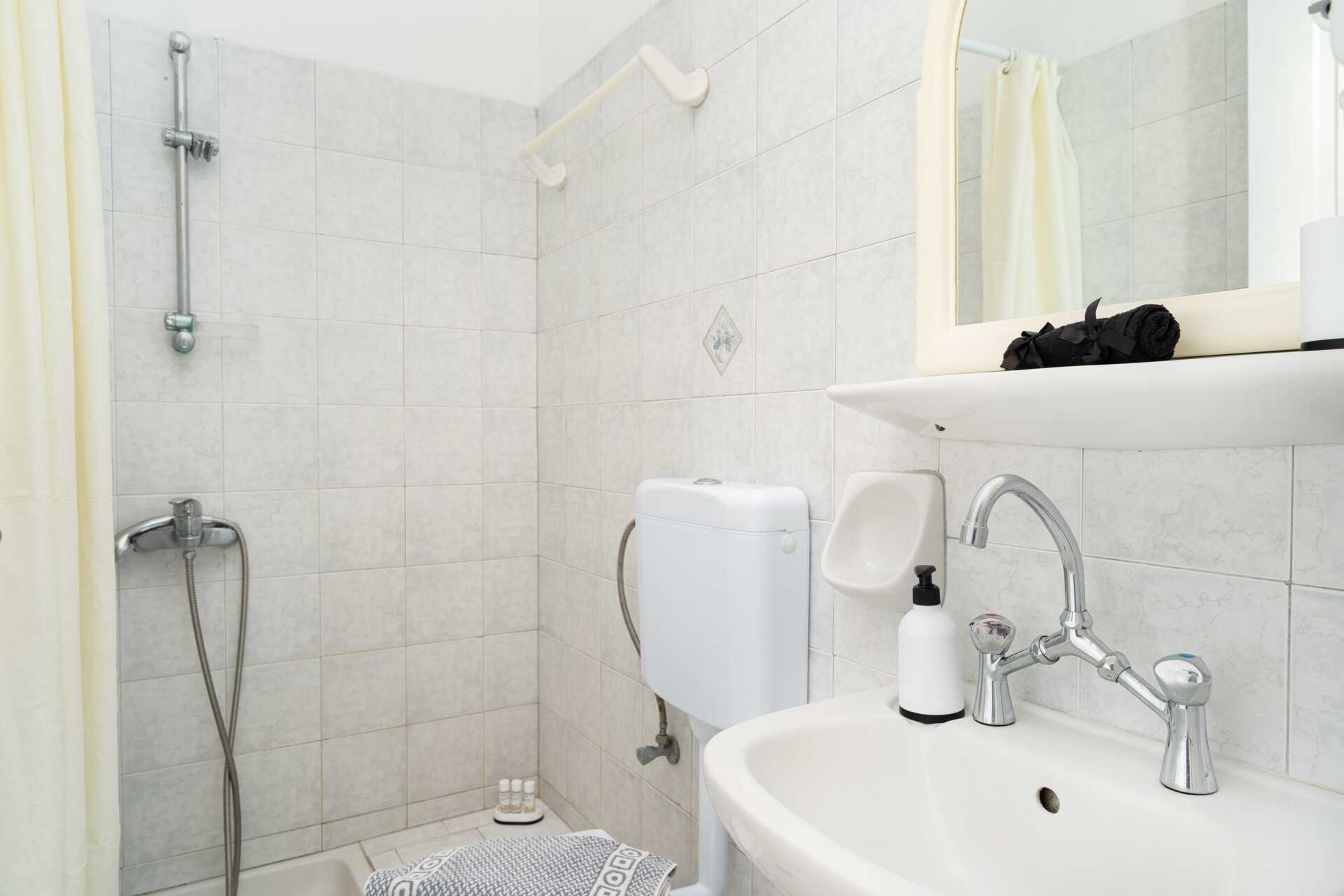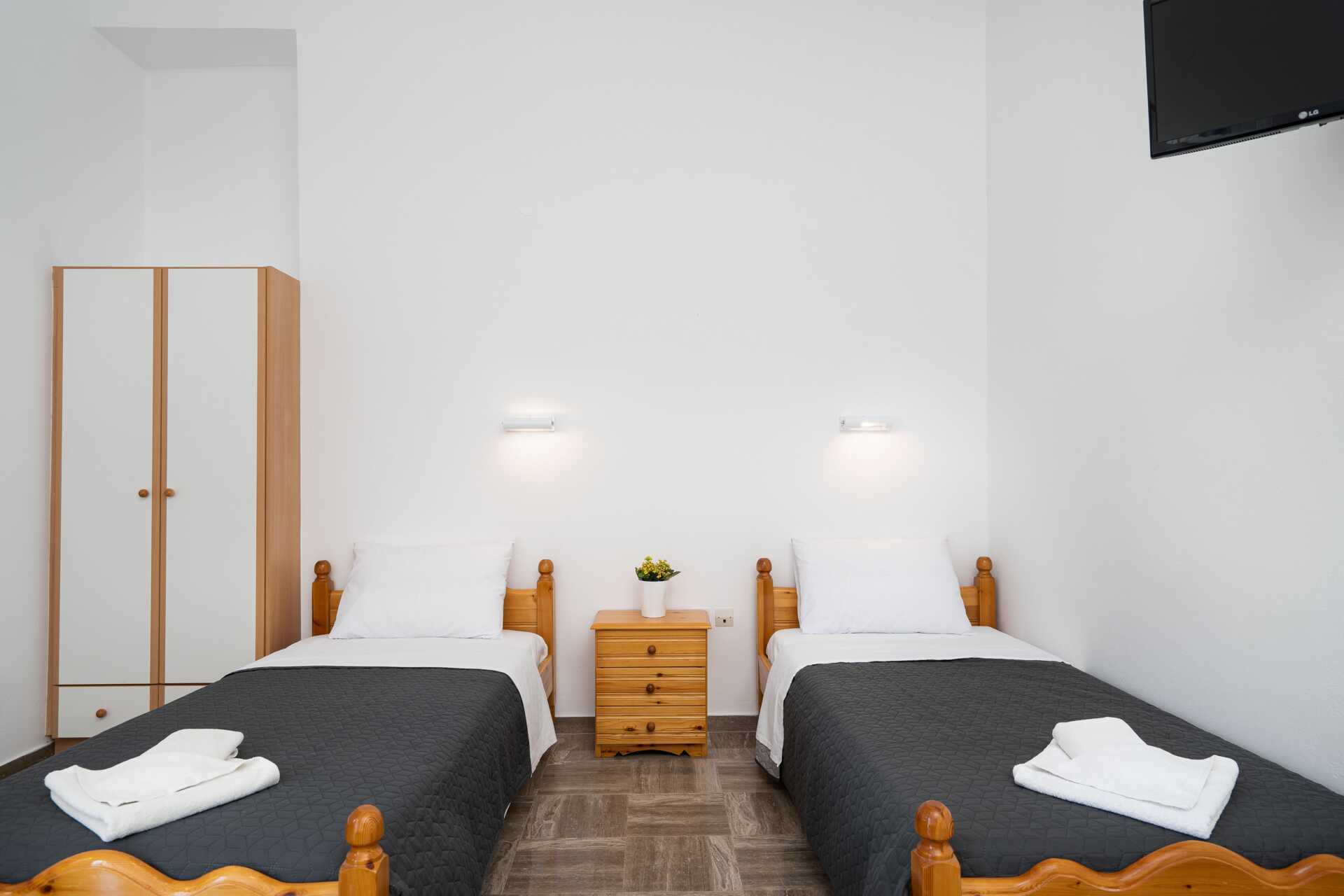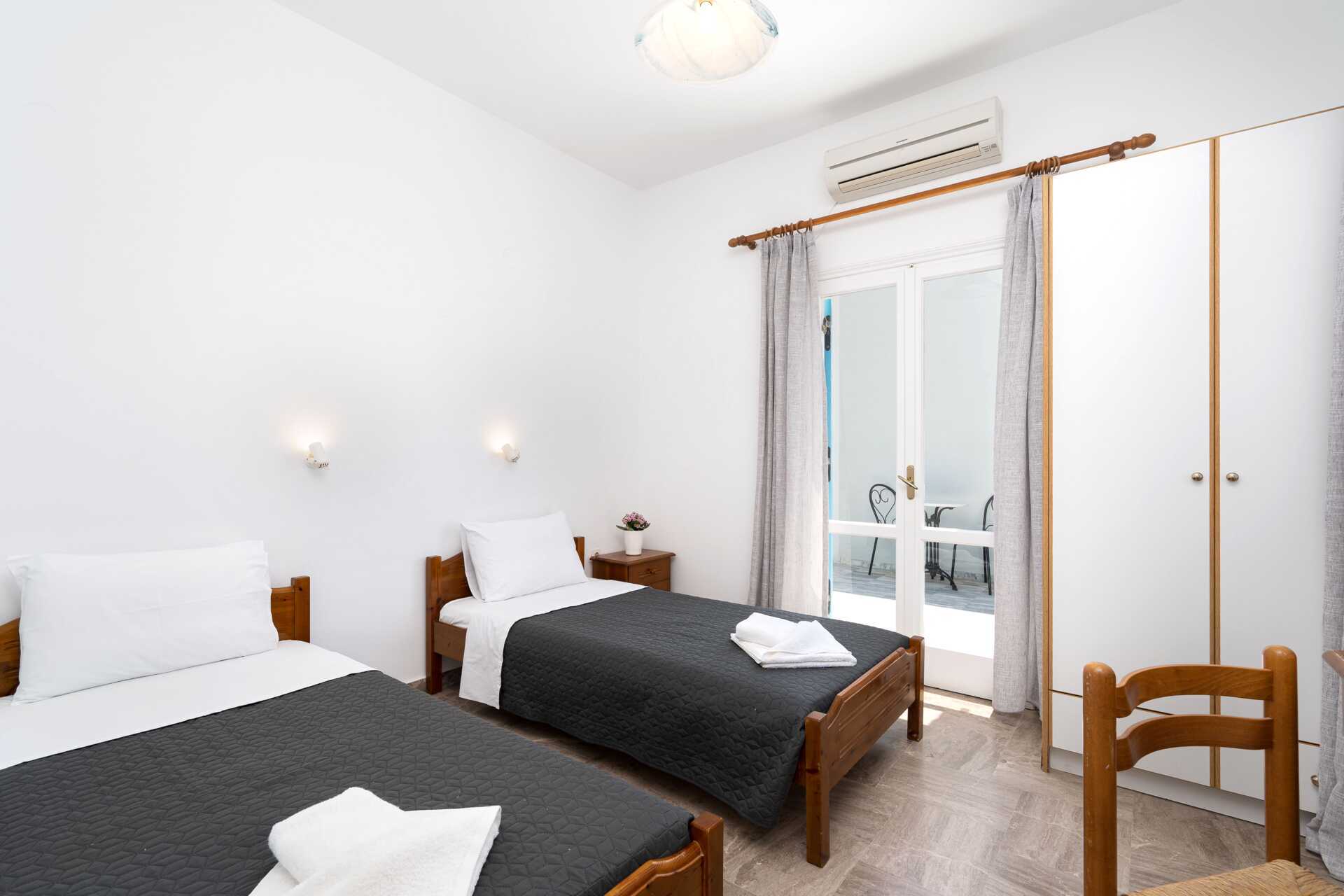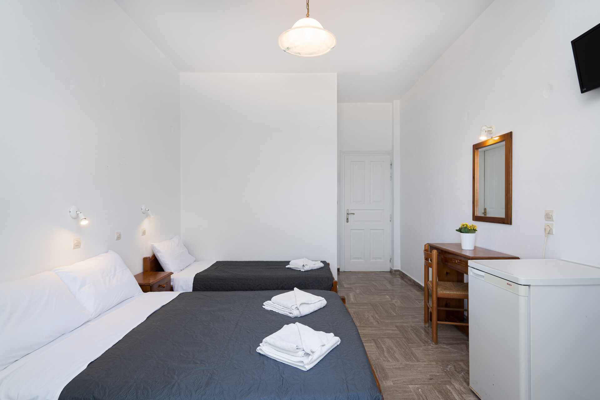 Kolmen hengen huone parvekkeella tai terassilla. Kolme erillistä sänkyä tai yksi parisänky ja yksi yhden hengen sänky. Maksuton wifi, ilmastointi ja tallelokero. Jääkaappi. Tv paikallisilla kanavilla. Hiustenkuivain. Kylpyamme tai suihku ja wc. Siivous 7 krt/viikko.