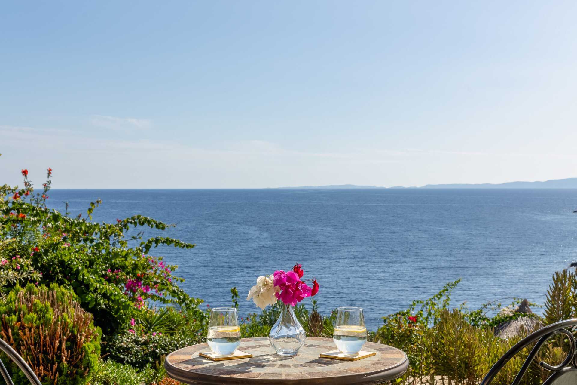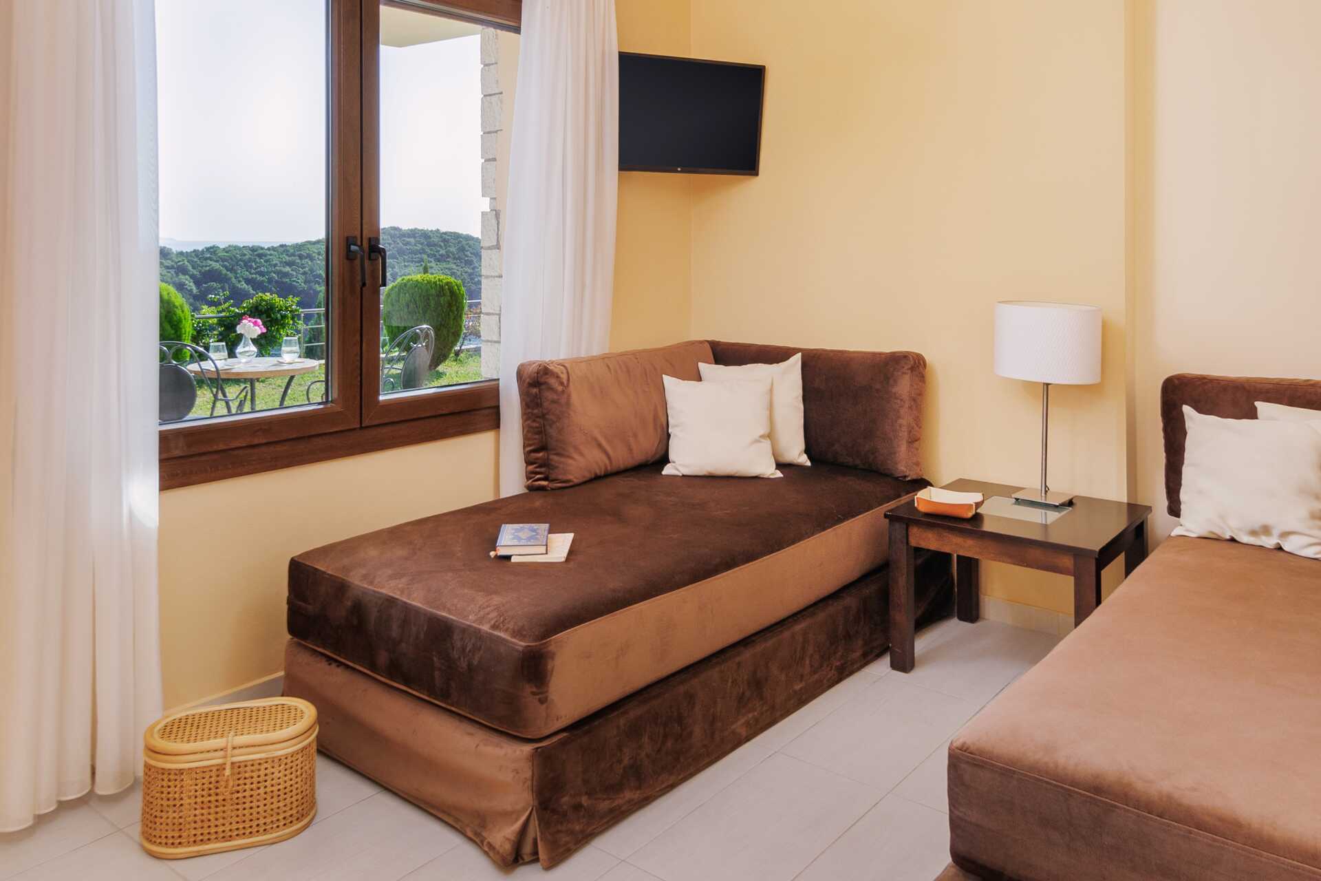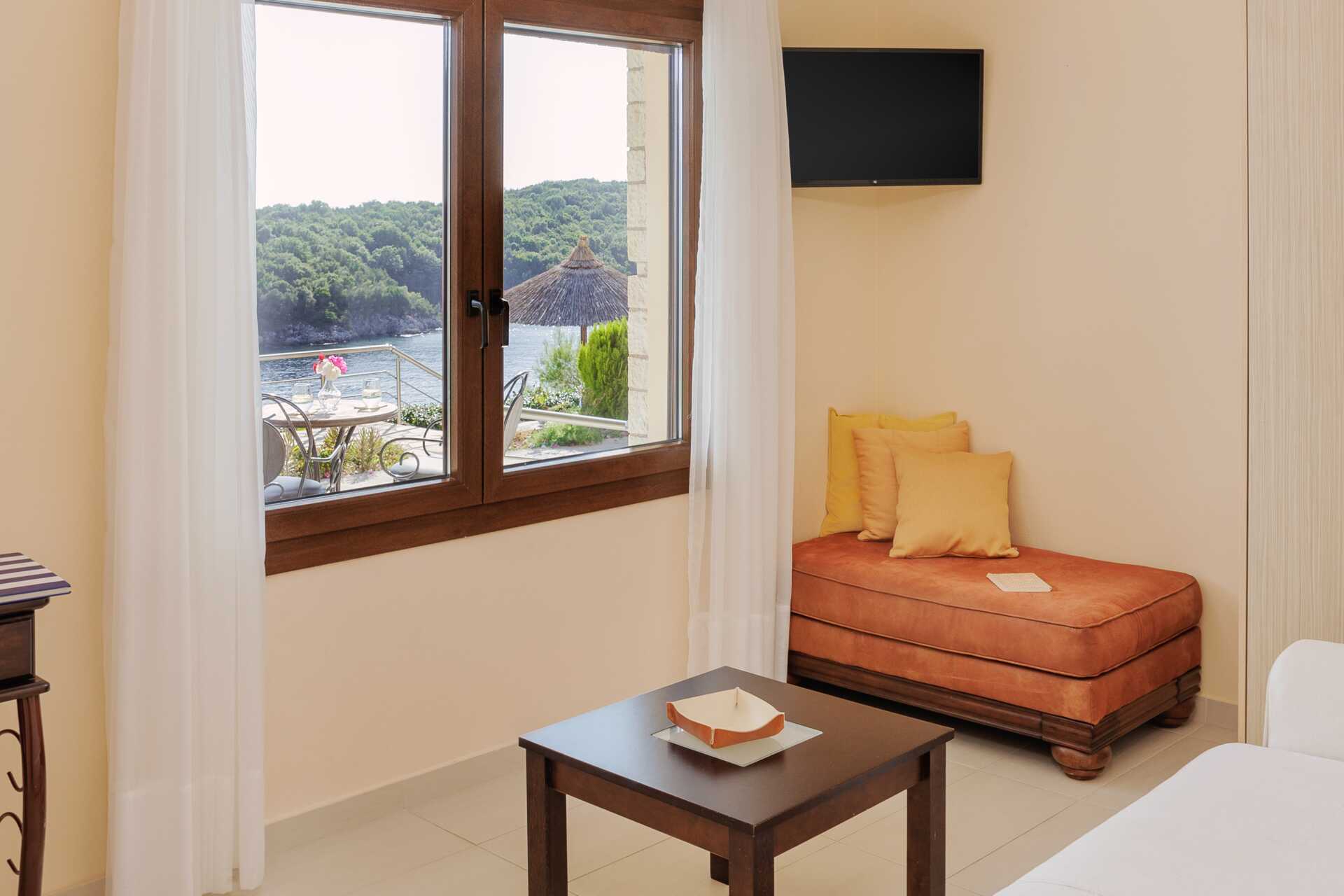Perhehuone terassilla ja merinäköalalla. Perhehuone koostuu makuuhuoneesta ja olohuoneesta. Parivuode. Lisävuodemahdollisuus vuodesohvasta. Maksuton wifi, ilmastointi ja tallelokero. Jääkaappi. Vedenkeitin. Tv paikallisilla kanavilla. Hiustenkuivain. Kylpyamme tai suihku ja wc. Siivous 7 krt/viikko.