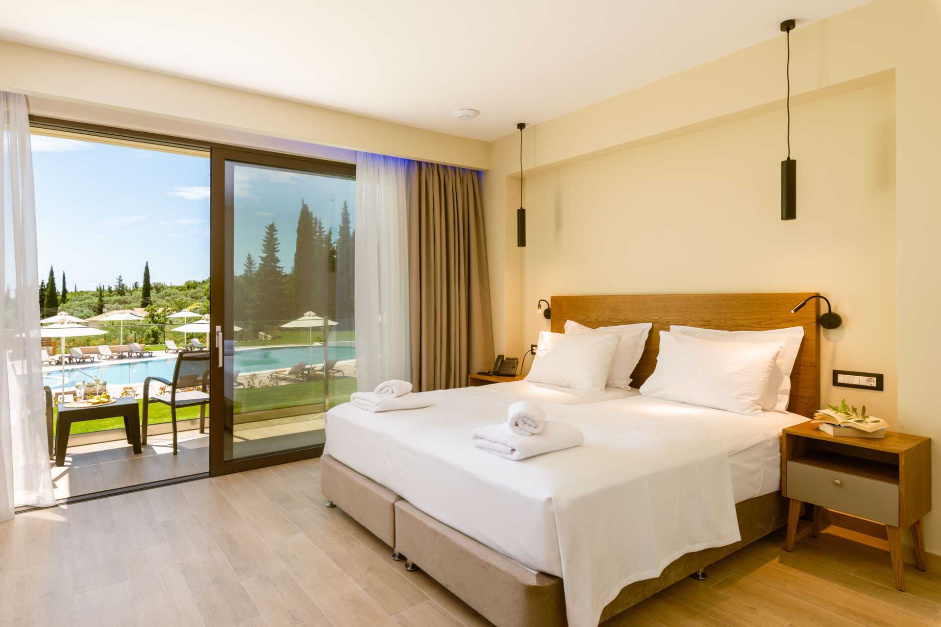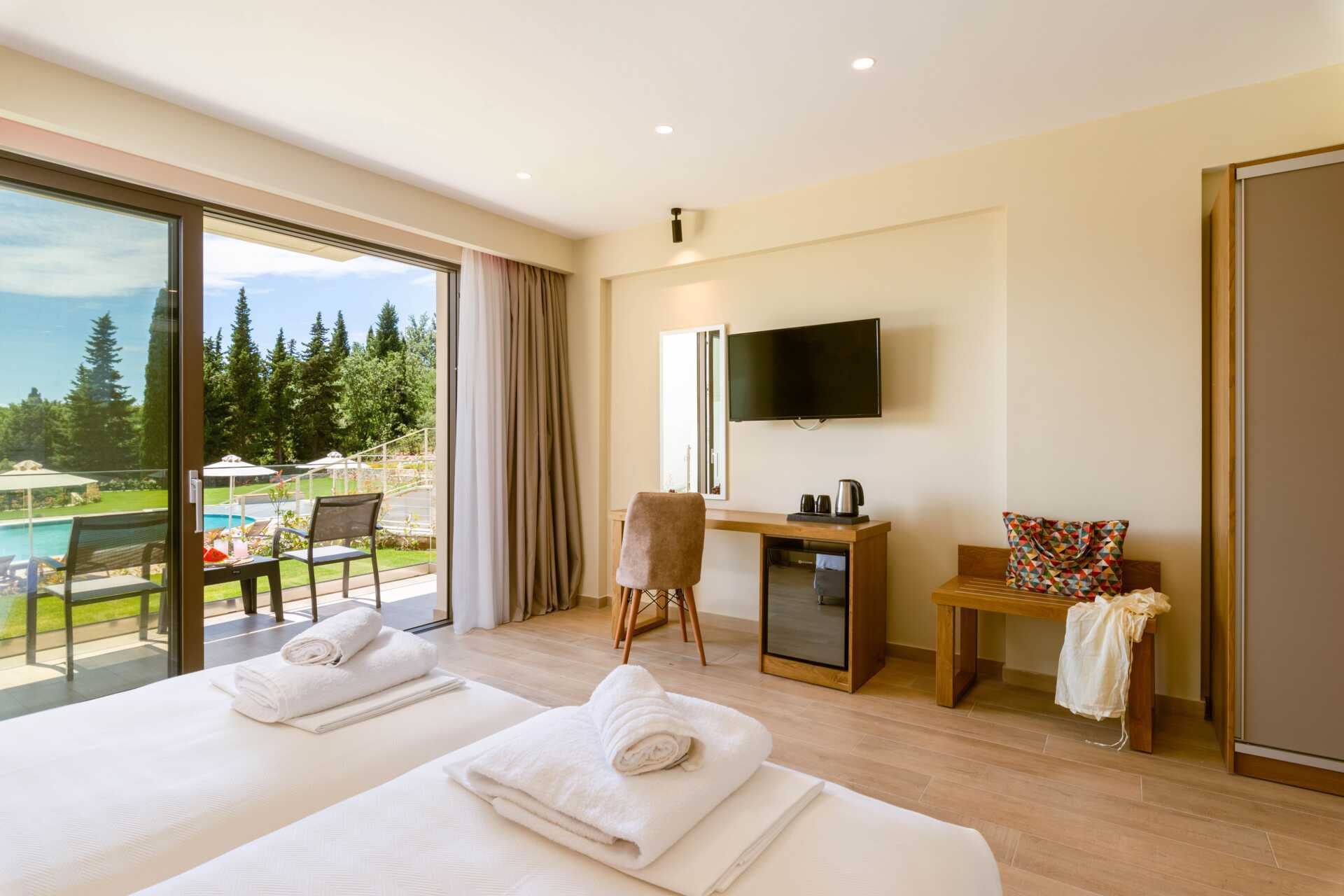 Kahden hengen huone parvekkeella. Parivuode tai kaksi yhden hengen sänkyä. Maksuton wifi, ilmastointi ja tallelokero. Jääkaappi. Vedenkeitin. Tv kansainvälisillä kanavilla. Hiustenkuivain. Suihku ja wc. Siivous 7 krt/viikko. Alle 2-vuotiaat lapset lasketaan lisävuoteella majoittuviksi henkilöiksi.
