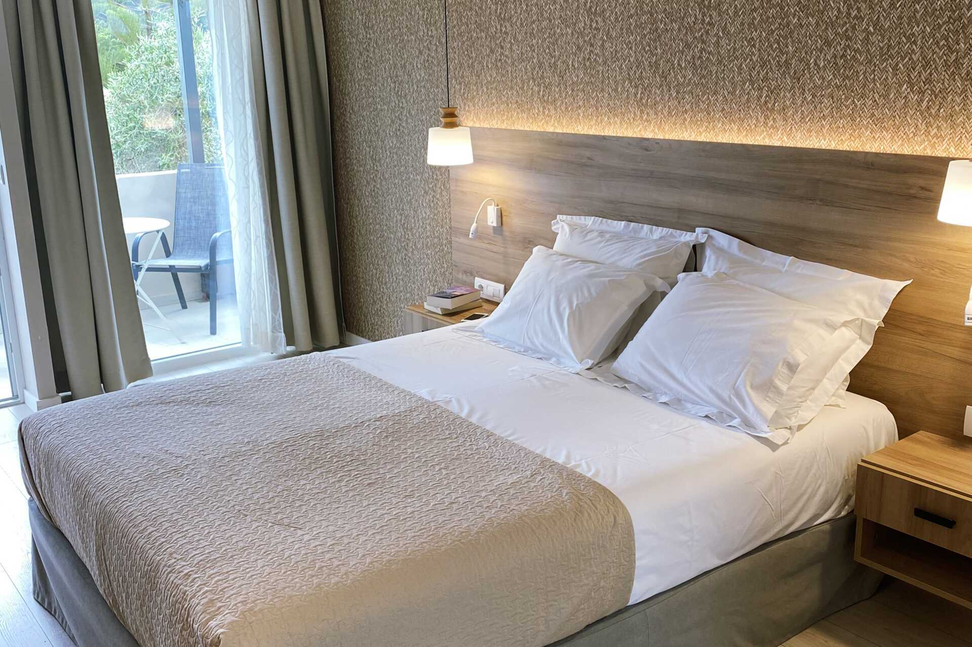Kahden hengen huone parvekkeella tai maaterassilla, joiltakin parvekkeilta on merinäköala. Parivuode. Lisävuodemahdollisuus vuodesohvasta. Wifi-yhteys voi olla hidas joissakin huoneissa, ilmastointi ja tallelokero sisältyvät hintaan. Jääkaappi. Tv kansainvälisillä kanavilla. Hiustenkuivain. Kylpyamme tai suihku ja wc. Siivous 7 krt/viikko.