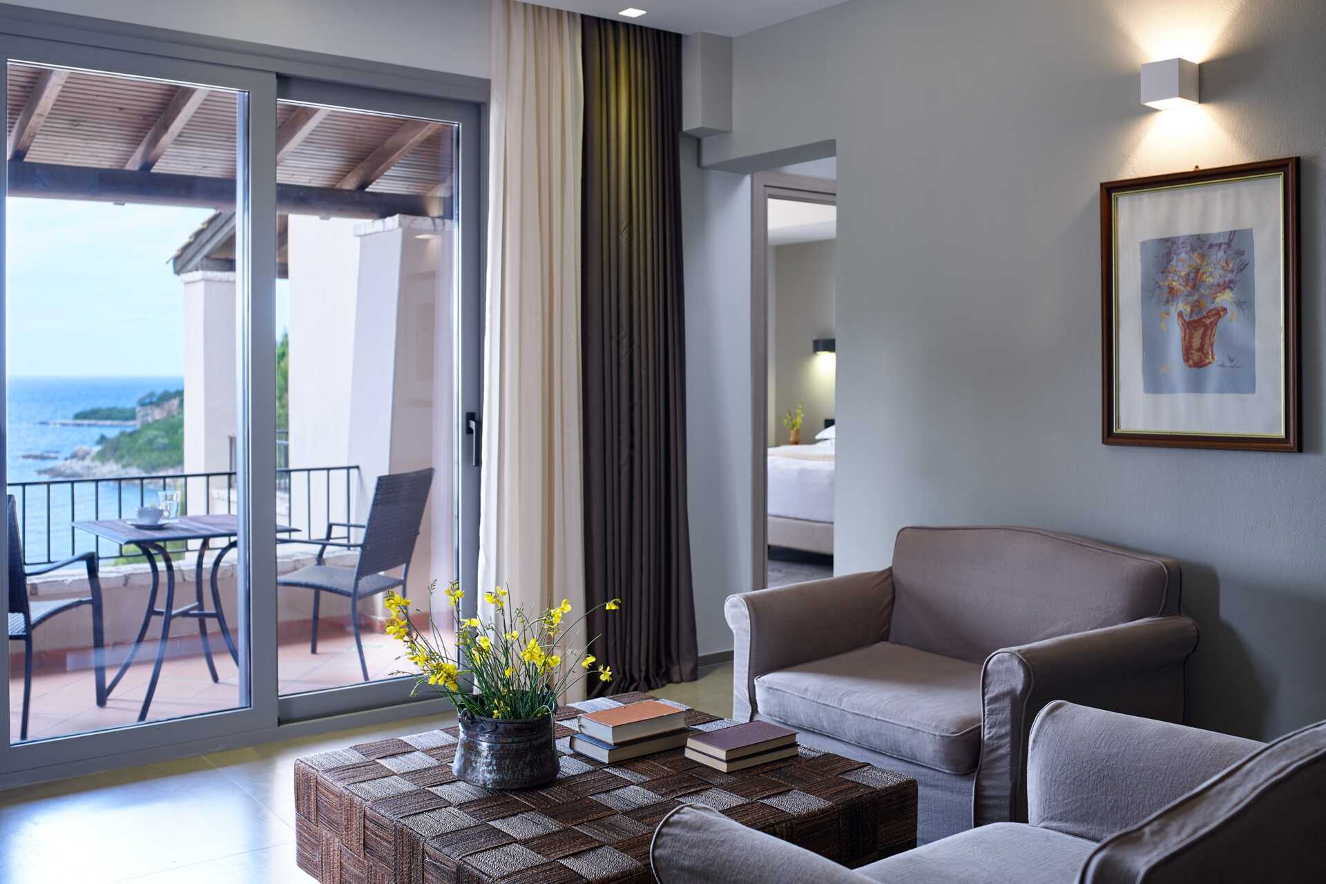Sviitti jossa parveke tai terassi, joista osasta on merinäköala. Sviitissä on makuuhuone ja olohuone, jossa on sohvia, pöytiä ja nojatuoleja. Parivuode tai kaksi yhden hengen sänkyä. Mahdollisuus lisävuoteisiin nojatuolisängyissä. Maksuton wifi, ilmastointi ja tallelokero. Jääkaappi. Vedenkeitin, kahvia ja teetä. Kahvinkeitin. Kahvinkeitin kapseleilla. Tv kansainvälisillä kanavilla. Silitysrauta ja -lauta. Kylpytakit ja tossut. Hiustenkuivain. Kylpyhuoneessa suihku ja wc. Siivous 7 krt/viikko.