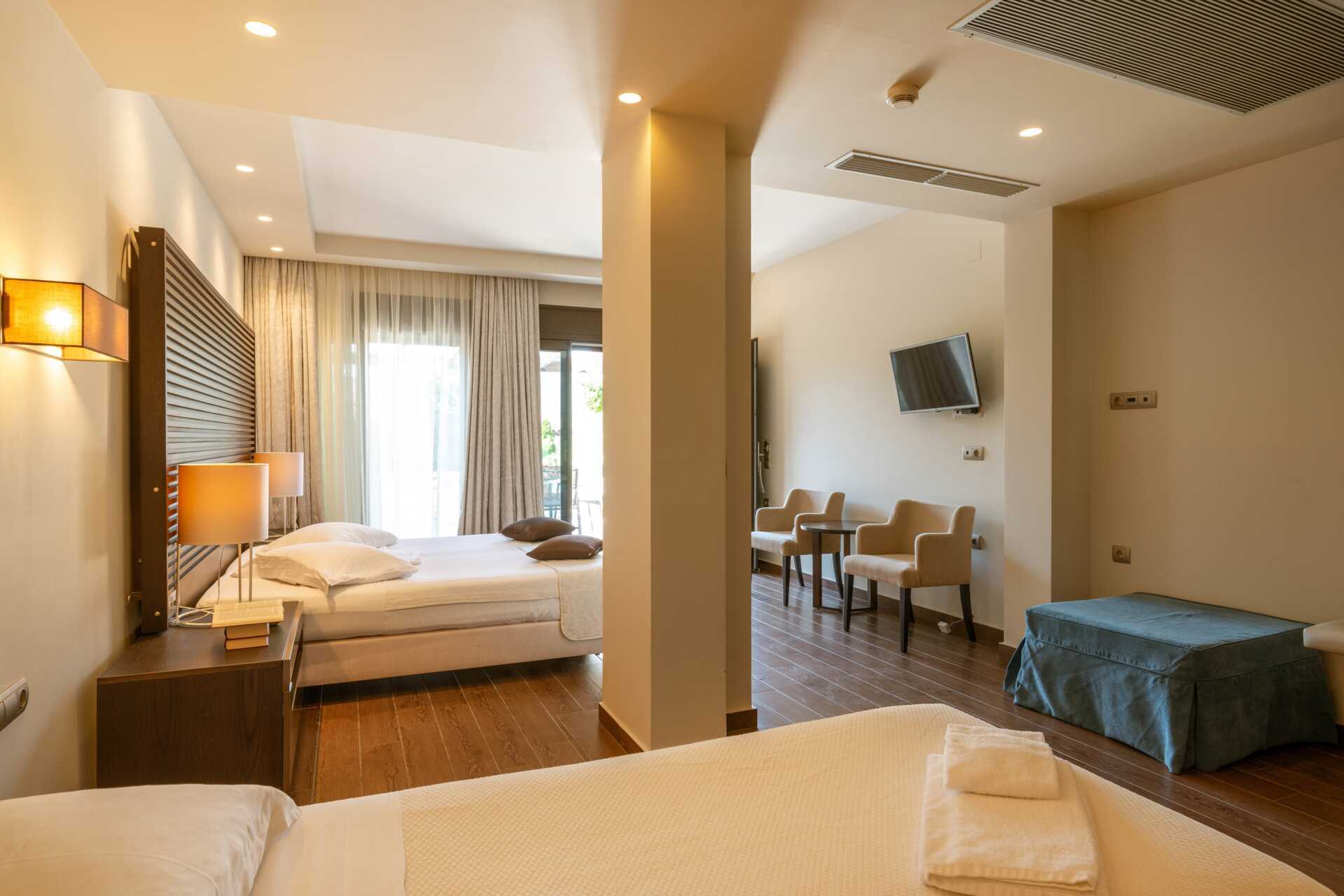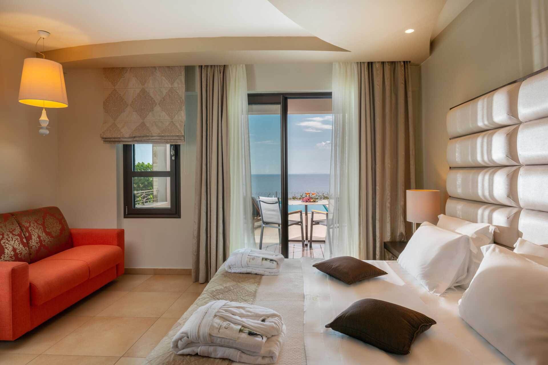 Sviitti parvekkeella ja merinäköalalla tai rajoitetulla merinäköalalla. Parivuode tai kaksi yhden hengen sänkyä. Lisävuodemahdollisuus yhden hengen sängyssä. Maksuton wifi, ilmastointi ja tallelokero. Minibaari. Tv kansainvälisillä kanavilla. Kylpytakit ja tossut. Hiustenkuivain. Kylpyhuoneessa suihku ja wc. Parveke merinäköalalla tai rajoitettu merinäköala. Siivous 7 krt/viikko.