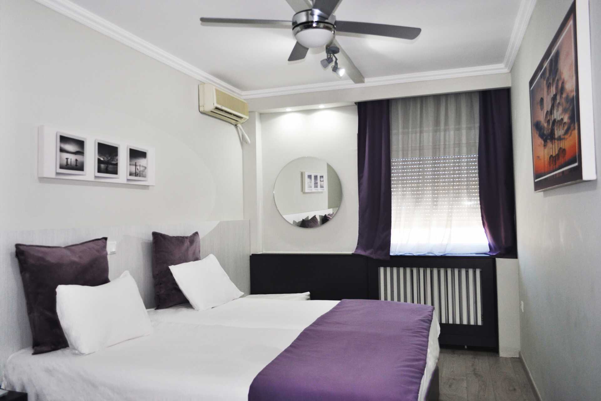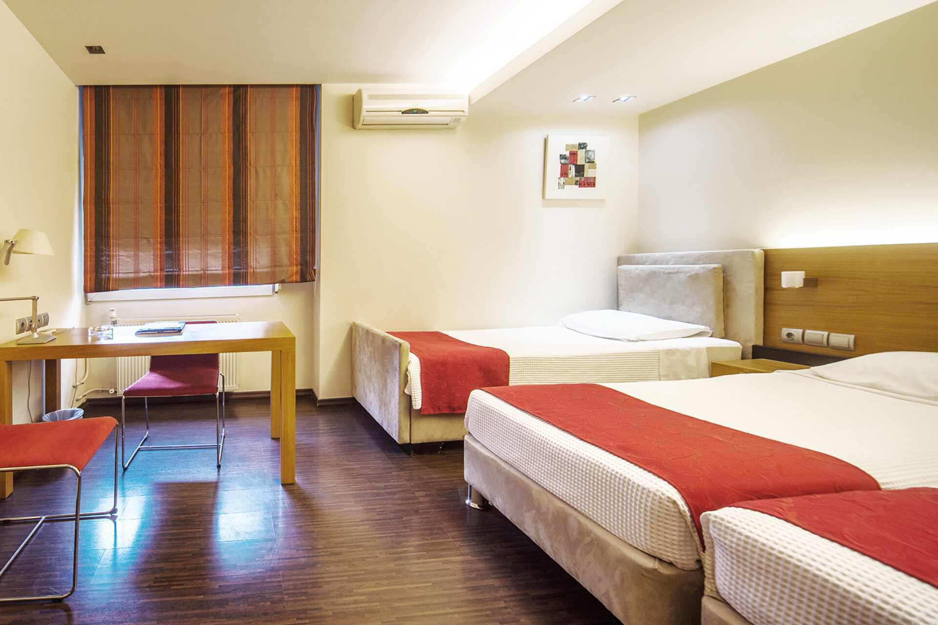 Kahden hengen huone ilman ulkotilaa. Parivuode tai kaksi yhden hengen sänkyä. Lisävuodemahdollisuus vuodesohvasta. Maksuton wifi, ilmastointi ja tallelokero. Jääkaappi. Vedenkeitin, kahvia ja teetä. Tv kansainvälisillä kanavilla. Tohvelit. Hiustenkuivain. Kylpyhuoneessa kylpyamme tai suihku ja wc. Siivous 6 krt/viikko.