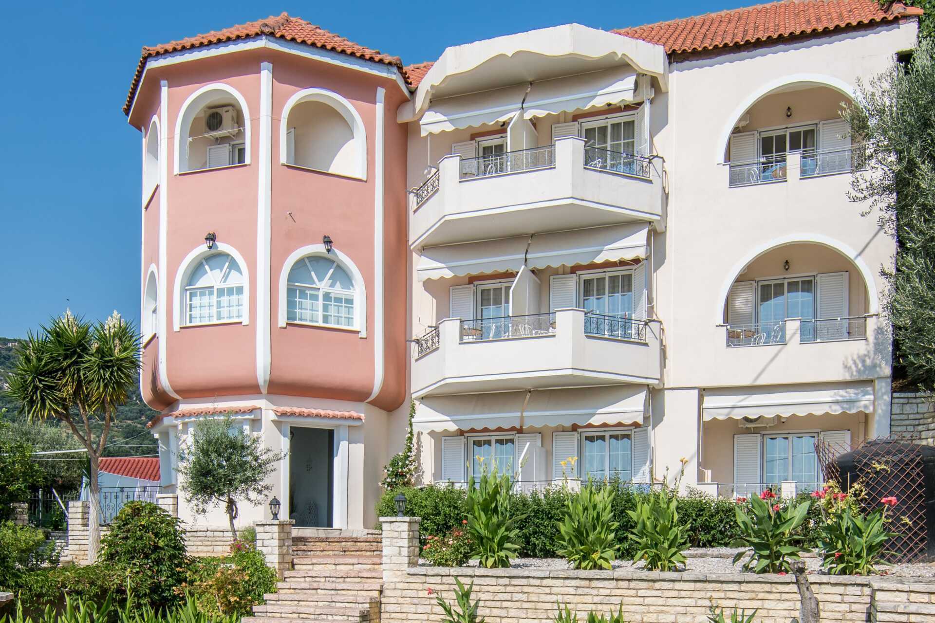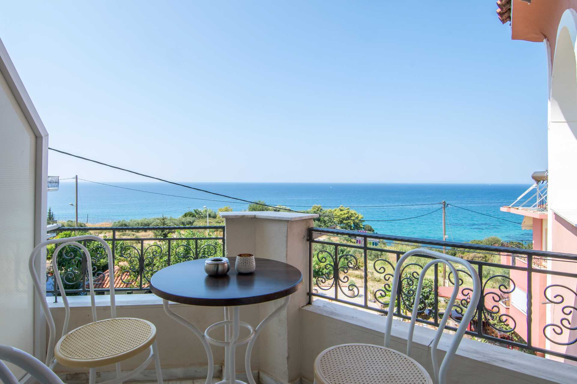 Kahden hengen huone parvekkeella ja merinäköalalla. Parivuode tai kaksi yhden hengen sänkyä. Lisävuodemahdollisuus yhden hengen sängystä. Maksuton wifi. Ilmastointi lisämaksusta. Jääkaappi. Tv paikallisilla kanavilla. Hiustenkuivain. Kylpyhuoneessa suihku ja wc. Siivous 5 krt/viikko. Alle 2-vuotiaat lapset lasketaan lisävuoteella majoittuviksi henkilöiksi.