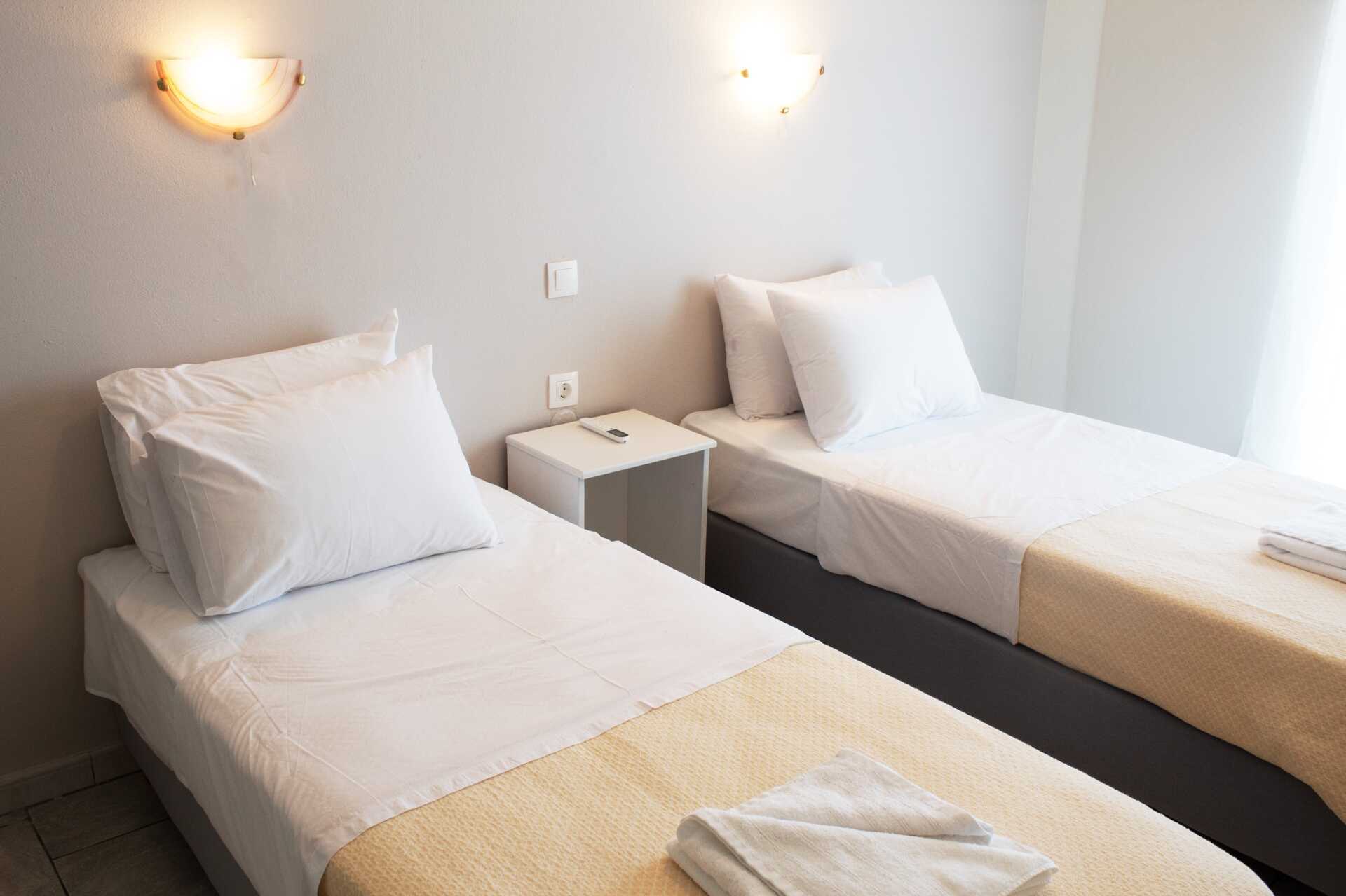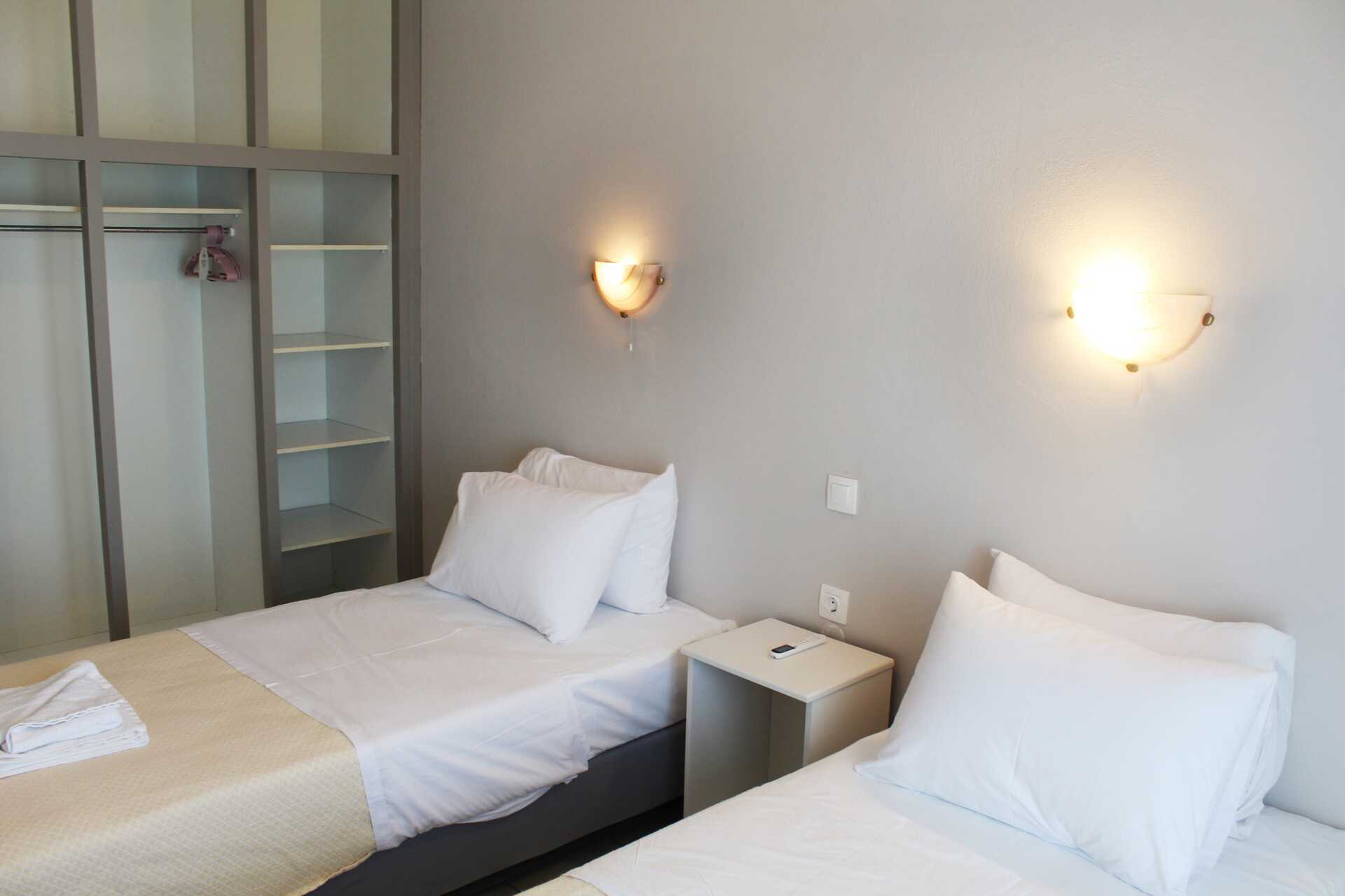 Kahden hengen huone parvekkeella, osassa merinäköala. Parivuode tai kaksi yhden hengen sänkyä. Maksuton wifi, ilmastointi ja tallelokero. Jääkaappi. Tv paikallisilla kanavilla. Kylpyhuoneessa suihku ja wc. Siivous 3 krt/viikko. Alle 2-vuotiaat lapset lasketaan lisävuoteella majoittuviksi henkilöiksi.