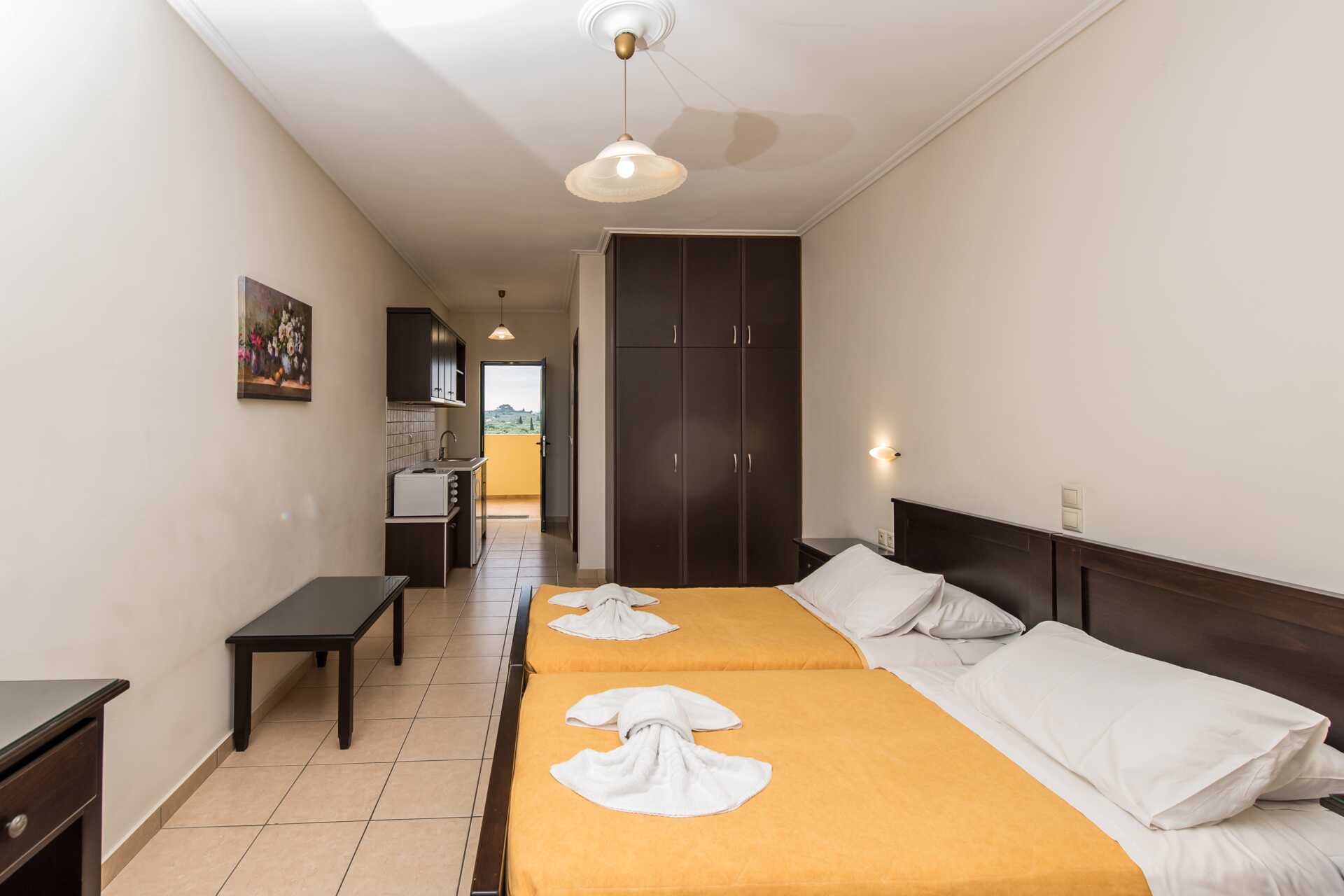 Yksiö, jossa parveke tai maaparveke, osasta näköala uima-altaalle tai maaterassi. Yhdistetty makuuhuone ja minikeittiö. Parivuode ja yhden hengen vuode. Lisävuodemahdollisuus olemassa olevista vuoteista tai kokoontaitettavasta sängystä. Minikeittiö, jossa keittolevyt ja uuni, jääkaappi, vedenkeitin, kahvinkeitin, voileipägrilli ja yksinkertainen keittiövarustus. Maksuton wifi. Ilmastointi ja tallelokero lisämaksusta. Tv kansainvälisillä kanavilla. Hiustenkuivain. Kylpyhuoneessa suihku ja wc. Siivous 3 krt/viikko. Alle 2-vuotiaat lapset lasketaan lisävuoteella majoittuviksi henkilöiksi.