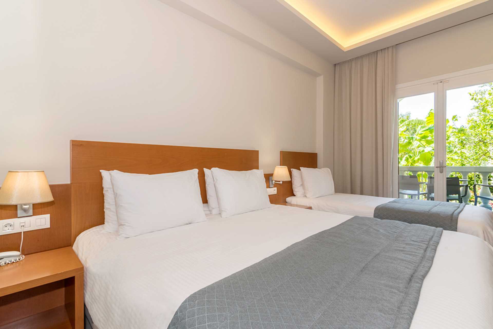 Kolmen hengen huone parvekkeella. Parivuode ja yhden hengen vuode. Maksuton wifi. Ilmastointi ja tallelokero lisämaksusta. Jääkaappi ja vedenkeitin. Tv. Hiustenkuivain. Kylpyhuoneessa suihku ja wc. Siivous 7 krt/viikko. Alle 2-vuotiaat lapset lasketaan lisävuoteella majoittuviksi henkilöiksi.