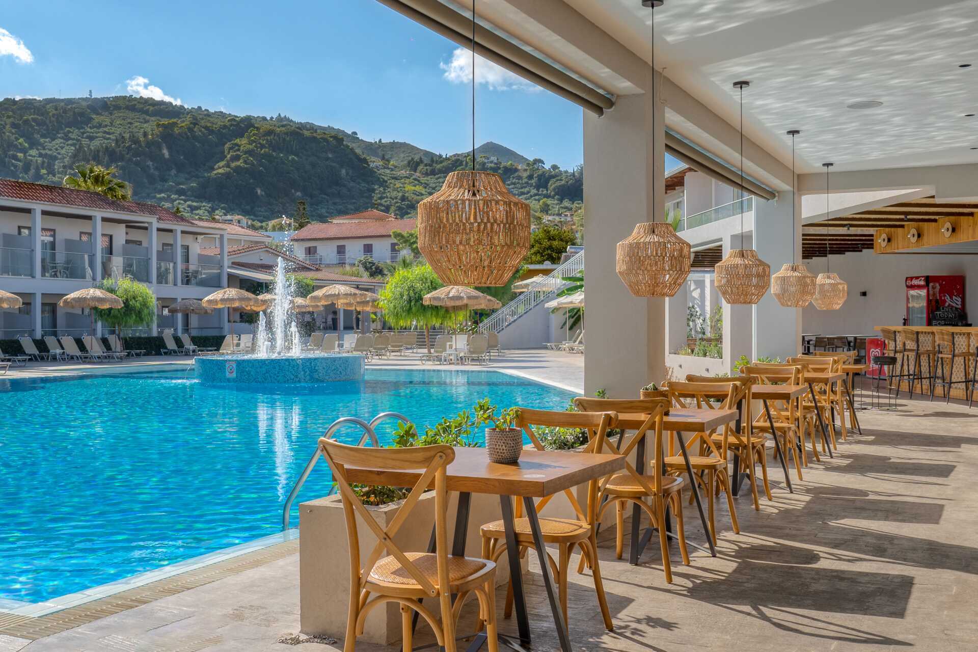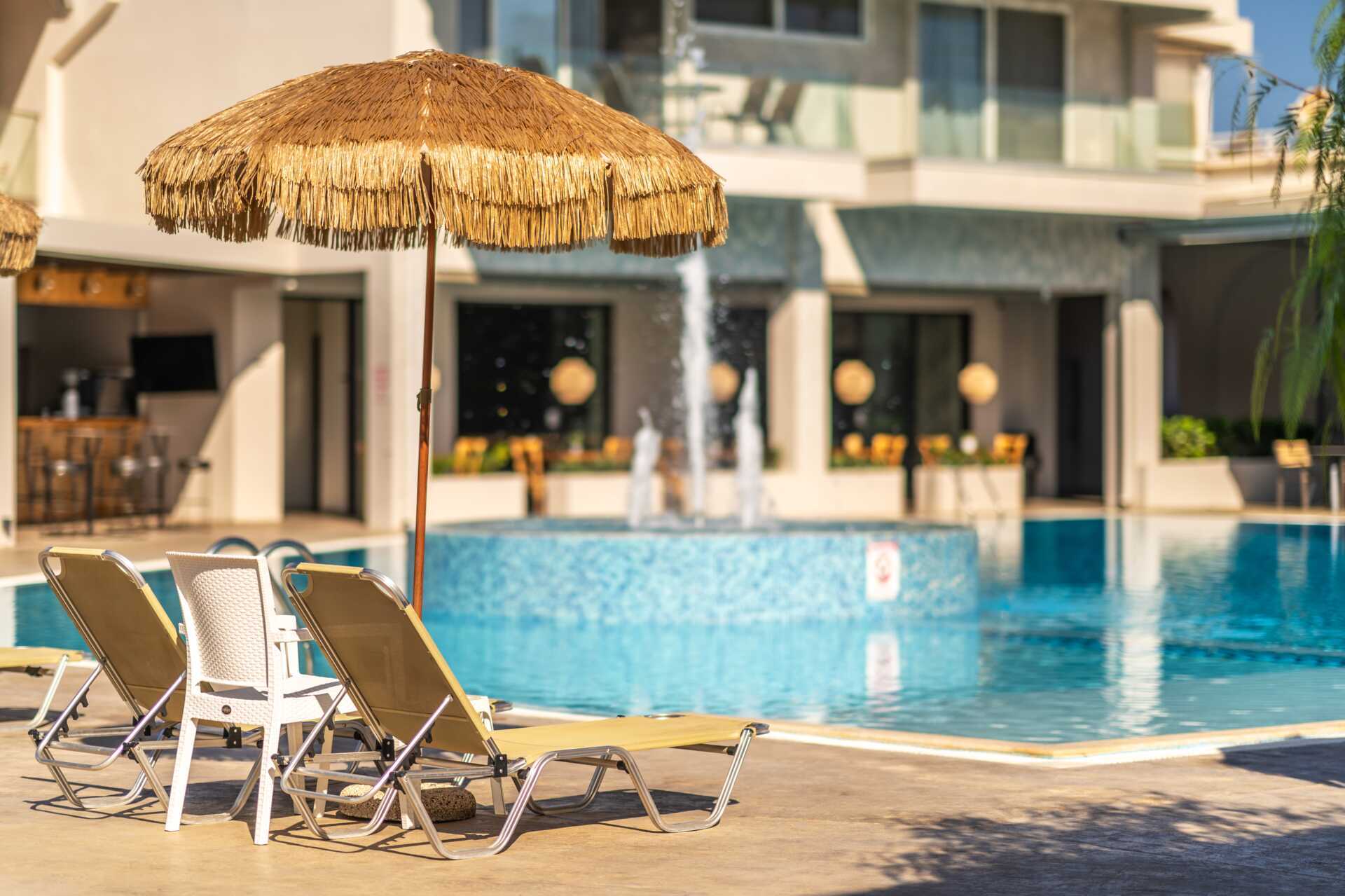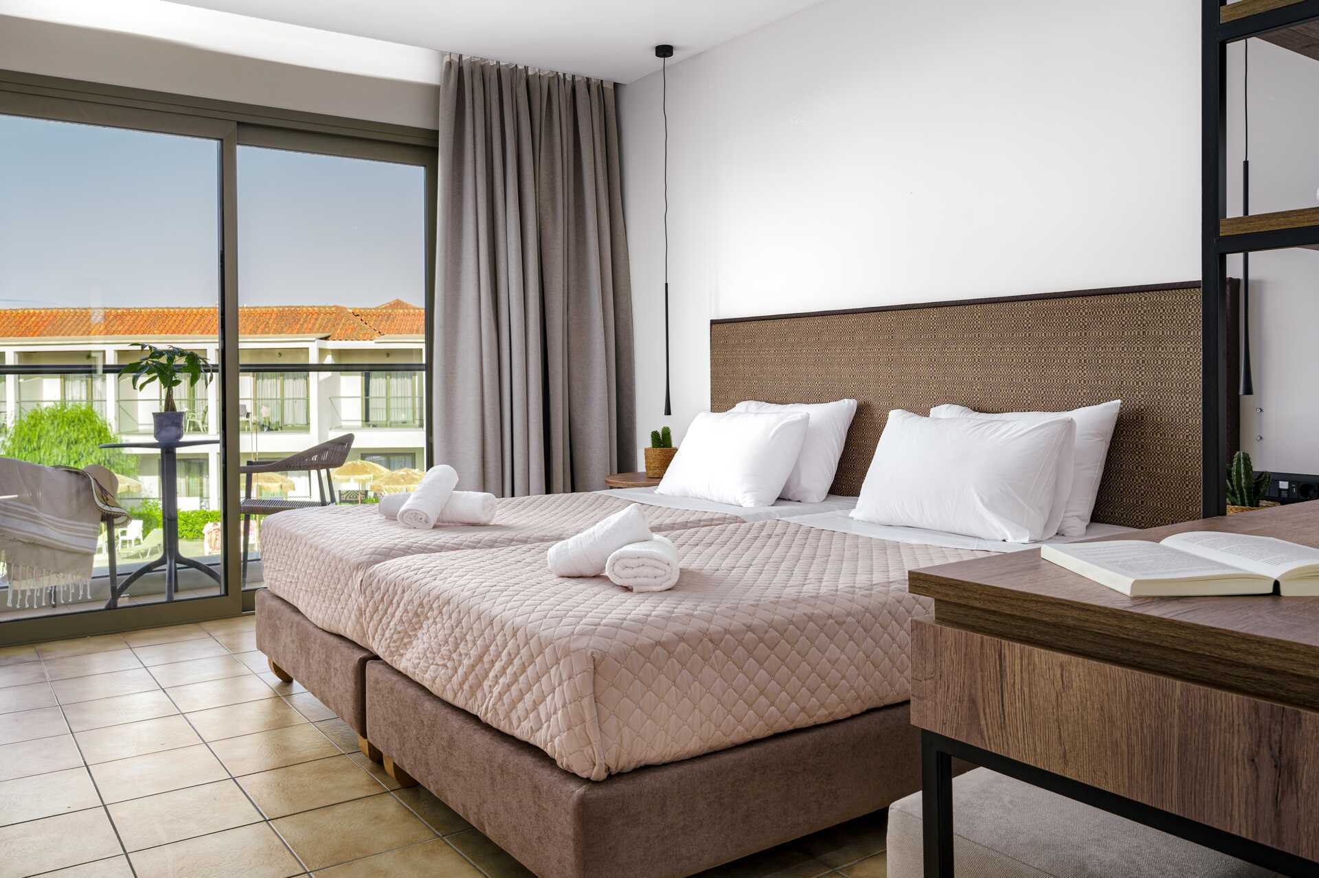 Kahden hengen huone maaparvekkeella ja allasnäköalalla. Parivuode tai kaksi yhden hengen sänkyä. Maksuton wifi, ilmastointi ja tallelokero. Jääkaappi. Vedenkeitin. Tv kansainvälisillä kanavilla. Kylpyhuoneessa suihku ja wc. Siivous 7 krt/viikko.
