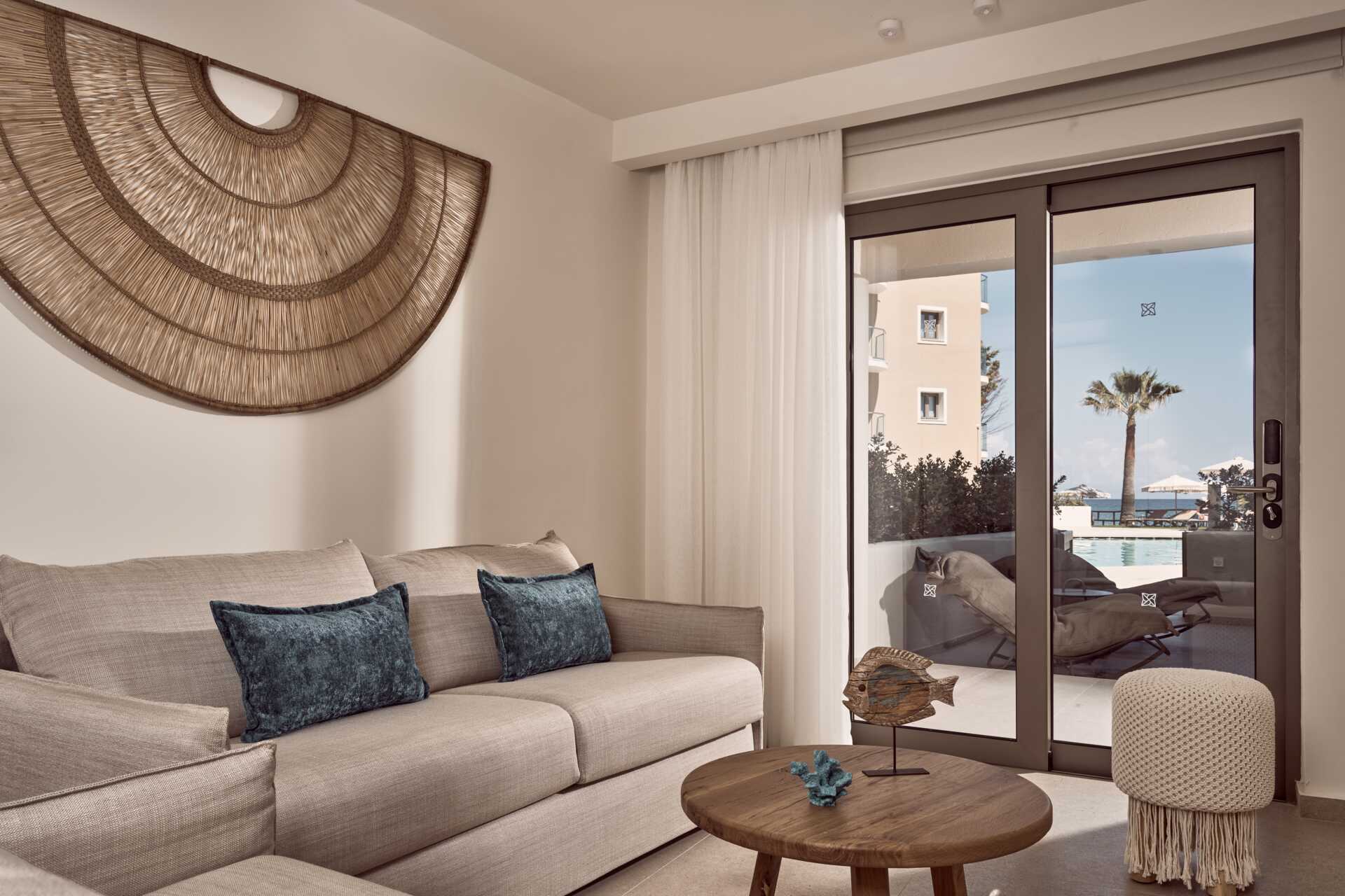 Juniorsviitti parvekkeella ja merinäköalalla. Osassa huoneita korkea kynnys parvekkeelle/parvekkeelta. Makuuhuoneosio ja olohuoneosio. Parivuode. Lisävuodemahdollisuus vuodesohvasta ja vuodenojatuolista. Maksuton wifi, ilmastointi ja tallelokero. Jääkaappi. Vedenkeitin, kahvia ja teetä. Nespresso -kahvikone. Tv kansainvälisillä kanavilla. Tossut. Hiustenkuivain. Suihku ja wc. Siivous 7 krt/viikko.
