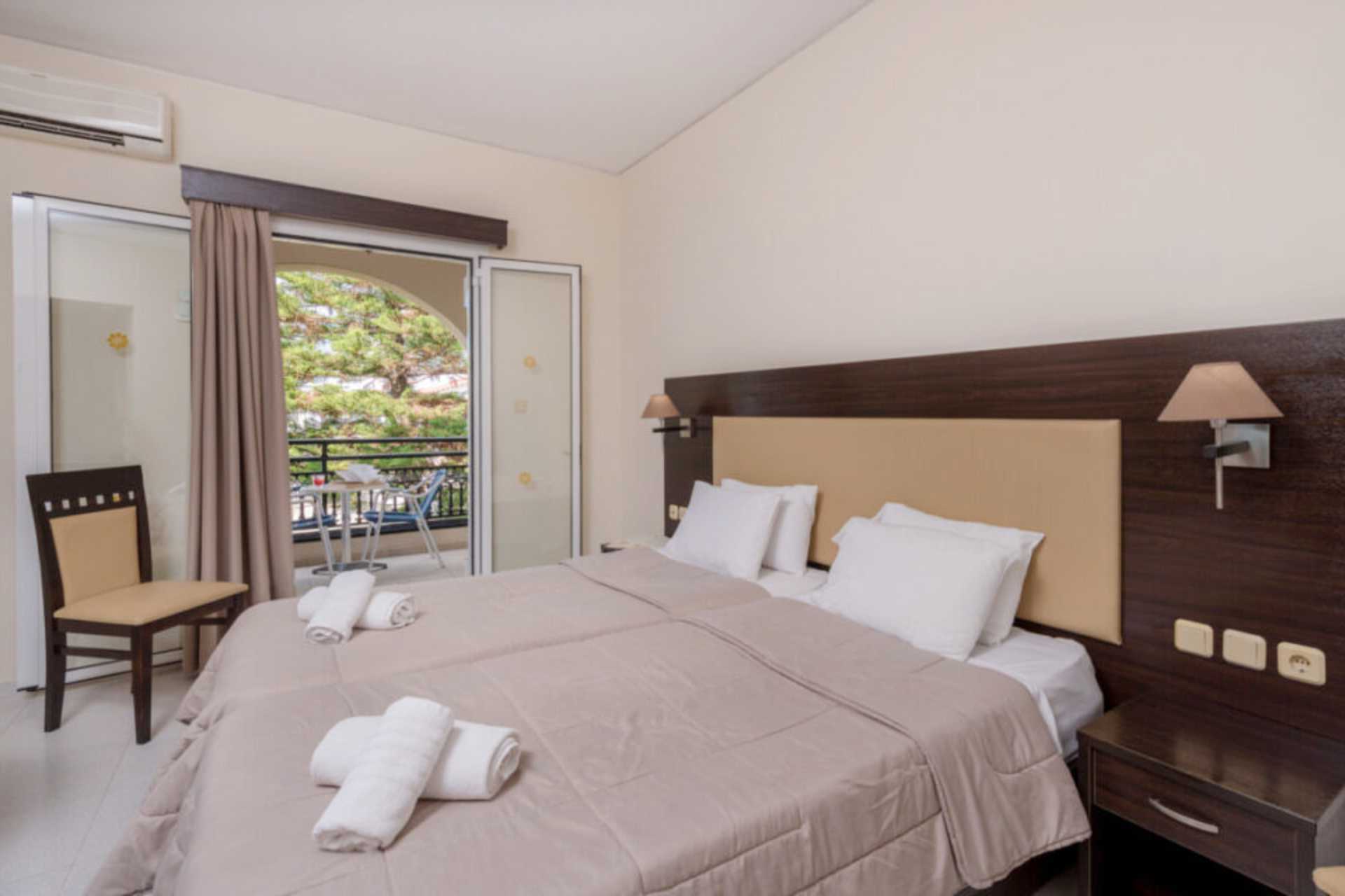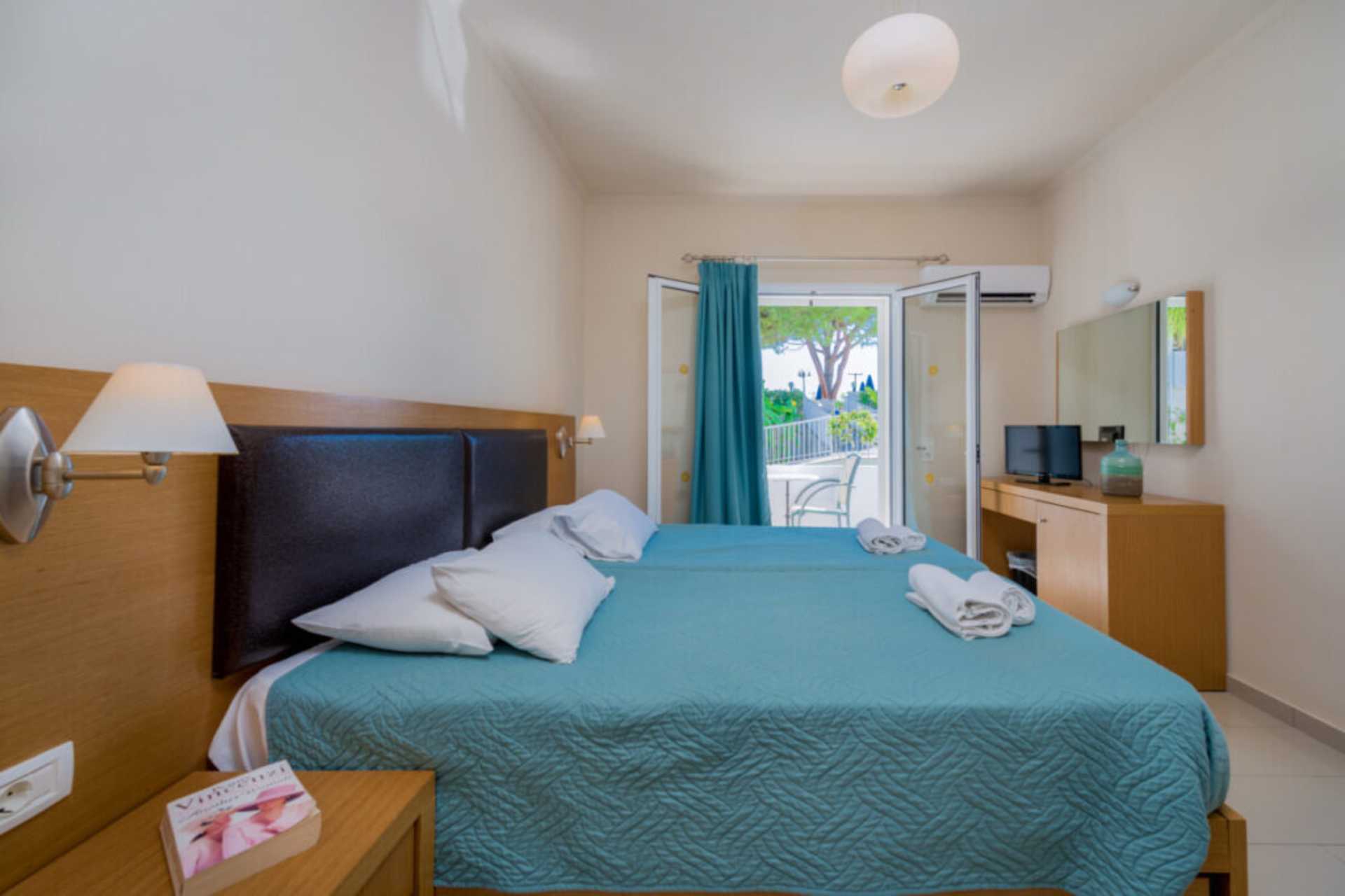 Kahden hengen huone parvekkeella tai maaparvekkeella. Parivuode tai kaksi yhden hengen sänkyä. Lisävuodemahdollisuus vuodesohvasta. Lisävuodetta käytettäessä huoneesta voi tulla ahdas. Maksuton wifi. Ilmastointi ja tallelokero lisämaksusta. Jääkaappi. Tv paikallisilla kanavilla. Hiustenkuivain. Kylpyamme tai suihku ja wc. Siivous 7 krt/viikko.