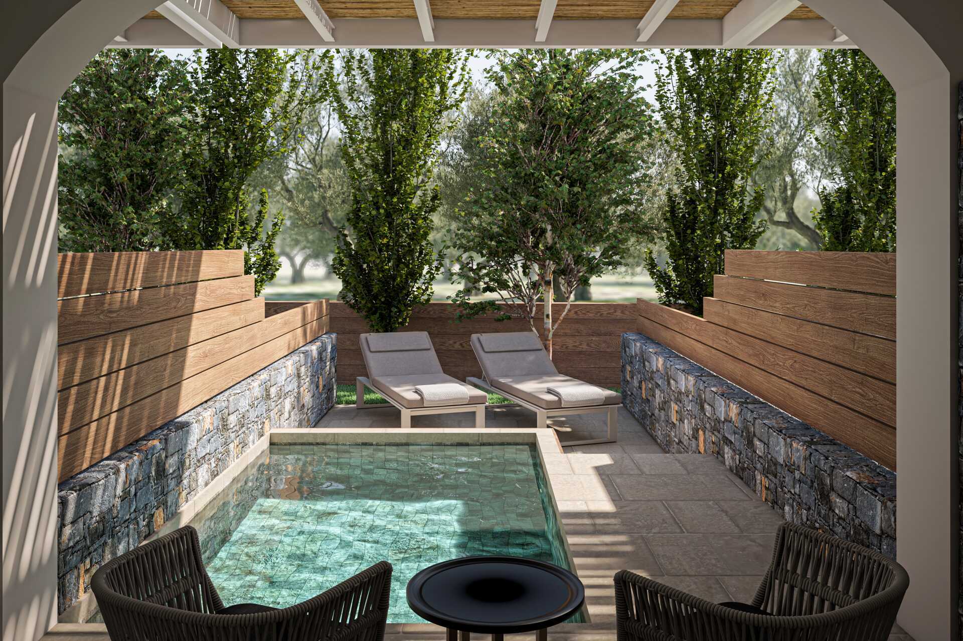 Superior-huone omalla altaalla Kaksi aurinkotuolia ja aurinkovarjo altaalla. Parivuode. Maksuton wifi, ilmastointi ja tallelokero. Jääkaappi. Vedenkeitin, kahvia ja teetä. Tv kansainvälisillä kanavilla. Kylpytakit ja tossut. Hiustenkuivain. Kylpyhuoneessa suihku ja wc. Siivous 7 krt/viikko.