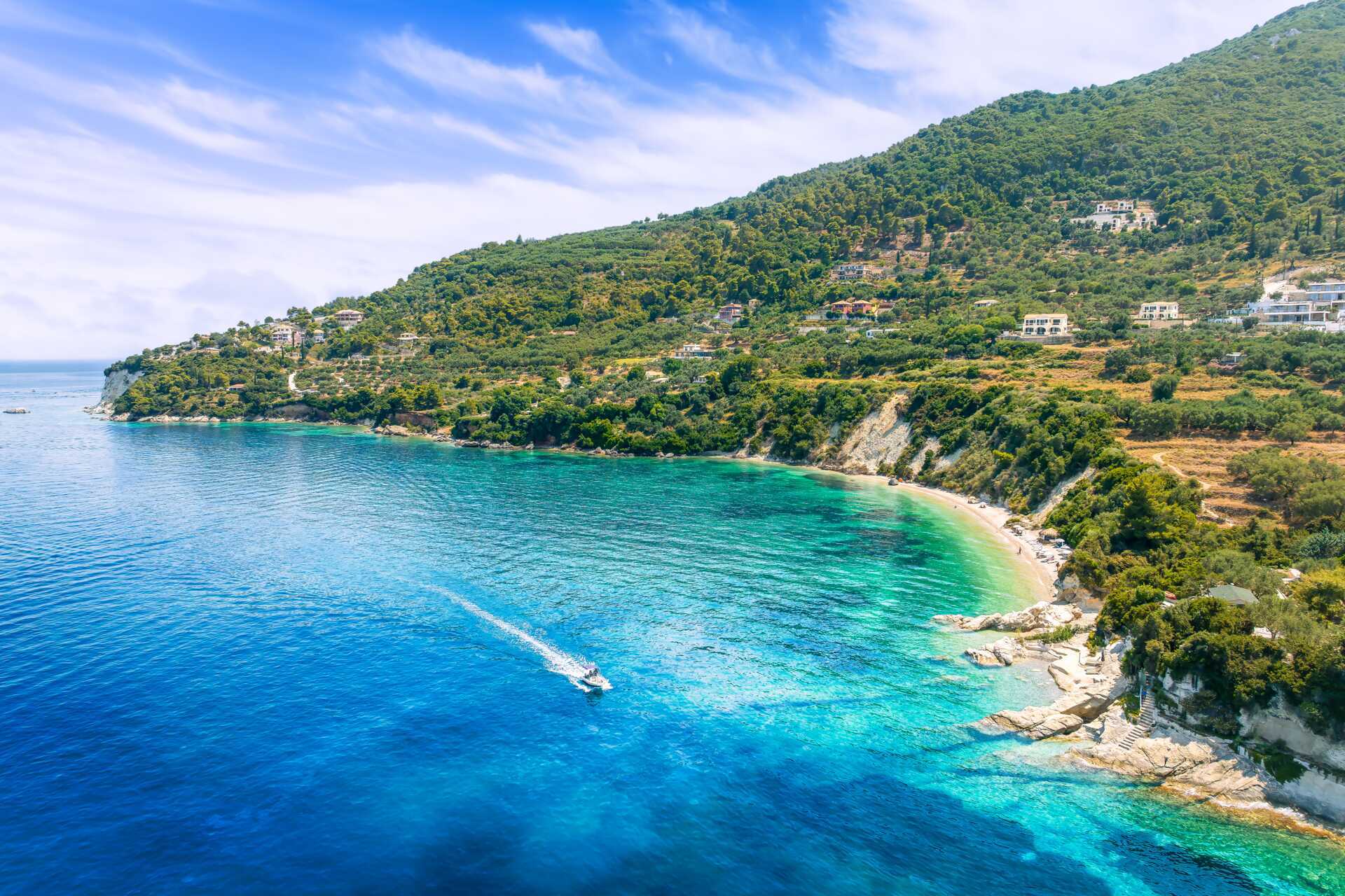 Rannikolla sijaitsee Marathias, paikka, jossa rentoutuminen on helppoa. Kirkas vesi, rantaa reunustavat kalliot ja aivan vieressä oleva luonto odottavat sinua täällä. Se on täydellinen niille, jotka haluavat rantapäiviä ilman häslinkiä, jossa keskitytään suolaisiin pulahduksiin, aurinkoon ja pitkiin, laiskoihin päiviin meren rannalla.