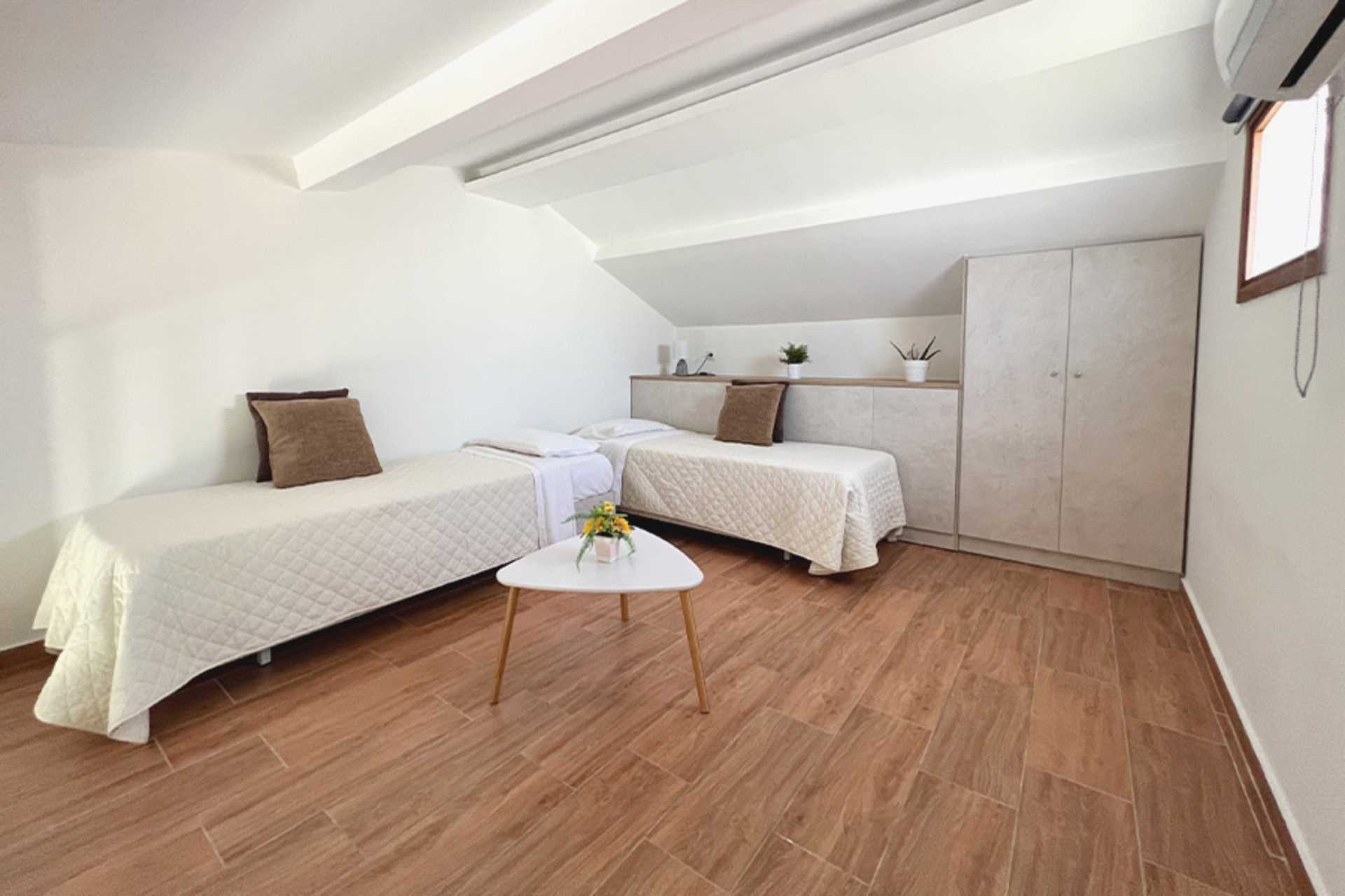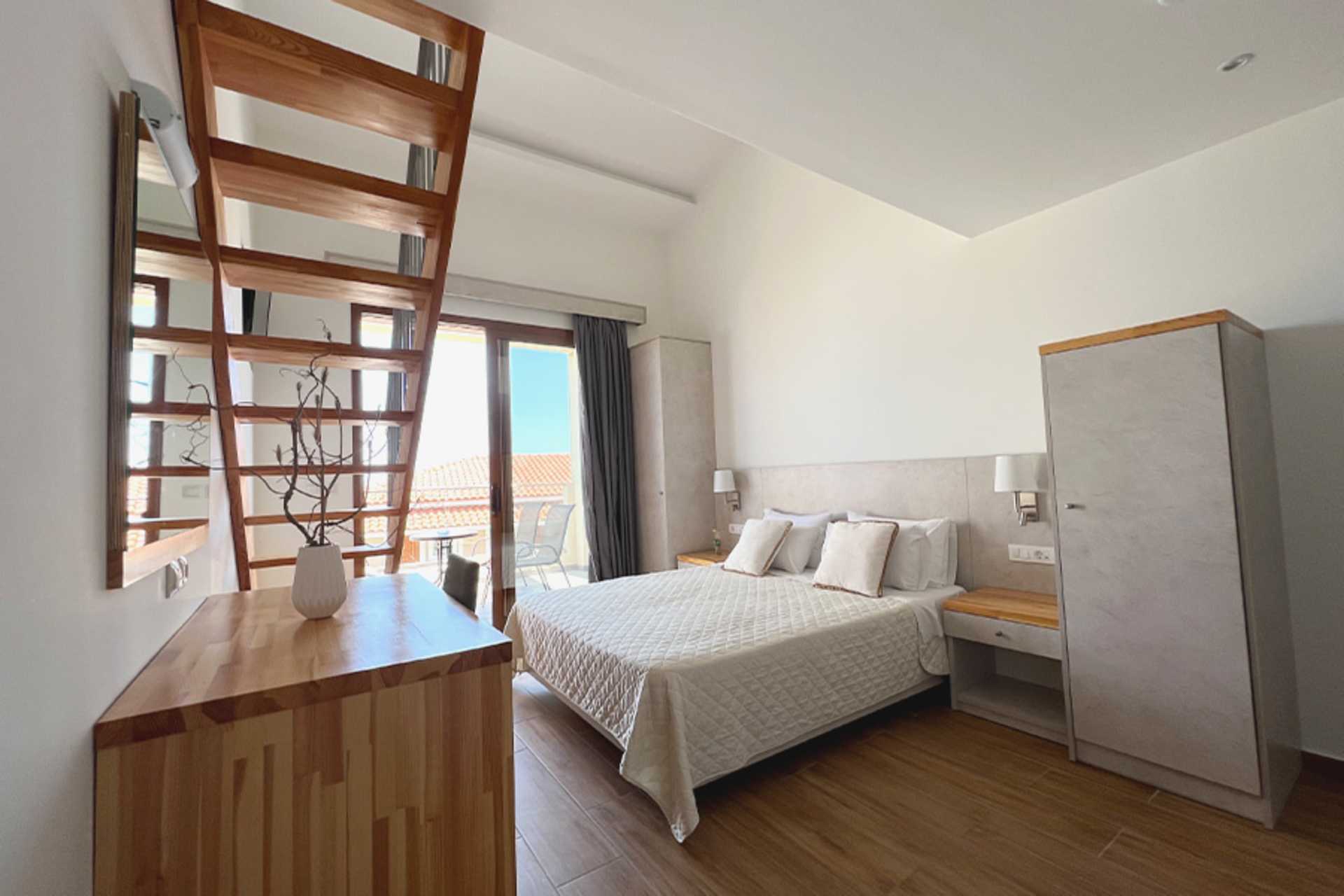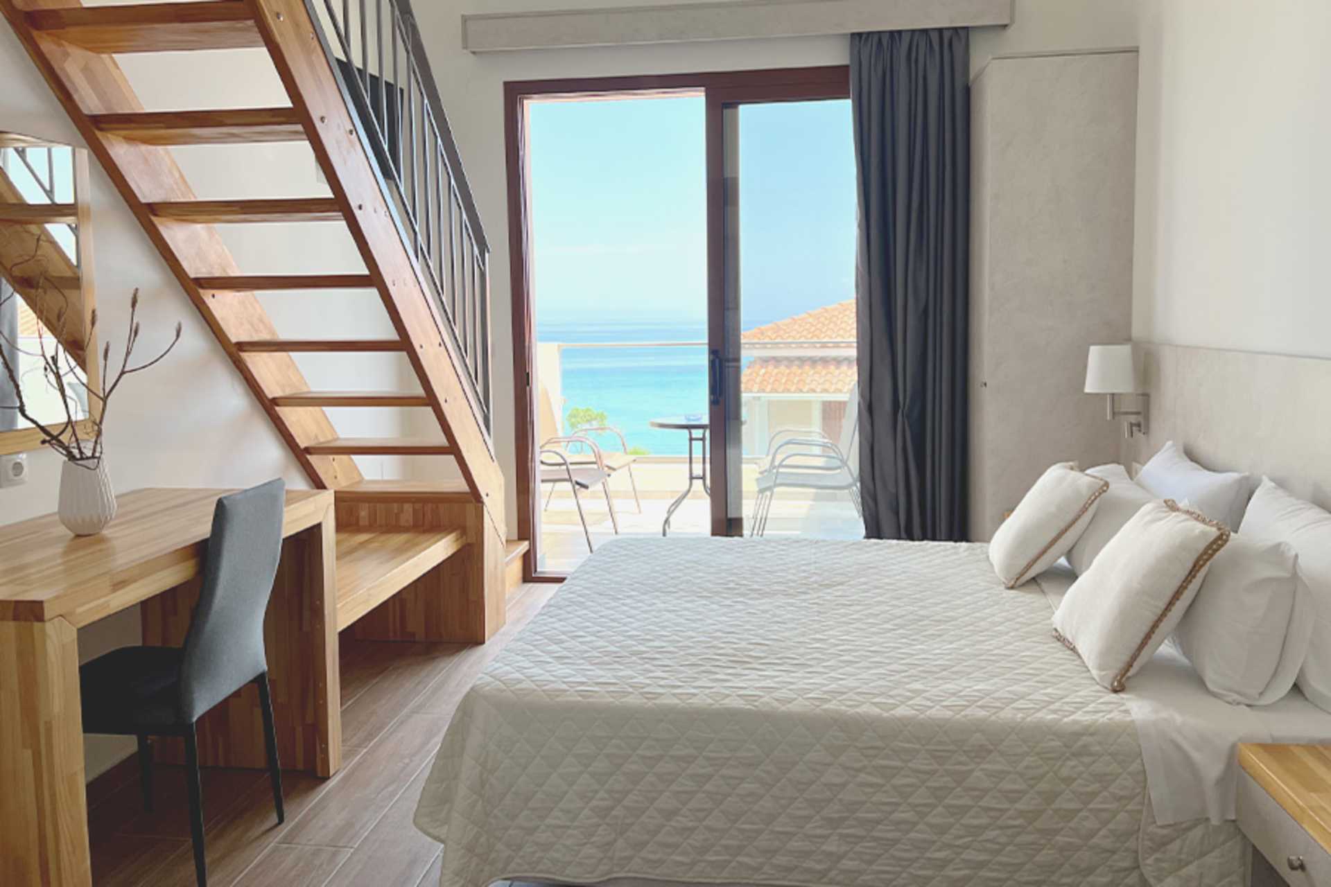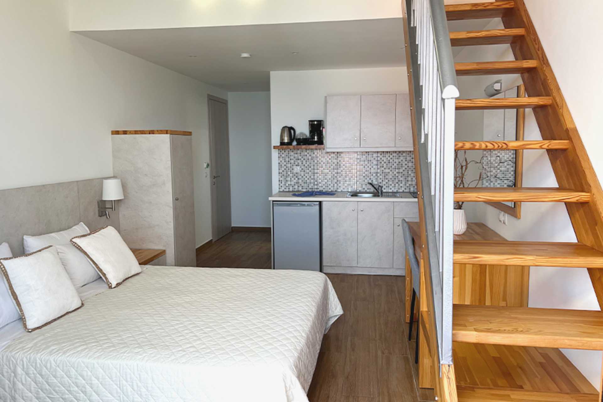 Kaksikerroksinen yksiö, parvekkeella ja rajoitetulla merinäköalalla. Sisääntulokerroksessa on yhdistetty makuuhuone ja olohuone, jossa on minikeittiö ja parveke. Parivuode. Yläkerrassa on makuuparvi, johon on mahdollista saada lisävuode yhdelle hengelle. Minikeittiö, jossa jääkaappi, keittolevyt, leivänpaahdin, kahvinkeitin, vedenkeitin ja yksinkertaiset keittiövälineet. Maksuton wifi ja tallelokero. Ilmastointi lisämaksusta. Tv kansainvälisillä kanavilla. Hiustenkuivain. Suihku ja wc. Siivous 5 krt/viikko.