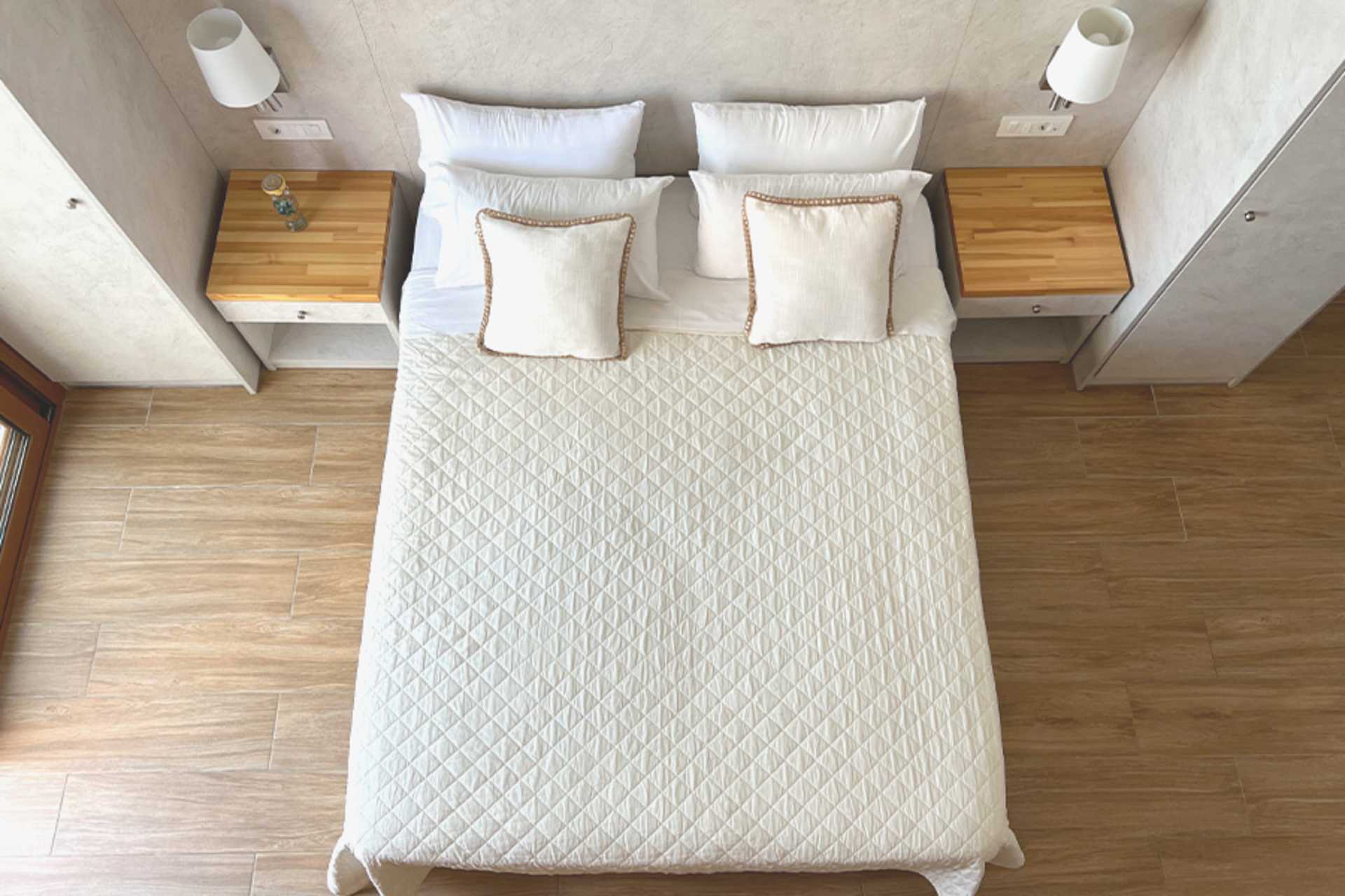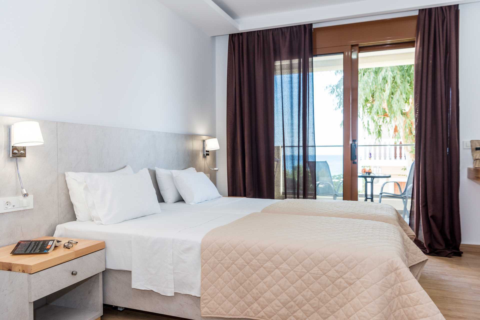 Suurempi yksiö parvekkeella tai maaparvekkeella ja merinäköalalla. Yhdistetty makuuhuone olohuoneella, jossa on minikeittiö. Parivuode tai kaksi yhden hengen sänkyä. Lisävuodemahdollisuus kokoontaitettavaan sänkyyn. Minikeittiö, jossa pieni jääkaappi, keittolevyt, leivänpaahdin, kahvinkeitin, vedenkeitin ja peruskeittiövälineet. Maksuton wifi ja tallelokero. Ilmastointi lisämaksusta. Tv kansainvälisillä kanavilla. Hiustenkuivain. Kylpyhuoneessa suihku ja wc. Siivous 5 krt/viikko.