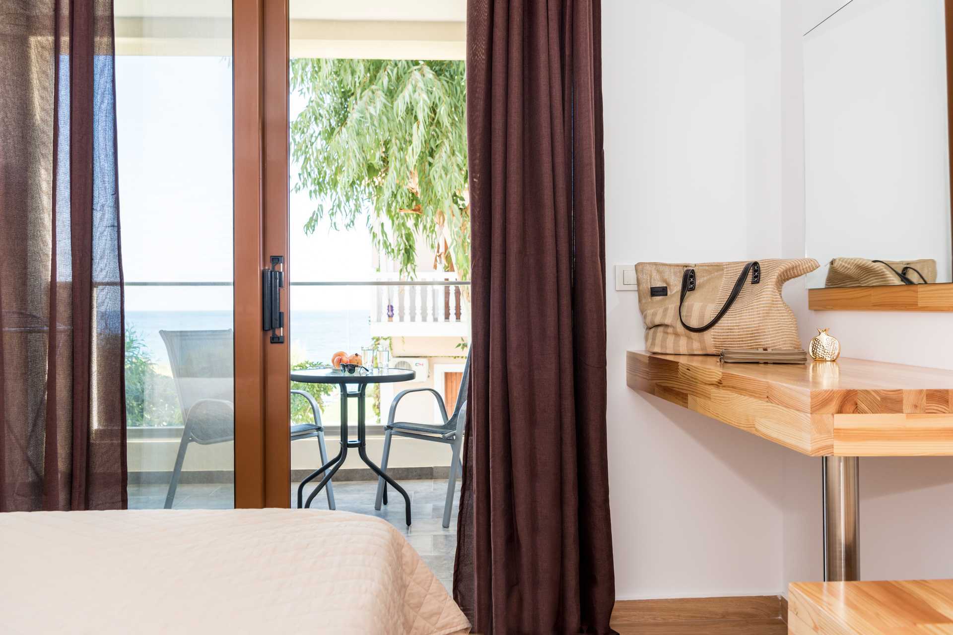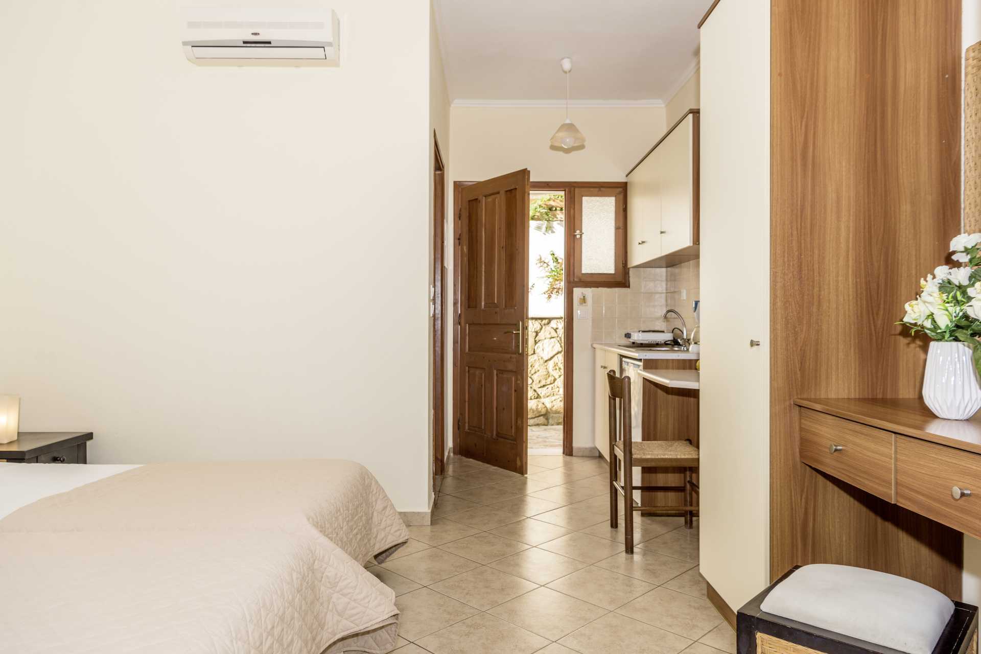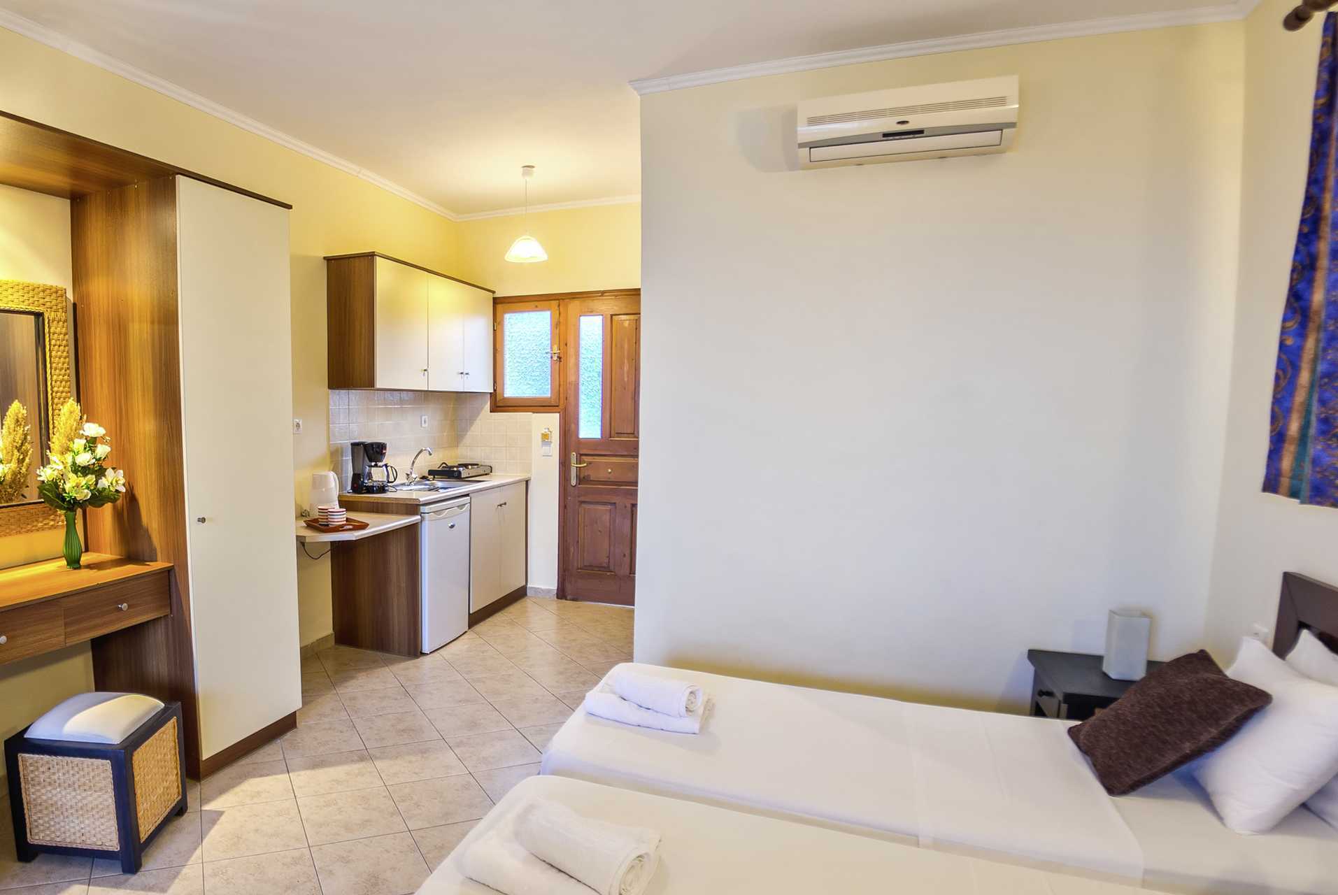 Yksiö parvekella tai maaterassilla ja merinäköalalla. Yhdistetty makuuhuone olohuoneella, jossa on minikeittiö. Parivuode tai kaksi yhden hengen sänkyä. Minikeittiö, jossa pieni jääkaappi, keittolevyt, leivänpaahdin, kahvinkeitin, vedenkeitin ja peruskeittiövälineet. Maksuton wifi ja tallelokero. Ilmastointi lisämaksusta. Tv kansainvälisillä kanavilla. Hiustenkuivain. Kylpyhuoneessa suihku ja wc. Siivous 5 krt/viikko.
