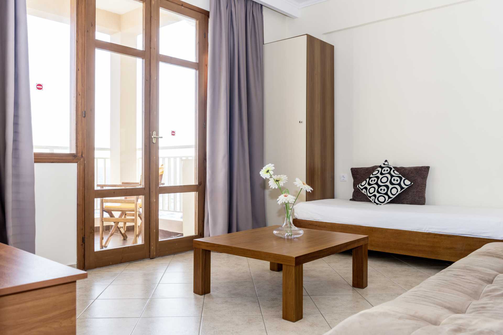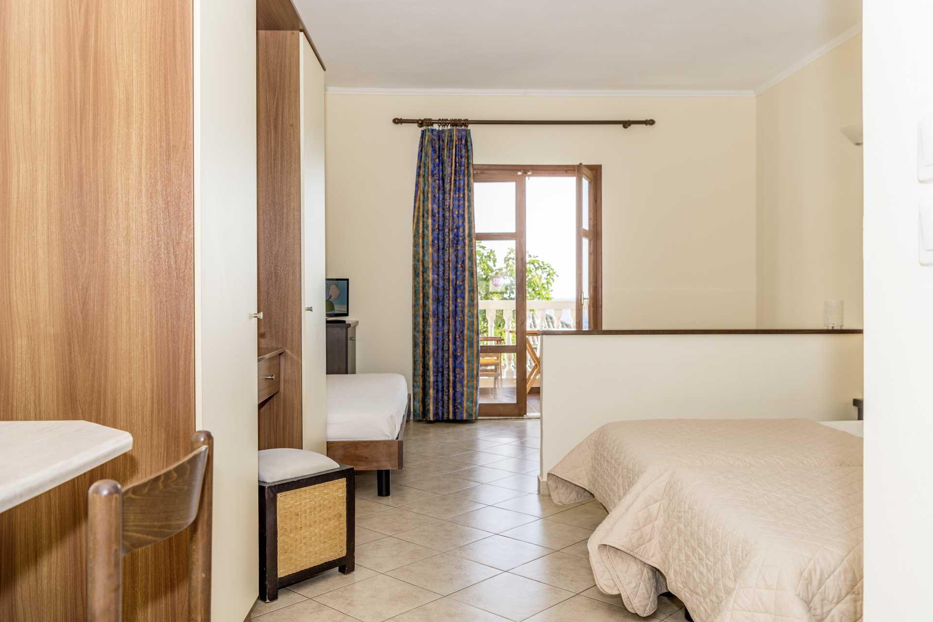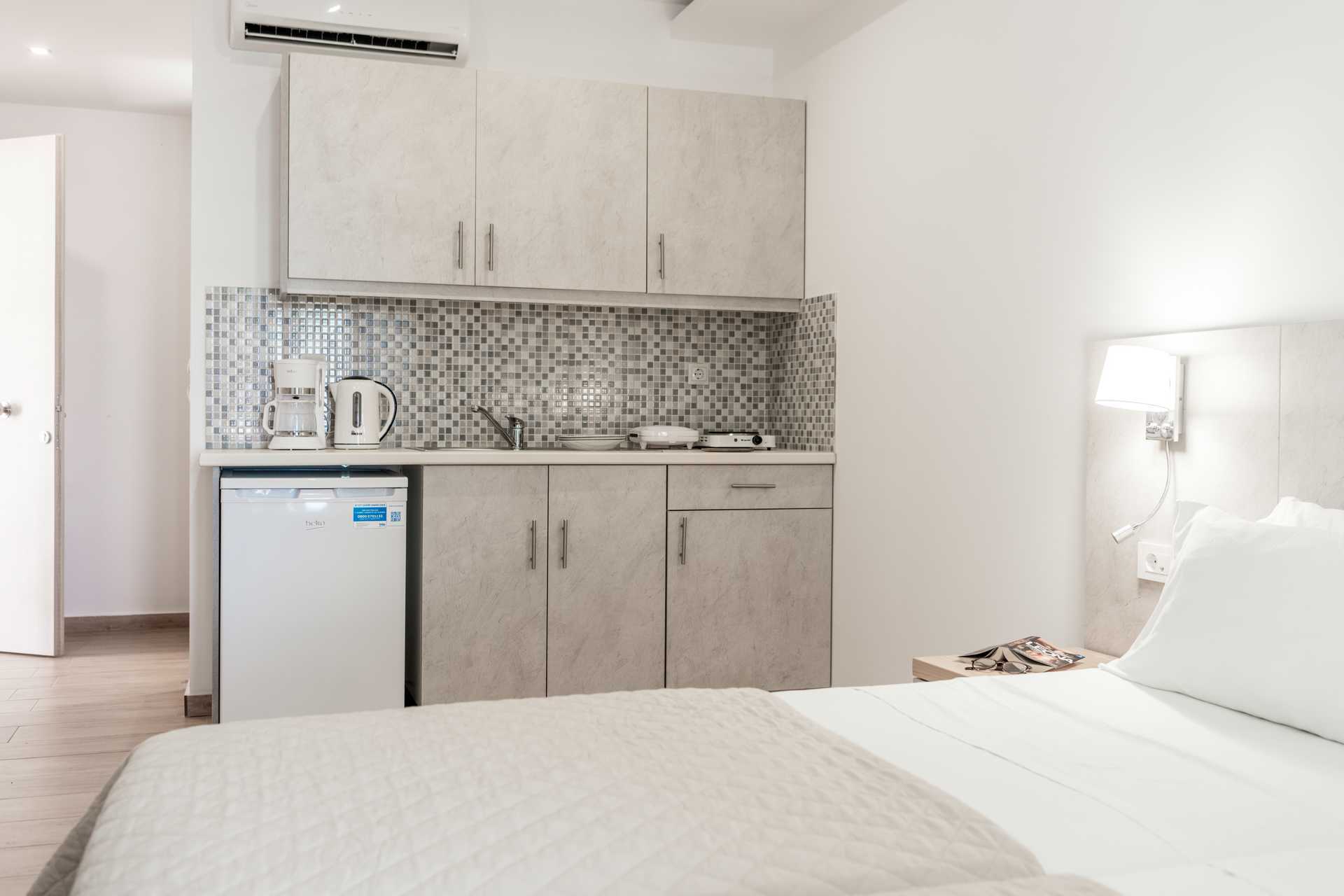 Yksiö hotellin uudemmassa osassa. Parveke rajoitetulla merinäköalalla. Yhdistetty makuuhuone olohuoneella, jossa on minikeittiö. Parivuode tai kaksi yhden hengen sänkyä. Minikeittiö, jossa jääkaappi, keittolevyt, leivänpaahdin, kahvinkeitin, vedenkeitin ja yksinkertaiset keittiövälineet. Maksuton wifi ja tallelokero. Ilmastointi lisämaksusta. Tv kansainvälisillä kanavilla. Hiustenkuivain. Suihku ja wc. Siivous 5 krt/viikko.