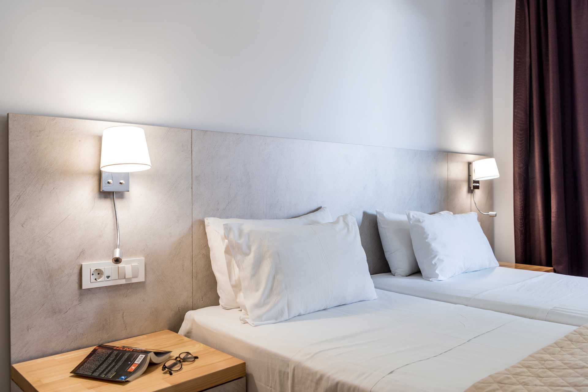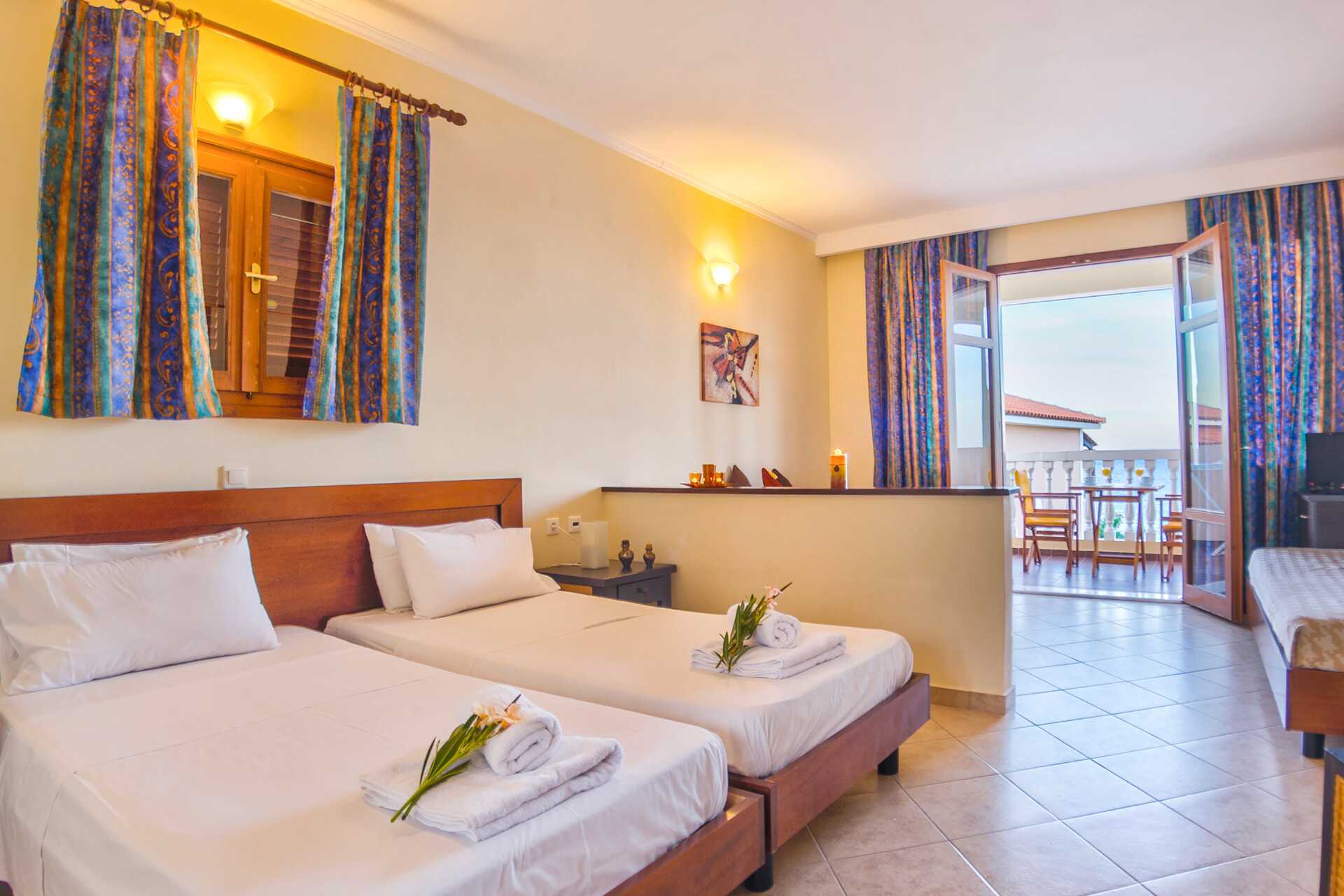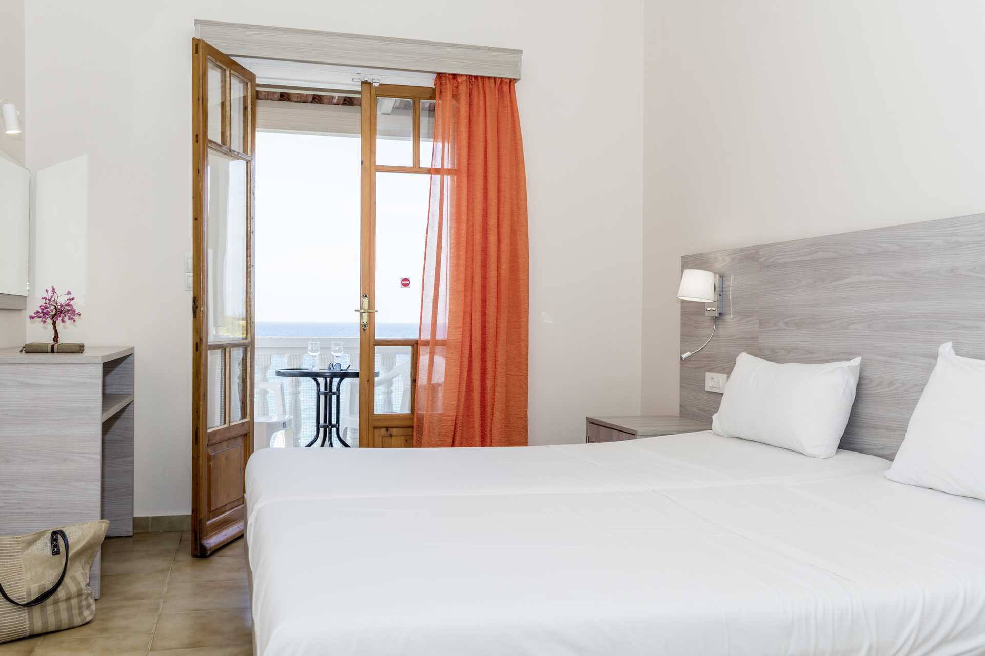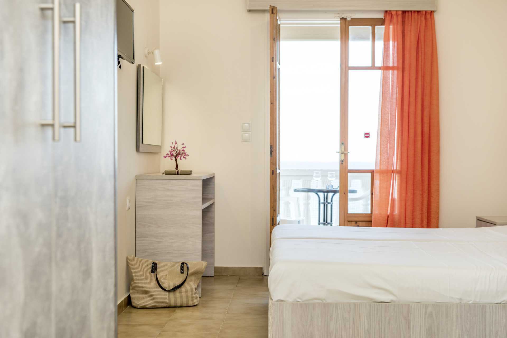 Yksiö hotellin uudemmassa osassa. Parveke rajoitetulla merinäköalalla. Yhdistetty makuuhuone olohuoneella, jossa on minikeittiö. Parivuode tai kaksi yhden hengen sänkyä. Minikeittiö, jossa jääkaappi, keittolevyt, leivänpaahdin, kahvinkeitin, vedenkeitin ja yksinkertaiset keittiövälineet. Maksuton wifi ja tallelokero. Ilmastointi lisämaksusta. Tv kansainvälisillä kanavilla. Hiustenkuivain. Suihku ja wc. Siivous 5 krt/viikko.