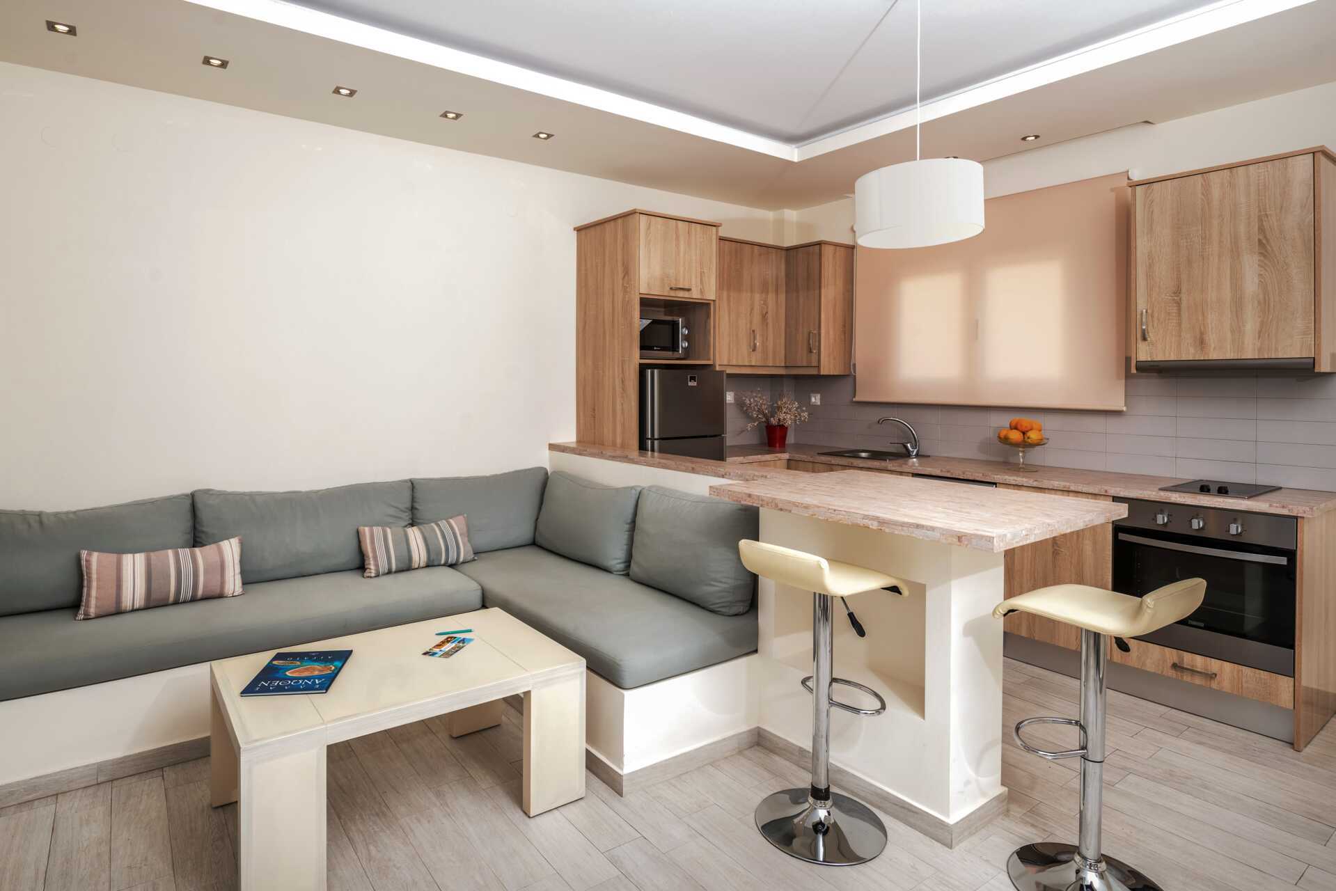 Kolmioita, joissa on parveke allasnäköalalla. Kaksi erillistä makuuhuonetta, joissa parisänky ja kaksi erillistä sänkyä. Yhdistetty olohuone ja keittiö. Hyvin varusteltu keittiö, jossa liesi ja uuni, jääkaappi ja pakastin, astianpesukone, mikroaaltouuni ja peruskeittiövälineet. Maksuton wifi, tallelokero ja ilmastointi. Tv kansainvälisillä kanavilla. Hiustenkuivain. Kaksi kylpyhuonetta, joissa on suihku ja wc. Siivous 7 krt/viikko.