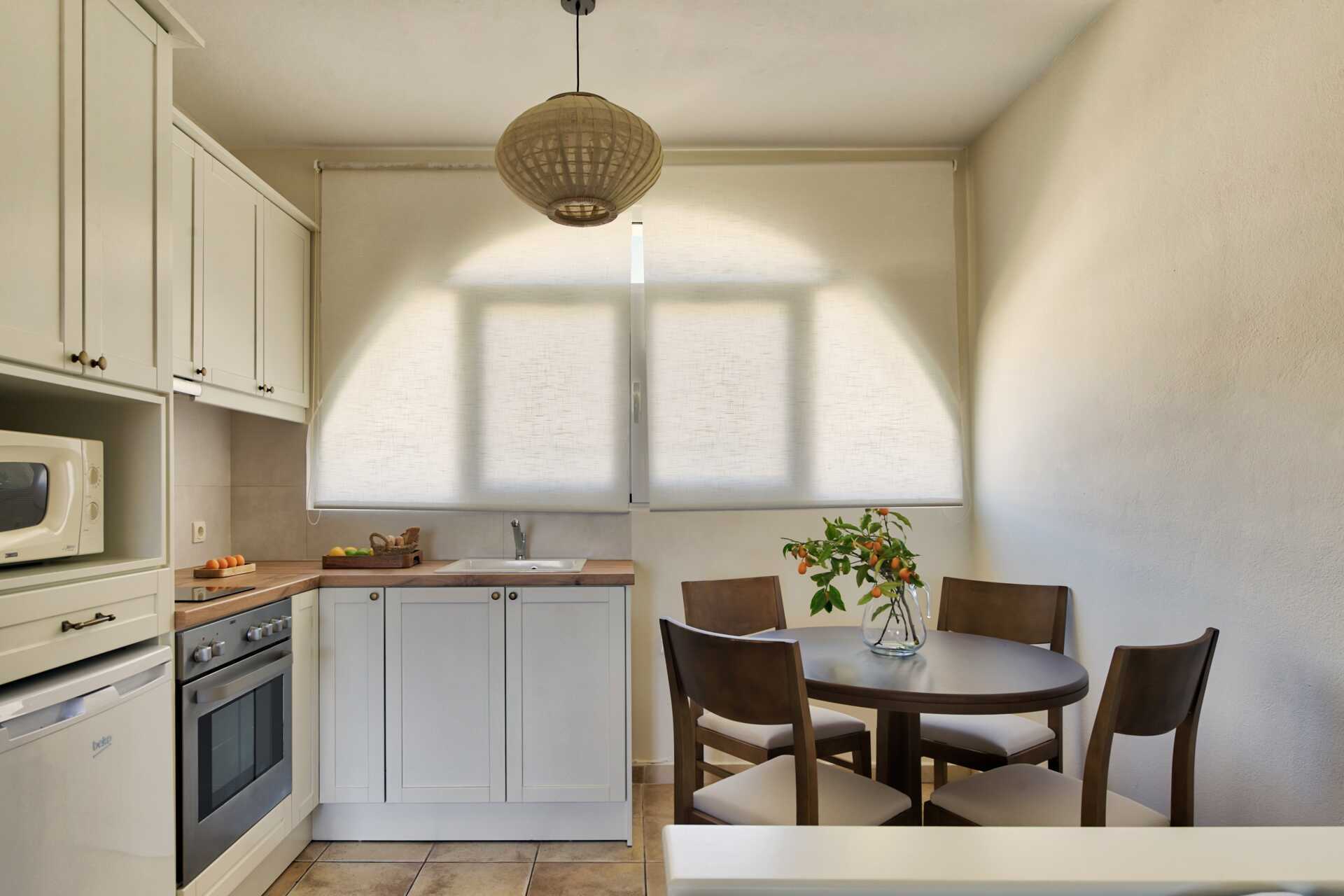 Kaksio parvekkeella tai maaterassilla ja näkymällä uima-altaalle. Yksi makuuhuone parisängyllä ja yhdistetty olohuone ja keittiö. Hyvin varusteltu keittiö, jossa liesi ja uuni, jääkaappi ja pakastin, astianpesukone, mikroaaltouuni ja peruskeittiövälineet. Maksuton wifi ja tallelokero. Ilmastointi lisämaksusta. Tv kansainvälisillä kanavilla. Hiustenkuivain. Kylpyhuoneessa suihku ja wc. Siivous 7 krt/viikko.