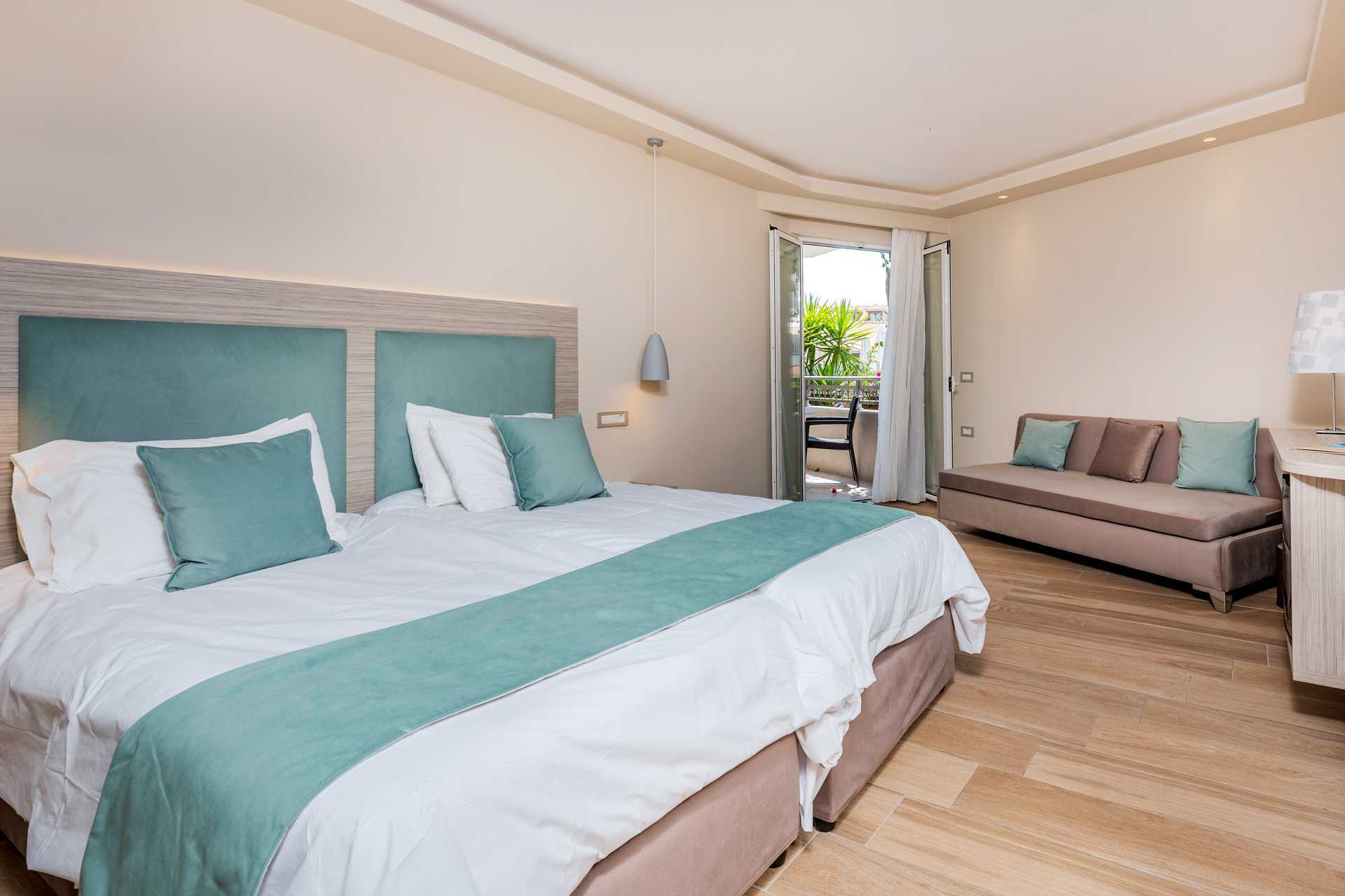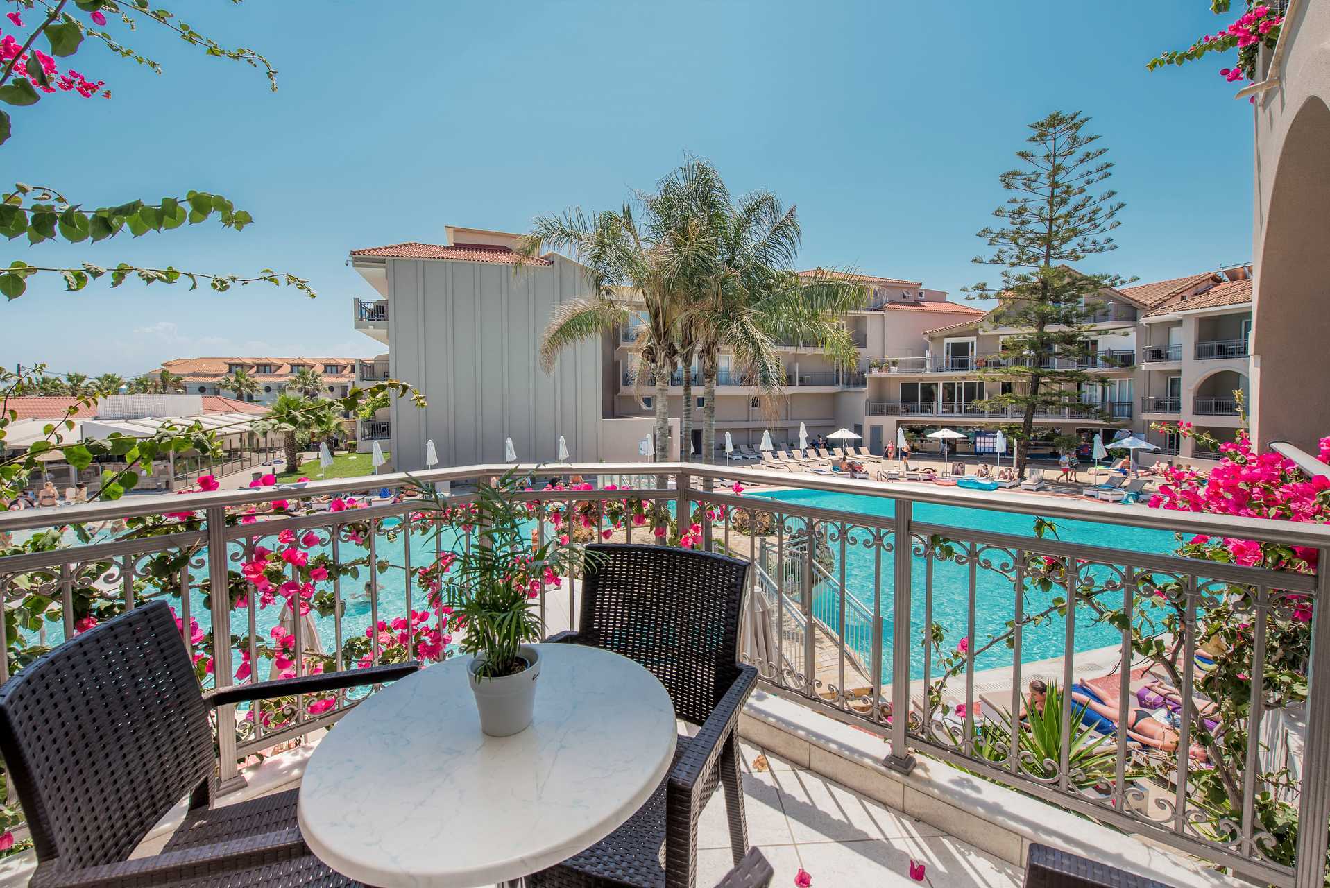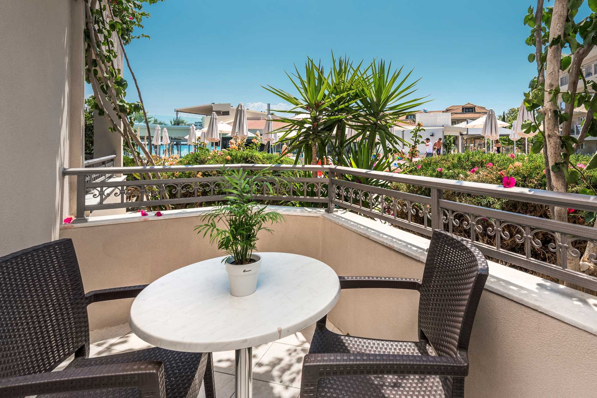 Kahden hengen huone parvekkeella tai maaparvekkeella. Osassa huoneista on näkymä uima-altaalle, osassa parveke rajoitetulla merinäköalalla. Kaksi yhden hengen sänkyä. Lisävuodemahdollisuus kokoontaitettavasta nojatuolista. Jääkaappi. Vedenkeitin, kahvia ja teetä. Maksuton wifi, ilmastointi ja tallelokero. Tv kansainvälisillä kanavilla. Hiustenkuivain. Kylpyhuoneessa suihku ja wc. Siivous 6 krt/viikko.
