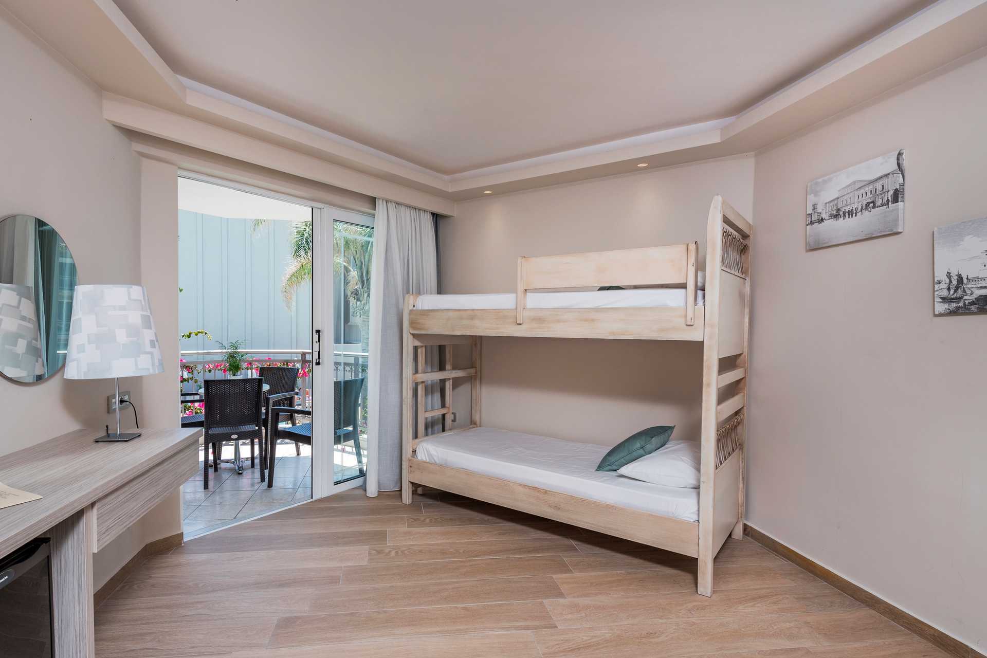 Perhehuone jossa parveke tai terassi, osassa näköala uima-altaalle. Kaksi yhden hengen sänkyä. Mahdollisuus saada lisävuode kerrossänkyyn, jonka pituus on 190 cm. Jääkaappi. Vedenkeitin, kahvia ja teetä. Maksuton wifi, ilmastointi ja tallelokero. Tv kansainvälisillä kanavilla. Hiustenkuivain. Kylpyhuoneessa suihku ja wc. Siivous 6 krt/viikko.