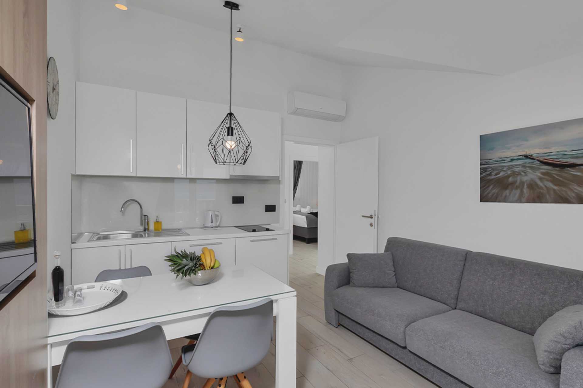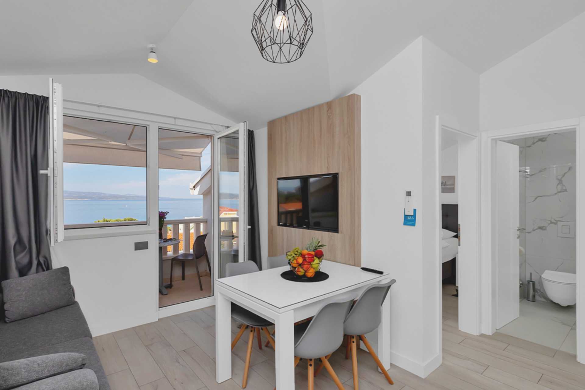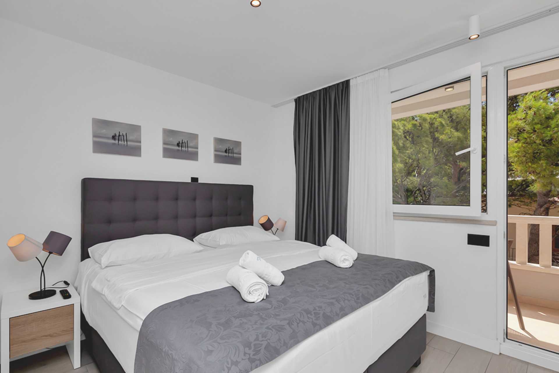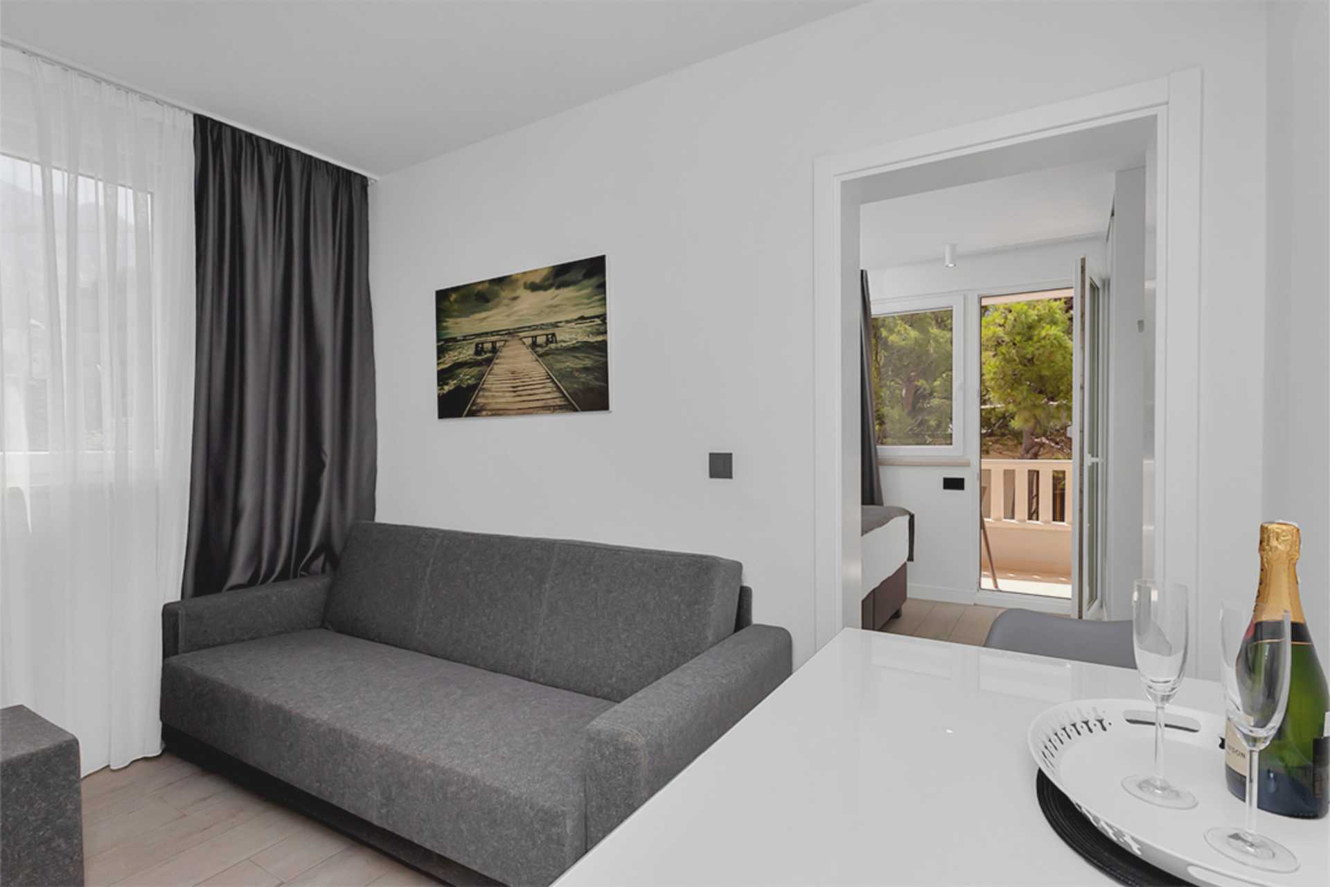 Kolmio parvekkeella tai maaparvekkeella, joistakin parvekkeista on merinäköala tai rajoitettu merinäköala. Rakennuksen yläosassa sijaitsevissa huoneistoissa on hieman matalampi kattokorkeus. Kaksi makuuhuonetta sekä yhdistetty olohuone ja minikeittiö. Parivuode tai kaksi yhden hengen sänkyä. Lisävuodemahdollisuus vuodesohvasta. Minikeittiössä keittolevyt, jääkaappi, astianpesukone, mikro ja yksinkertainen keittiövarustus. Kahvinkeitin - neljä kapselia maksutta. Maksuton wifi, ilmastointi ja tallelokero. Tv kansainvälisillä kanavilla. Hiustenkuivain. Kylpyhuoneessa suihku ja wc. Siivous 3 krt/viikko.