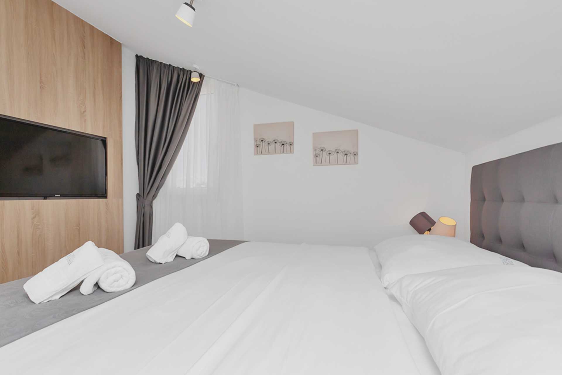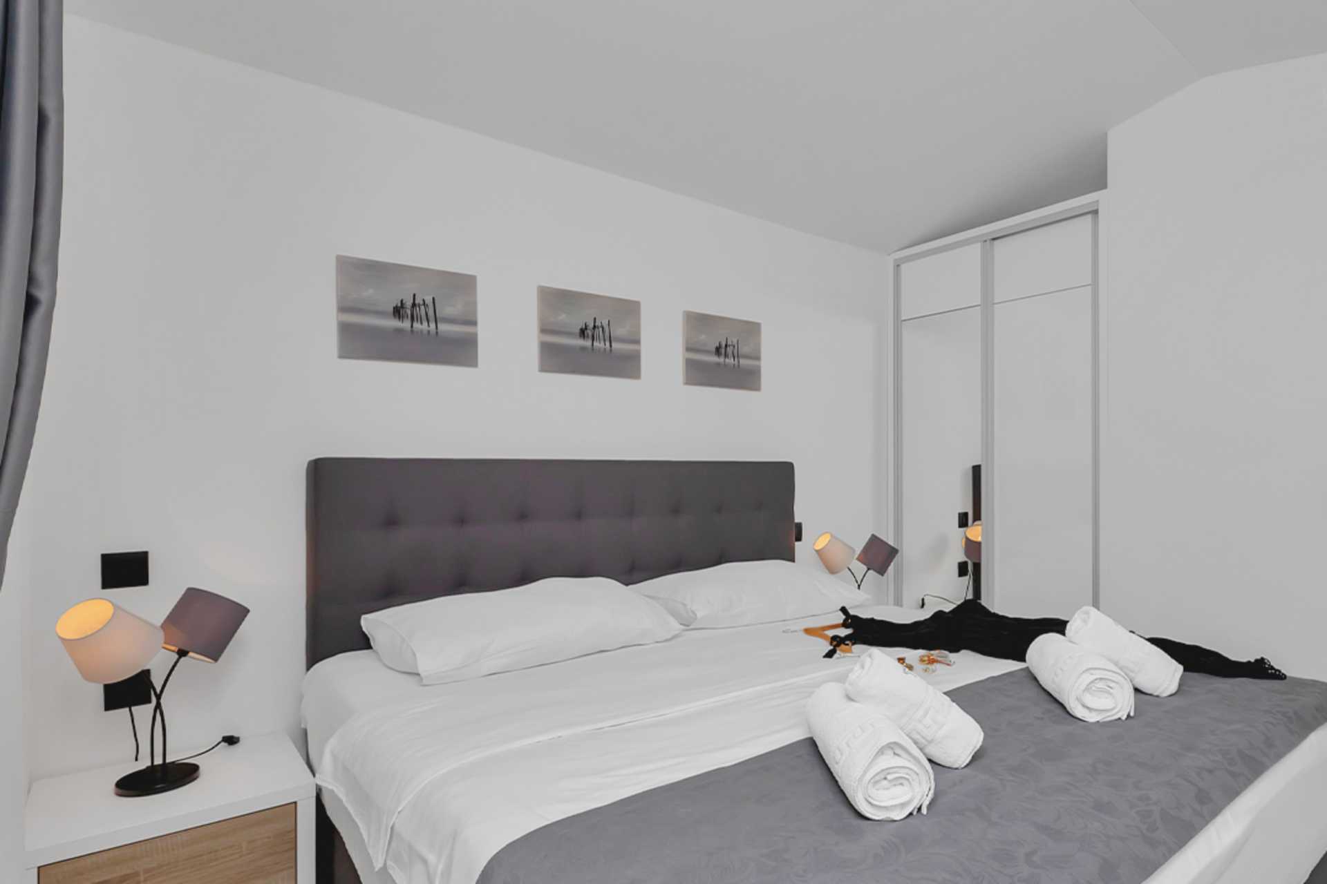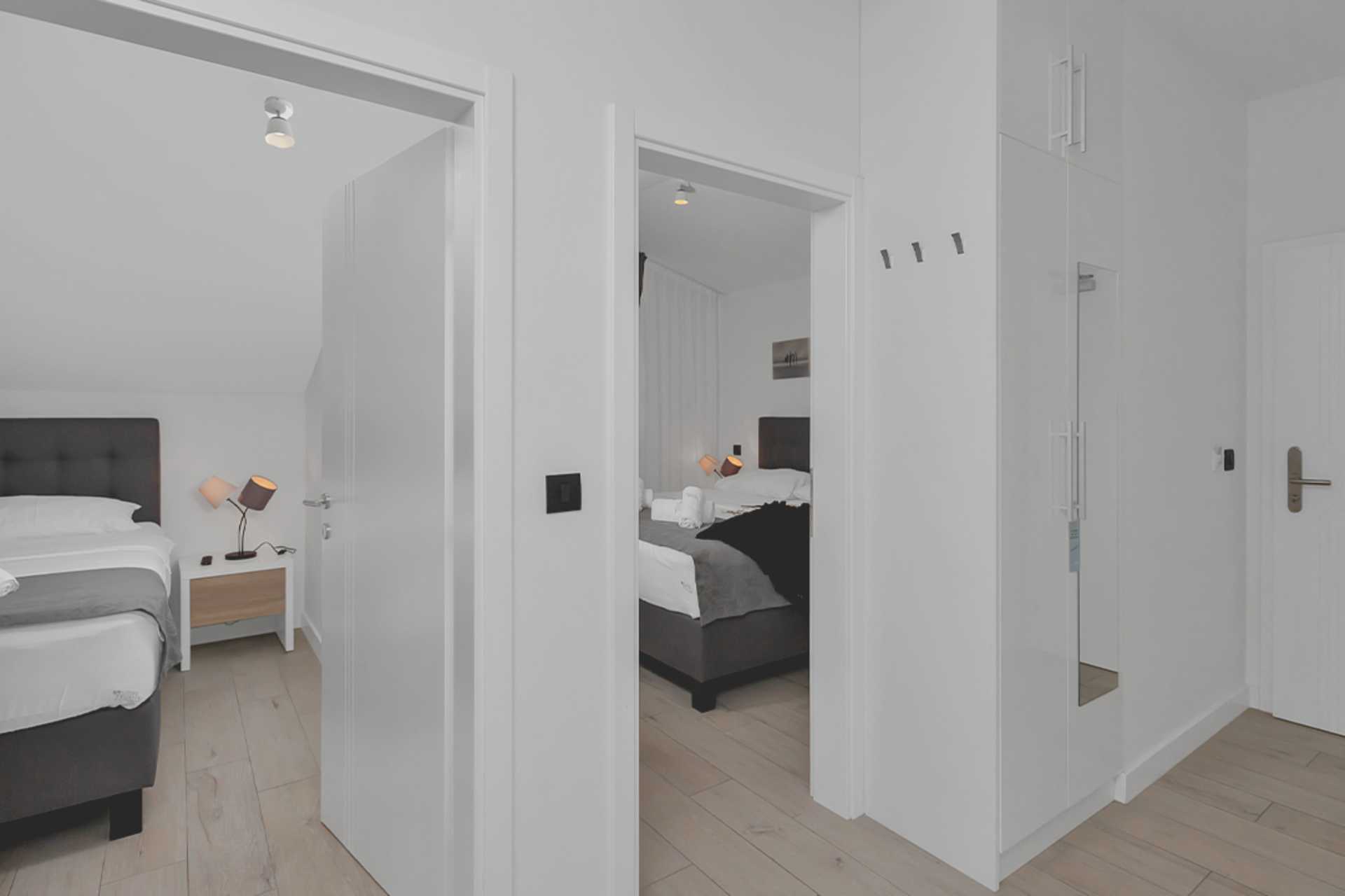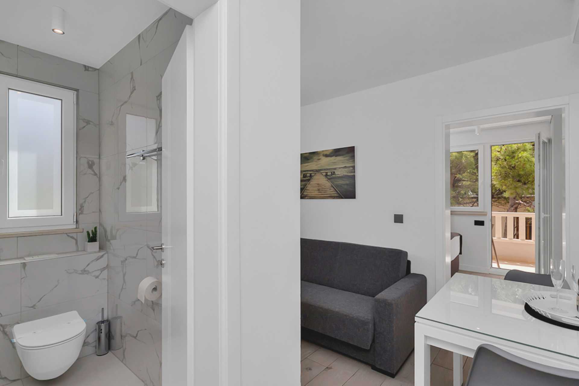 Kolmio parvekkeella tai maaparvekkeella, joistakin parvekkeista on merinäköala tai rajoitettu merinäköala. Rakennuksen yläosassa sijaitsevissa huoneistoissa on hieman matalampi kattokorkeus. Kaksi makuuhuonetta sekä yhdistetty olohuone ja minikeittiö. Parivuode tai kaksi yhden hengen sänkyä. Lisävuodemahdollisuus vuodesohvasta. Minikeittiössä keittolevyt, jääkaappi, astianpesukone, mikro ja yksinkertainen keittiövarustus. Kahvinkeitin - neljä kapselia maksutta. Maksuton wifi, ilmastointi ja tallelokero. Tv kansainvälisillä kanavilla. Hiustenkuivain. Kylpyhuoneessa suihku ja wc. Siivous 3 krt/viikko.