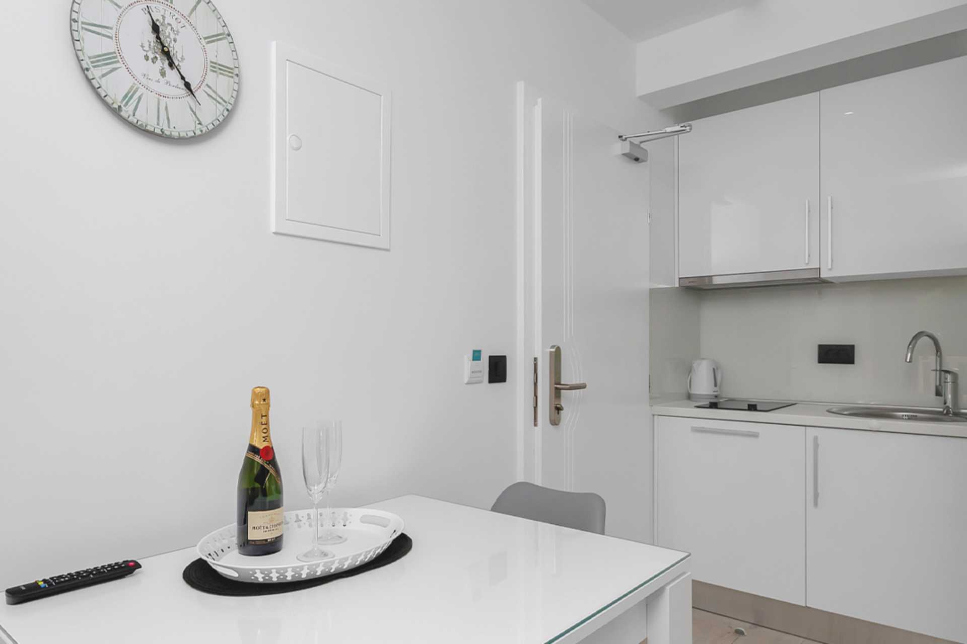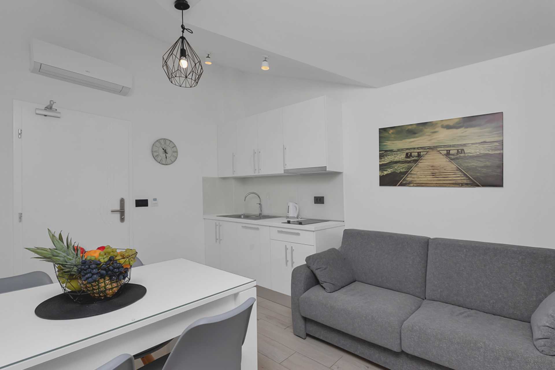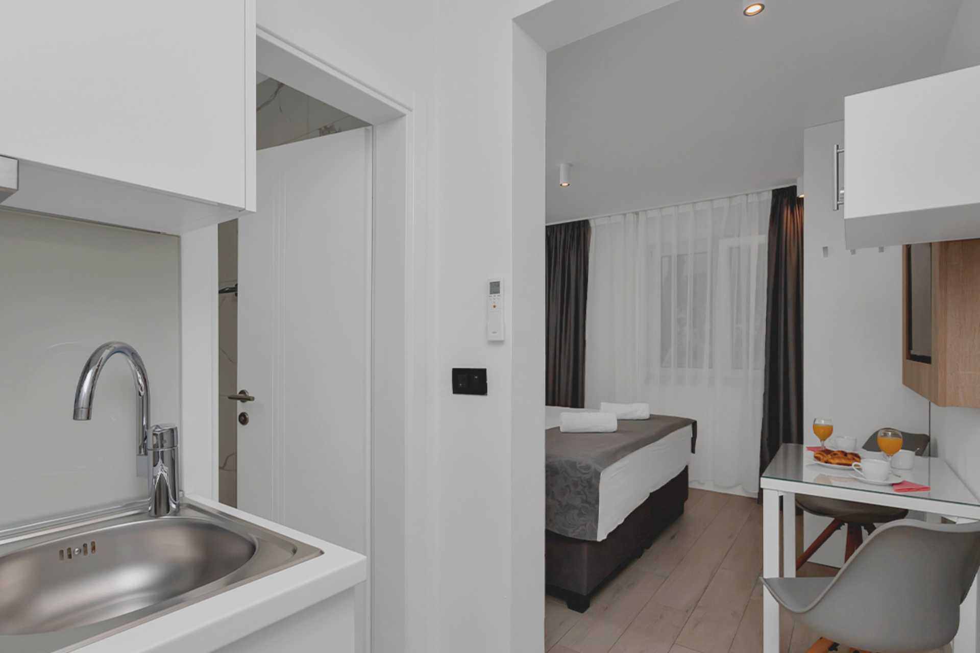 Yksiö ilman ulkotilaa. Yhdistetty makuuhuone ja minikeittiö. Parivuode tai kaksi yhden hengen sänkyä. Minikeittiössä keittolevyt, jääkaappi, vedenkeitin, mikro ja yksinkertainen keittiövarustus. Kahvinkeitin - mukana neljä kapselia. Maksuton wifi, ilmastointi ja tallelokero. Tv kansainvälisillä kanavilla. Hiustenkuivain. Kylpyhuoneessa suihku ja wc. Siivous 3 krt/viikko.