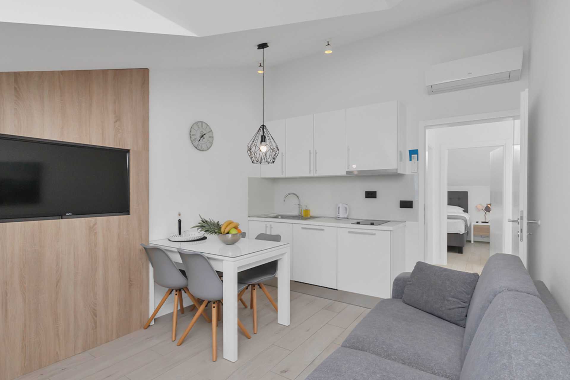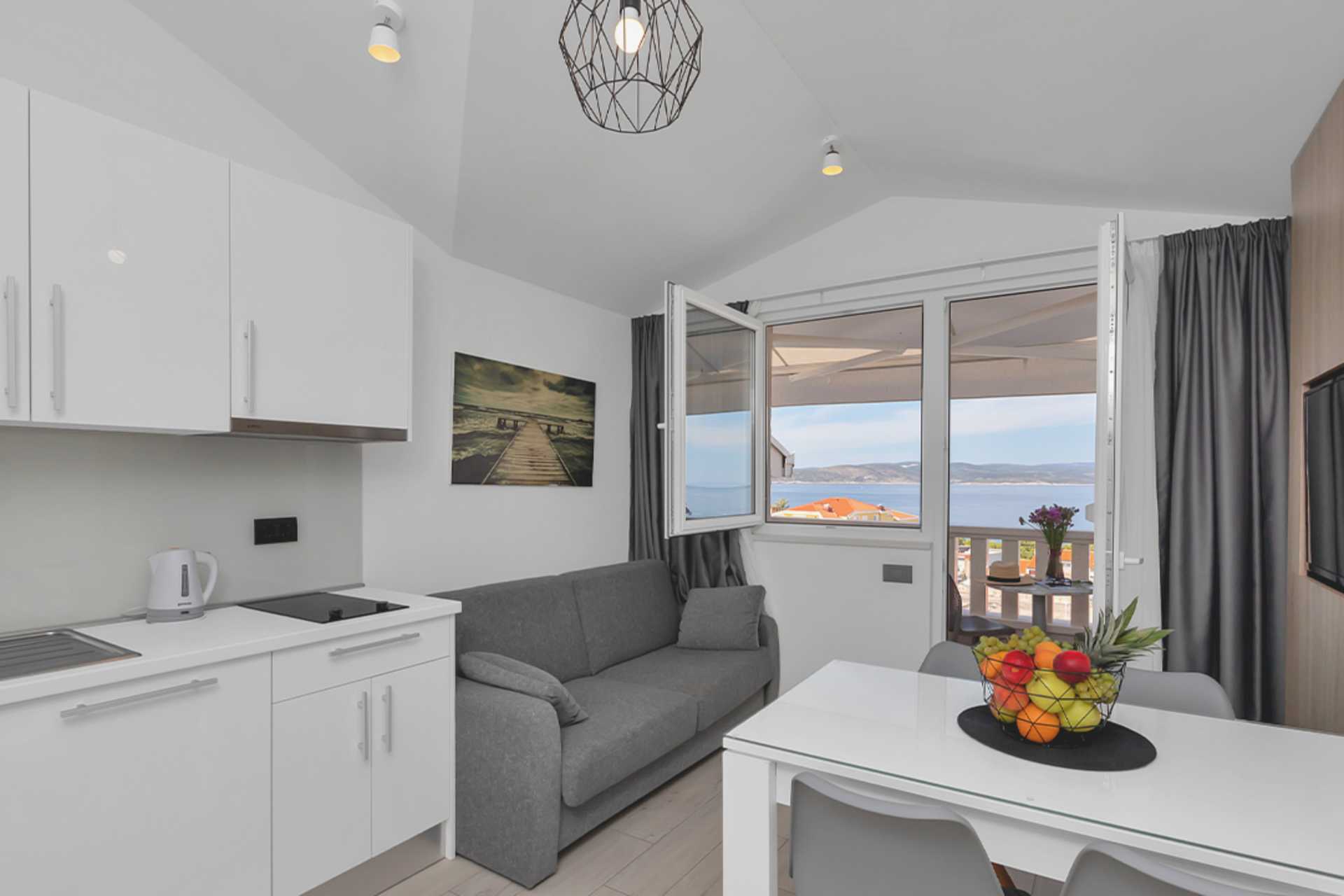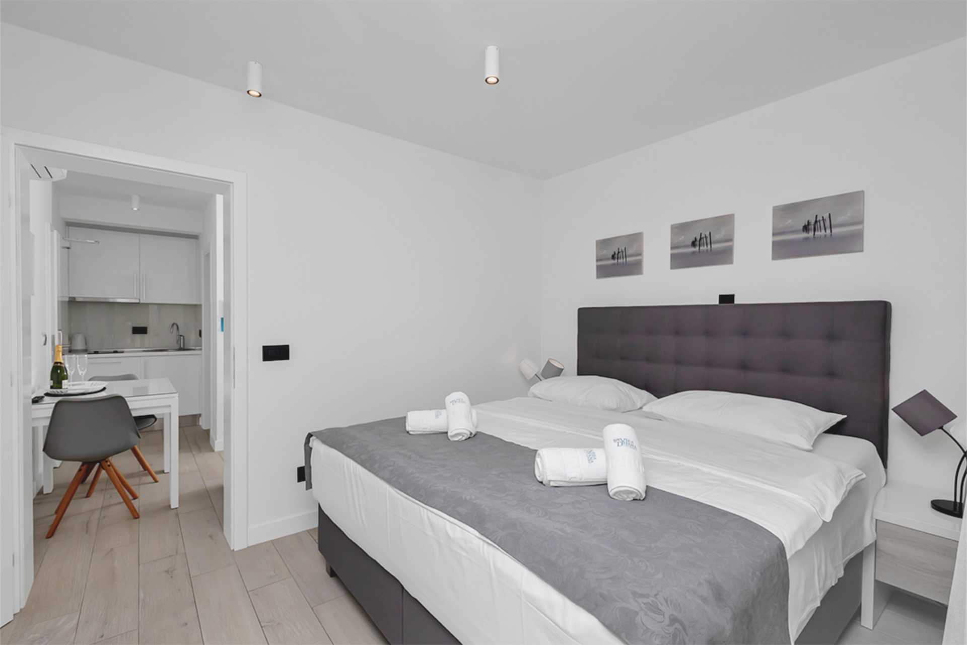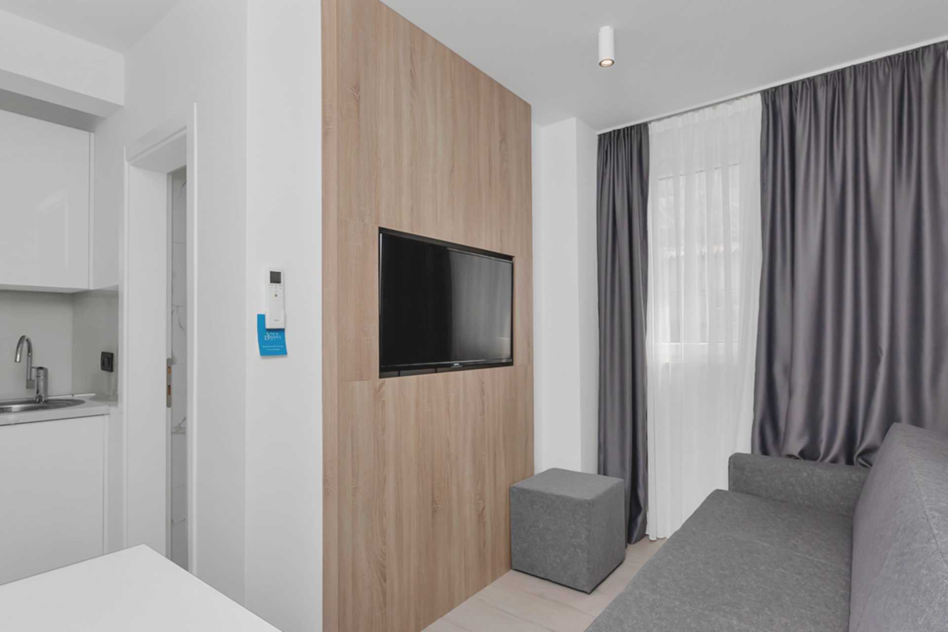 Yksiö parvekkeella tai maaparvekkeella. Joistakin parvekkeista on merinäköala tai rajoitettu merinäköala. Rakennuksen yläosassa sijaitsevissa parvekkeellisissa huoneistoissa on hieman matalampi huonekorkeus. Makuuhuone sekä yhdistetty olohuone ja minikeittiö. Parivuode tai kaksi yhden hengen sänkyä. Lisävuodemahdollisuus vuodesohvasta. Minikeittiössä keittolevyt, jääkaappi, astianpesukone, mikro ja yksinkertainen keittiövarustus. Kahvinkeitin - neljä kapselia mukana. Maksuton wifi, ilmastointi ja tallelokero. Tv kansainvälisillä kanavilla. Hiustenkuivain. Kylpyhuoneessa suihku ja wc. Siivous 3 krt/viikko.