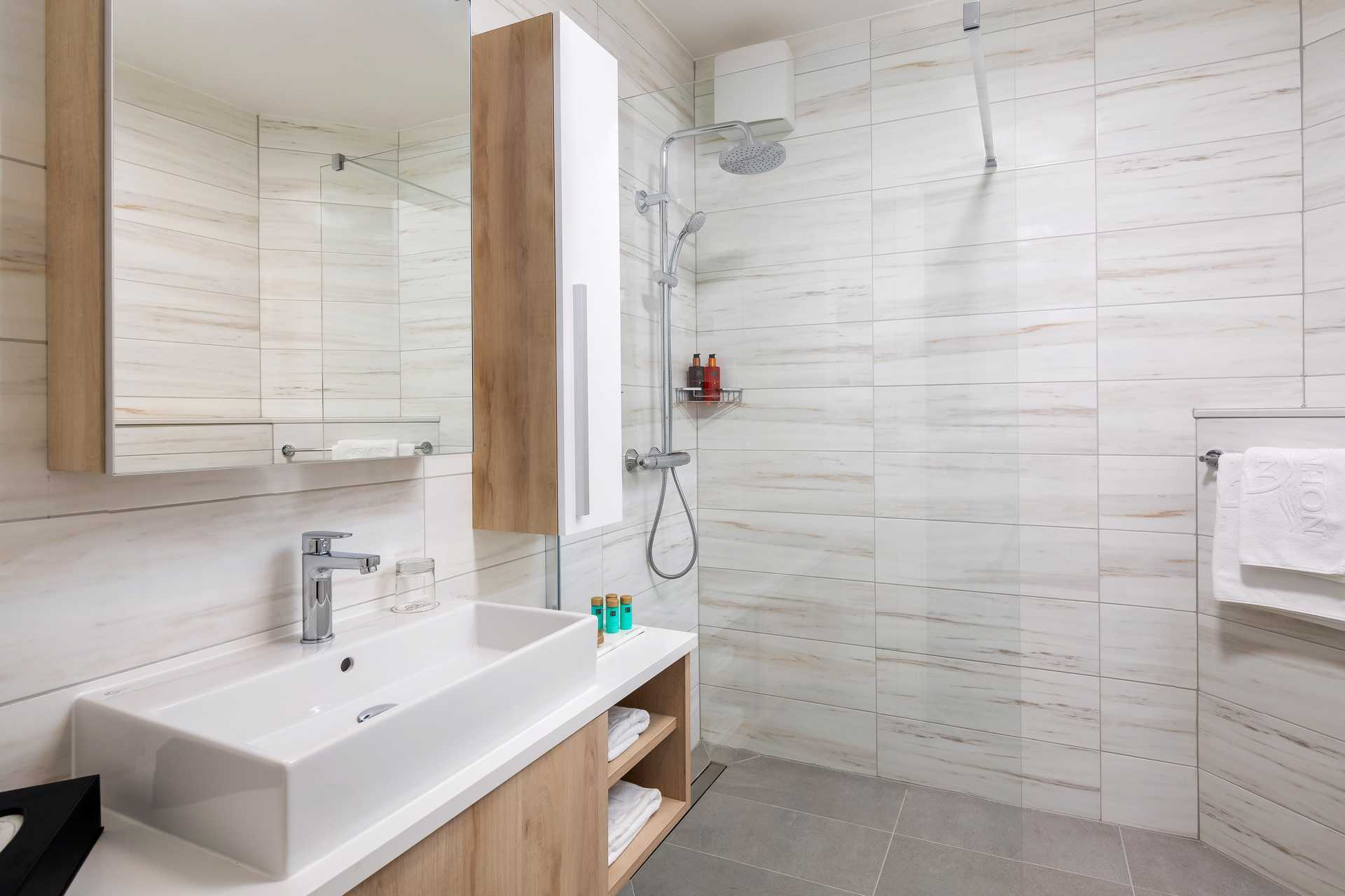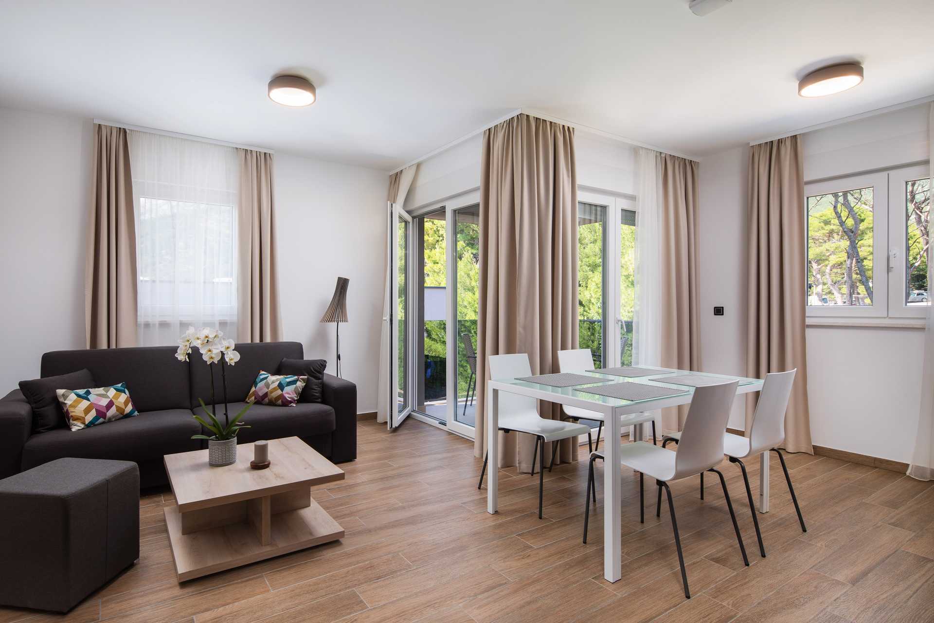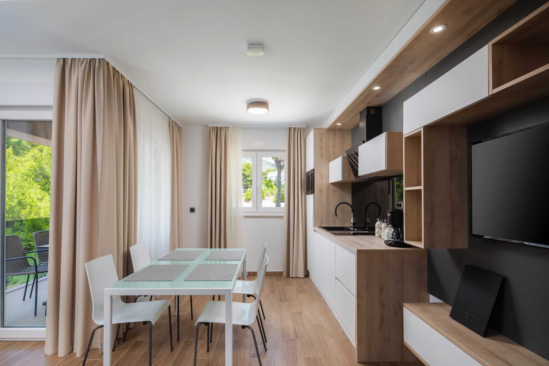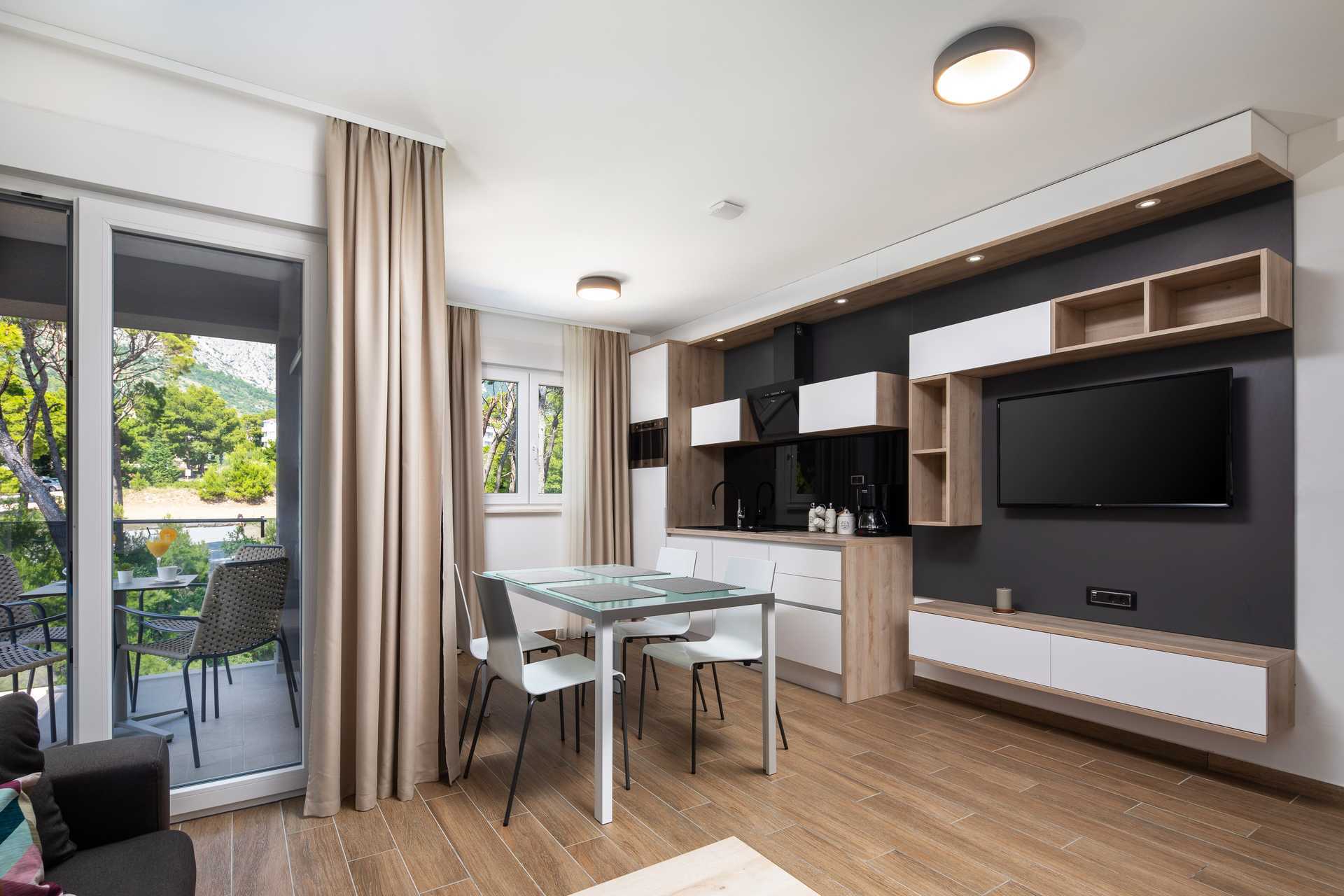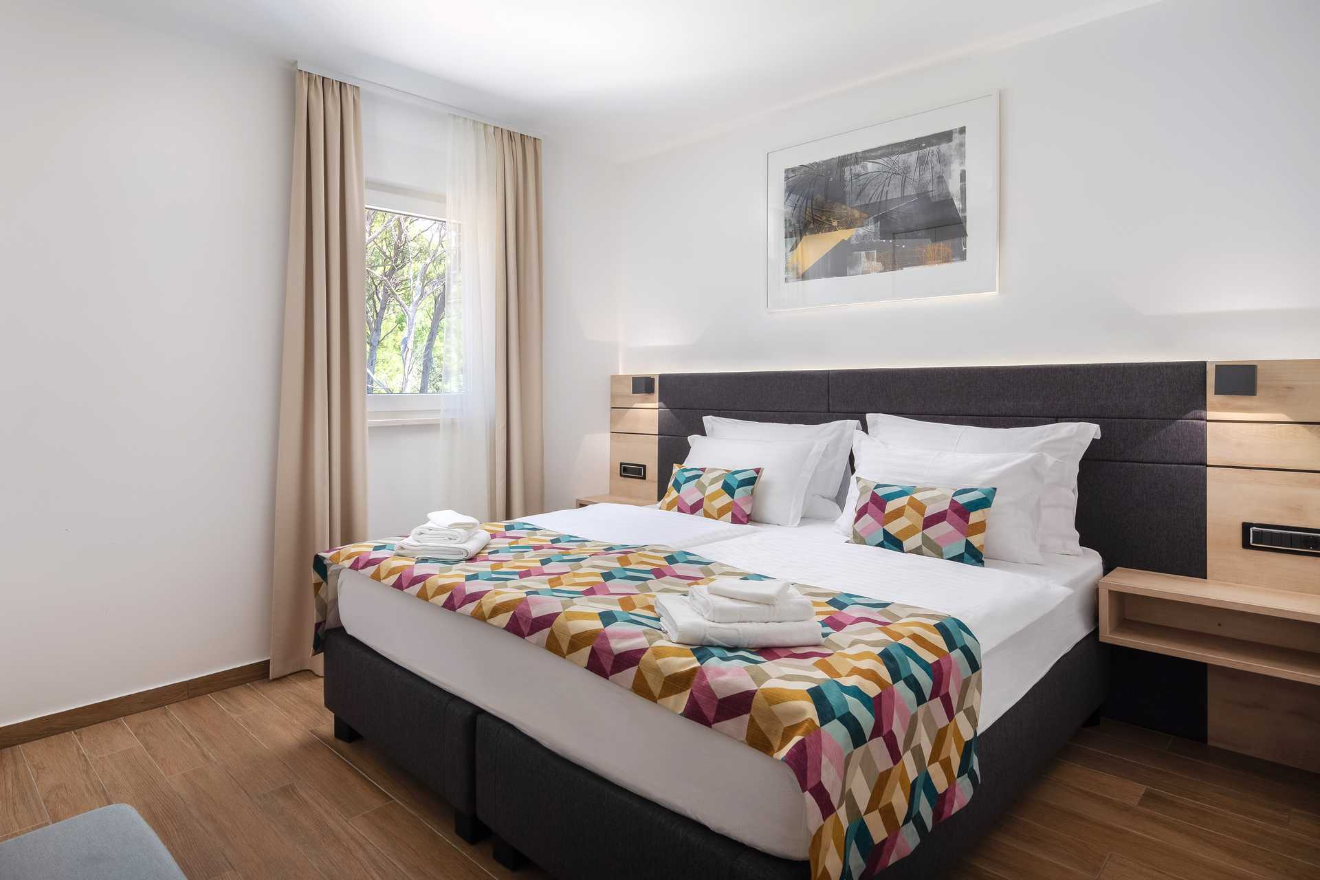 Kaksio maaparvekkeella tai parvekkeella. Joistakin parvekkeista on merinäköala tai rajoitettu merinäköala. Makuuhuone sekä yhdistetty olohuone ja minikeittiö. Parivuode tai kaksi yhden hengen sänkyä. Lisävuodemahdollisuus vuodesohvasta. Minikeittiössä on keittolevyt, jääkaappi ja yksinkertainen keittiövarustus. Maksuton wifi, ilmastointi ja tallelokero. Tv kansainvälisillä kanavilla. Silitysrauta ja -lauta. Kylpytakit ja tossut. Hiustenkuivain. Kylpyamme tai suihku ja wc. Siivous 6 krt/viikko.