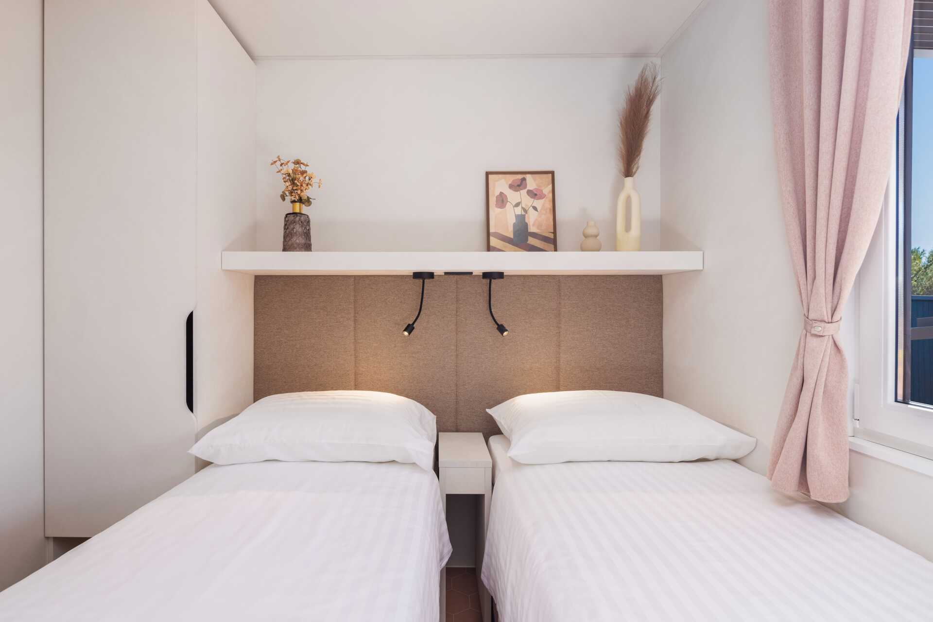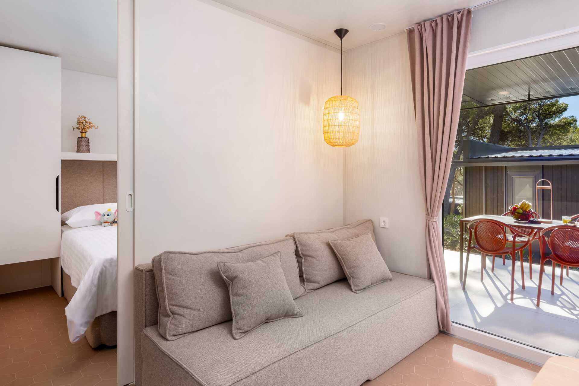 Superior-kolmio, jossa on maaterassi ja aurinkotuoleja. Kaksi erillistä makuuhuonetta, toisessa parisänky ja toisessa kaksi erillistä sänkyä. Vuodesohva. Keittiönurkkaus, jossa jääkaappi, liesi, vedenkeitin, kahvinkeitin, astianpesukone ja peruskeittiövälineet. Maksuton wifi, ilmastointi ja tallelokero. Tv. Hiustenkuivain. Kaksi kylpyhuonetta, joissa kylpyamme/suihku ja wc. Siivous 1 krt/viikko. Alle 2-vuotiaat lapset lasketaan lisävuoteella majoittuviksi henkilöiksi. Superior-kolmiot sijaitsevat alueen keskeisellä paikalla lähellä allasta ja leikkikenttää.