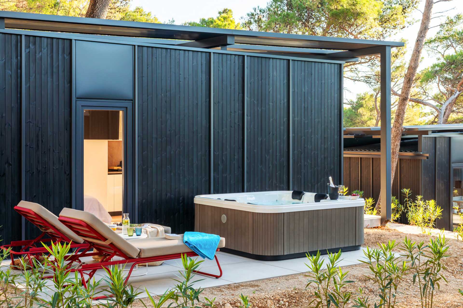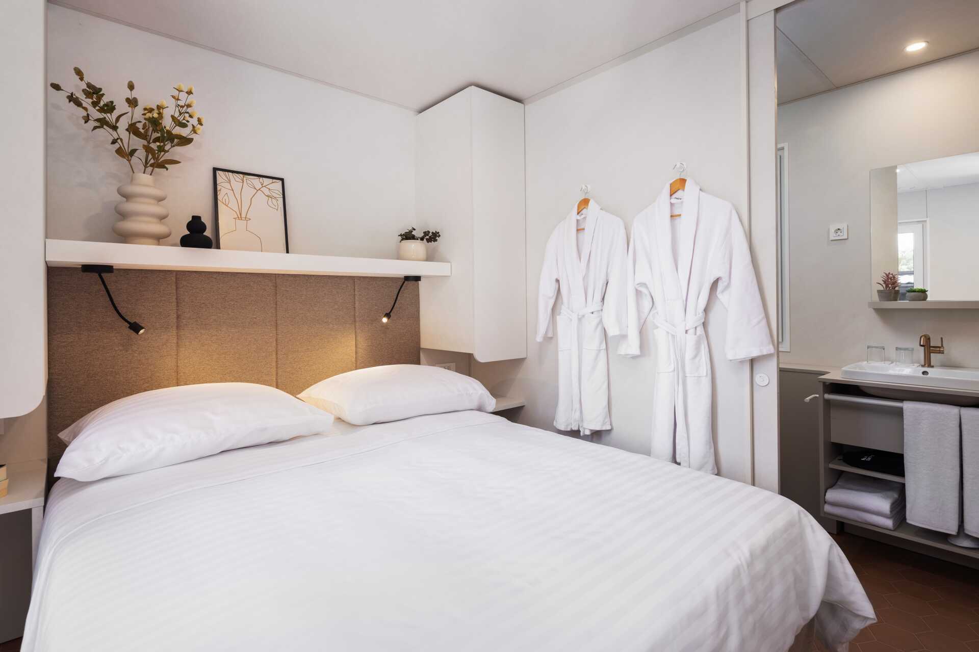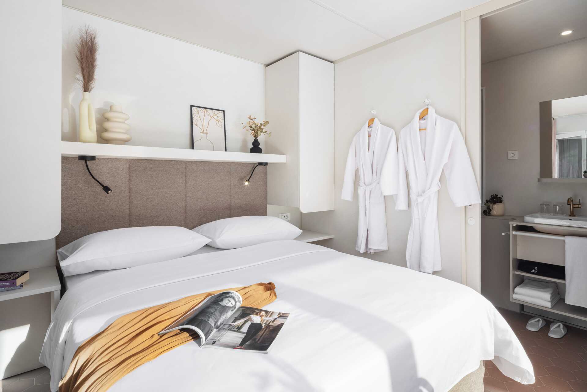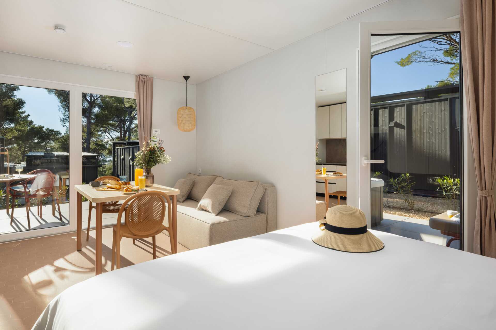 Superior-kolmio, jossa on maaterassi, aurinkotuoleja ja oma poreallas. Kaksi erillistä makuuhuonetta, toisessa parisänky ja toisessa kaksi erillistä sänkyä. Vuodesohva. Keittiönurkkaus, jossa jääkaappi, liesi, vedenkeitin, kahvinkeitin, astianpesukone ja peruskeittiövälineet. Maksuton wifi, ilmastointi ja tallelokero. Tv. Hiustenkuivain. Kaksi kylpyhuonetta, joissa kylpyamme/suihku ja wc. Siivous 1 krt/viikko. Alle 2-vuotiaat lapset lasketaan lisävuoteella majoittuviksi henkilöiksi.