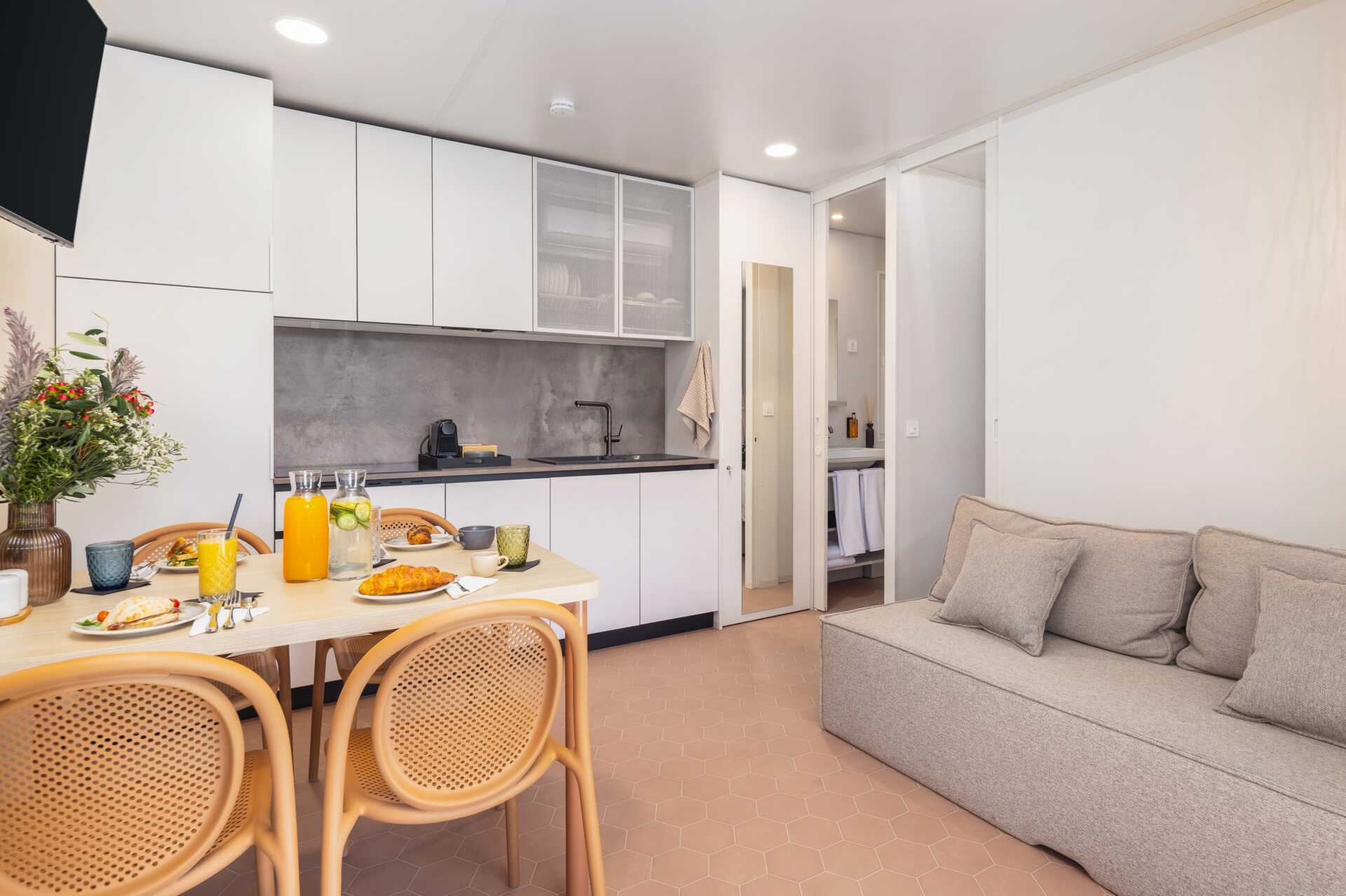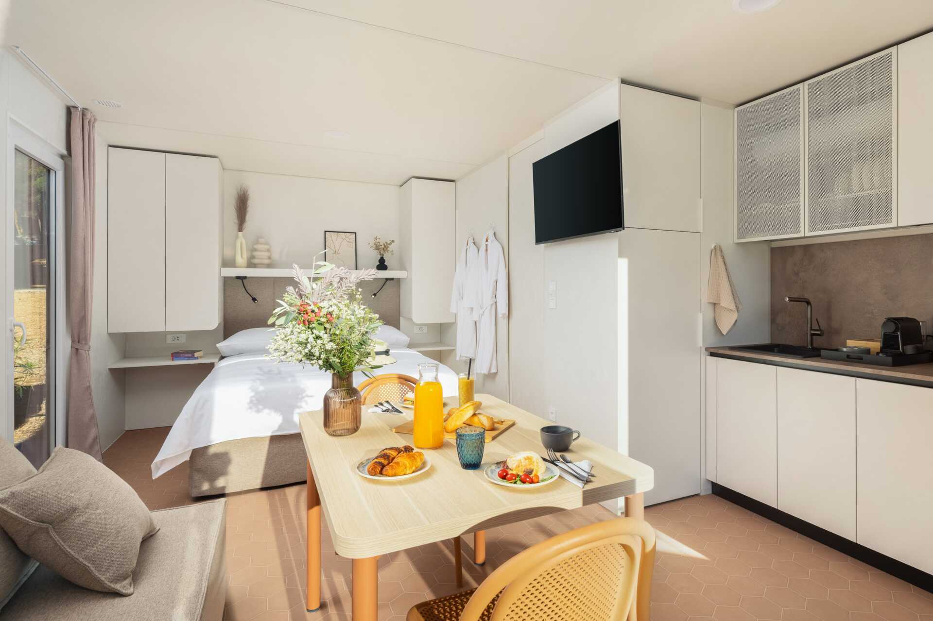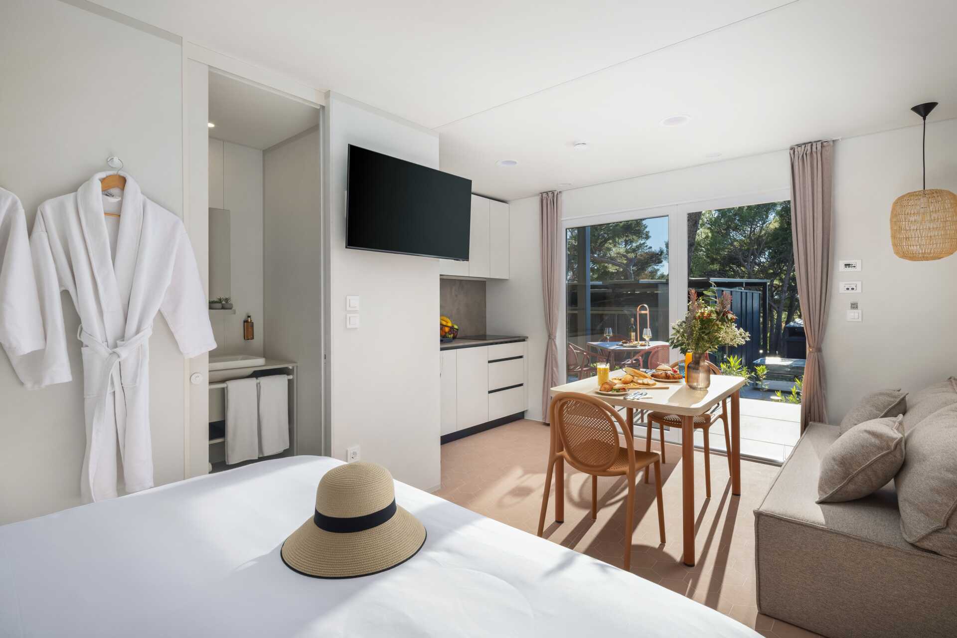 Yksiö maaterassilla jolla on yksityinen poreallas. Parisänky ja vuodesohva. Keittiönurkkaus, jossa jääkaappi, liesi, astianpesukone, vedenkeitin, kahvinkeitin ja peruskeittiövälineet. Maksuton wifi, ilmastointi ja tallelokero. Tv. Hiustenkuivain. Kylpyhuone ammeella/suihkulla ja wc. Siivous kerran viikossa. Alle 2-vuotiaat lapset lasketaan lisävuoteella majoittuviksi henkilöiksi.