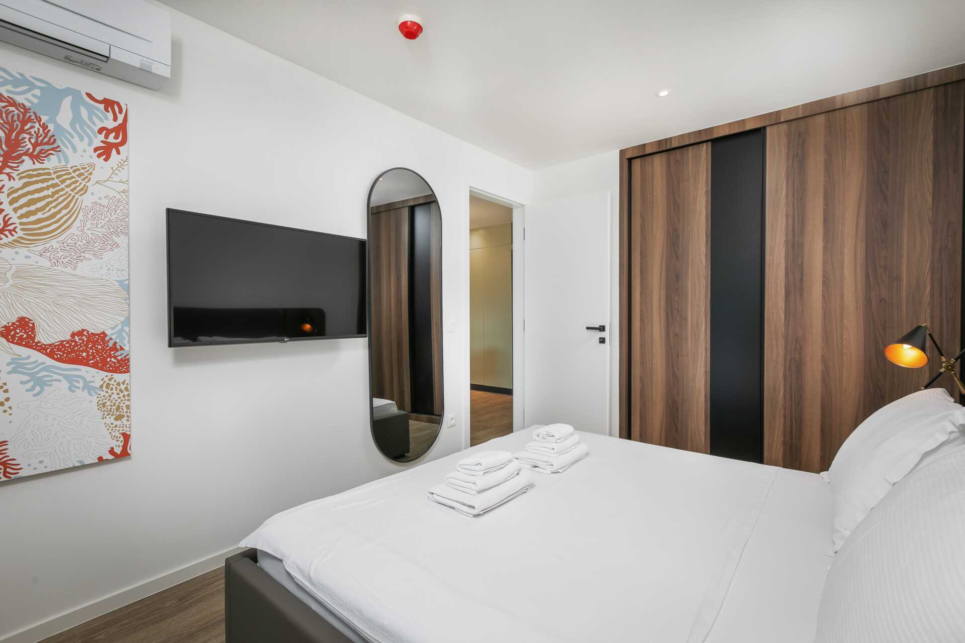 Kolmioita, joissa on parveke. Kaksi makuuhuonetta ja yhdistetty olohuone ja minikeittiö. Makuuhuone, jossa on parivuode ja makuuhuone, jossa on kerrossänky tai parivuode. Lisävuodemahdollisuus vuodesohvasta. Minikeittiö, jossa on jääkaappi, keittolevyt, tiskikone, kahvinkeitin, vedenkeitin, mikro ja yksinnkertainen keittiövarustus. Maksuton wifi, ilmastointi ja tallelokero. Tv kansainvälisillä kanavilla. Hiustenkuivain. Pesukone, suihku ja wc. Siivous 7 krt/viikko.