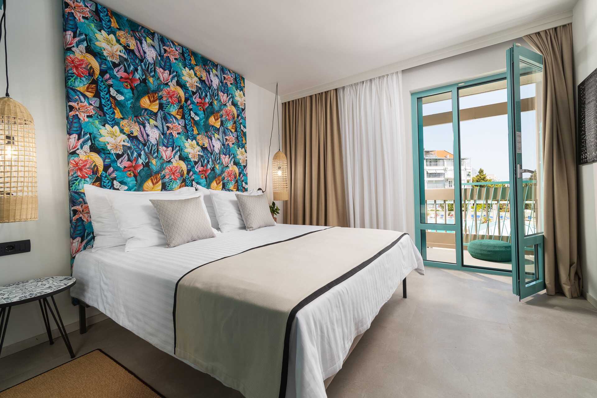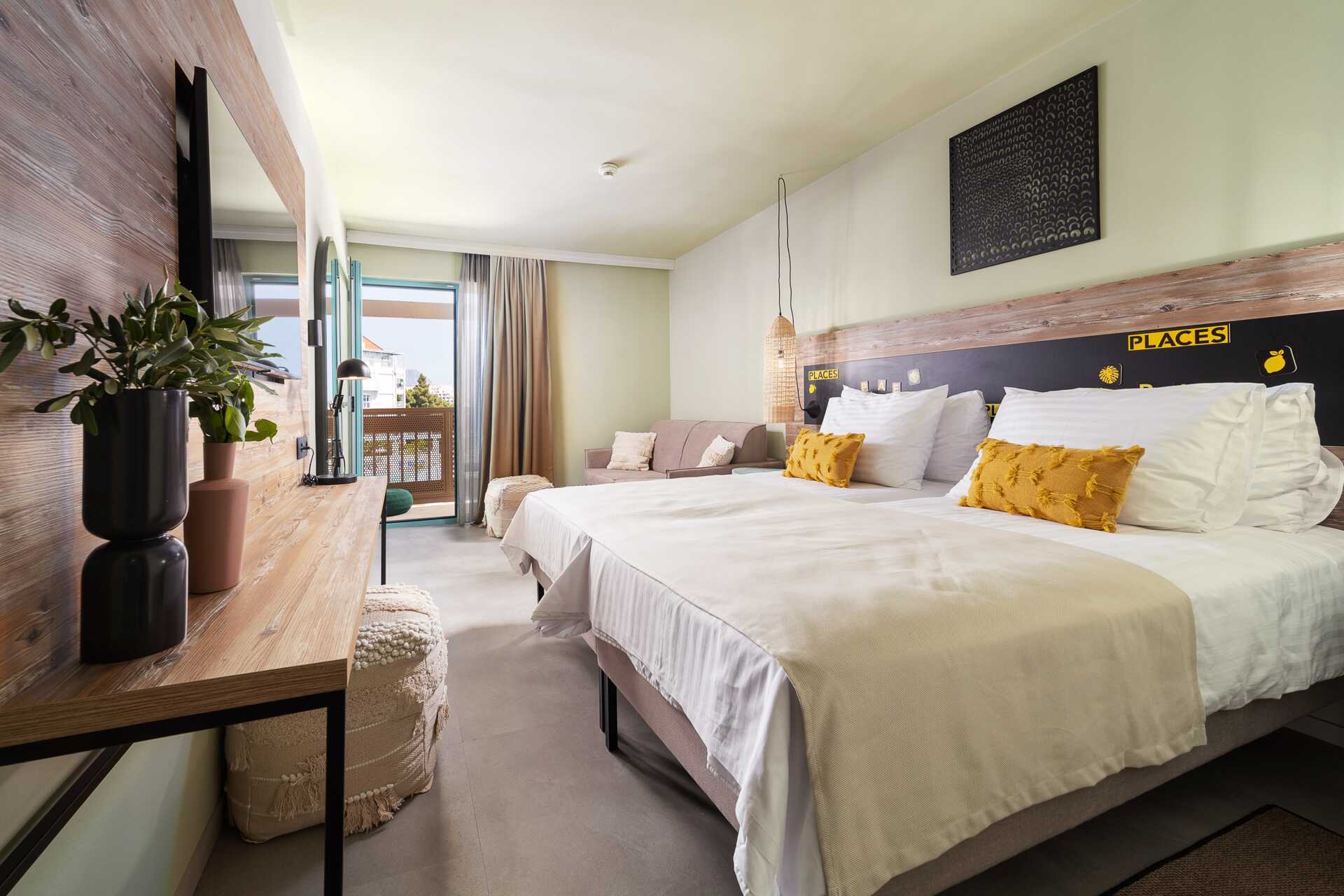Suurempi kahden hengen huone, parvekkeella ja rajoitetulla merinäköalalla. Parivuode tai kaksi yhden hengen sänkyä. Lisävuodemahdollisuus yhden hengen vuoteesta tai vuodesohvasta. Maksuton wifi, ilmastointi ja tallelokero. Tv kansainvälisillä kanavilla. Jääkaappi. Hiustenkuivain. Suihku ja wc. Siivous 7 krt/viikko.
