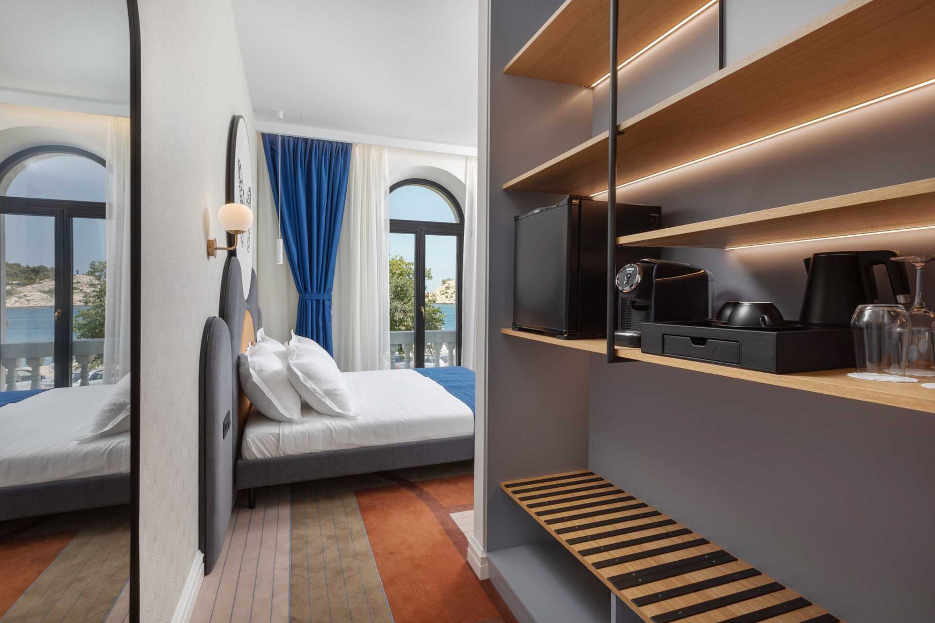 Superior-huone, jossa ei ole ulkotilaa, mutta ikkunasta on rajoitettu merinäköala. Parivuode. Maksuton wifi, ilmastointi ja tallelokero. Minibaari. Espressokeitin, sisältää kapselit. Vedenkeitin. Tv kansainvälisillä kanavilla. Kokolattiamatto. Hiustenkuivain. Kylpyhuoneessa suihku ja wc. Siivous 7 krt/viikko.