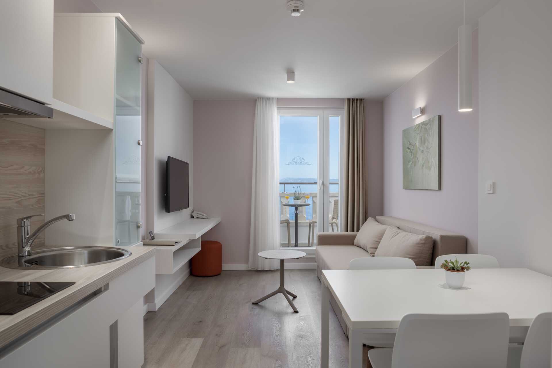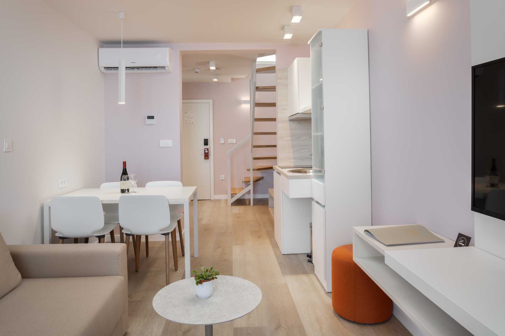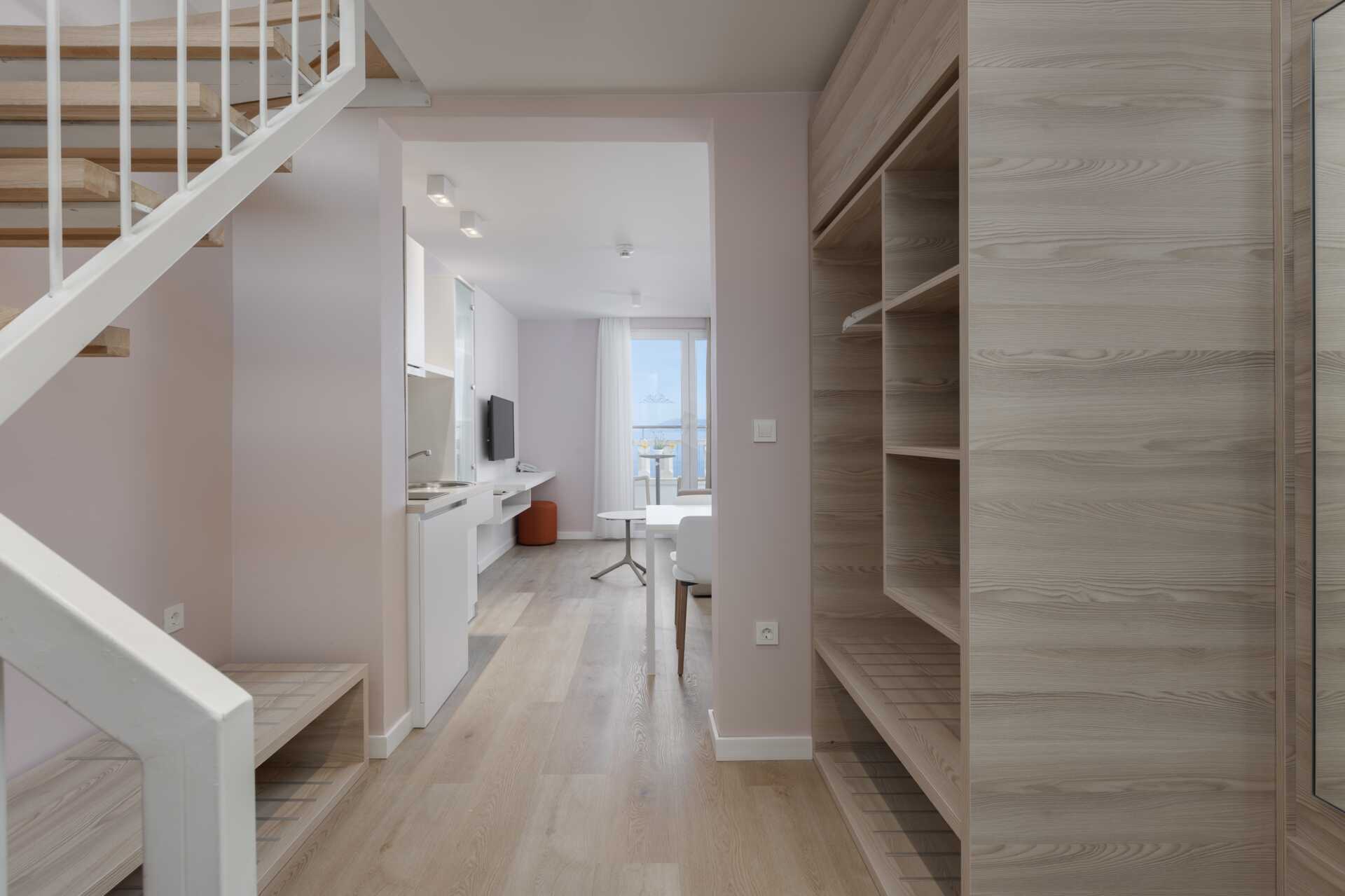 Kaksikerroksinen juniorsviitti pienellä parvekkeella ja merinäköalalla. Sisäänkäyntikerroksessa on yhdistetty olohuone, jossa on minikeittiösaareke, sekä kylpyhuone, jossa on hiustenkuivain, suihku ja wc. Yläkerrassa makuuhuone, jossa on parisänky. Mahdollisuus lisävuoteisiin olohuoneen vuodesohvalla. Pienessä keittiötilassa on jääkaappi, vedenkeitin, kahvinkeitin ja peruskeittiövälineet. Keittolevyt puuttuvat. Maksuton wifi, ilmastointi ja tallelokero. Tv paikallisilla kanavilla. Hiustenkuivain. Siivous 7 krt/viikko.