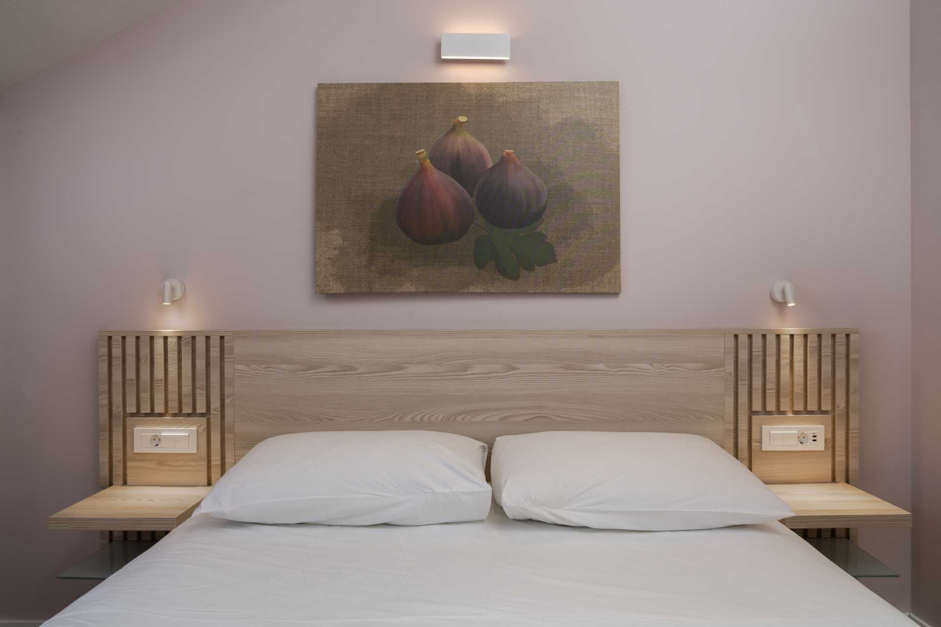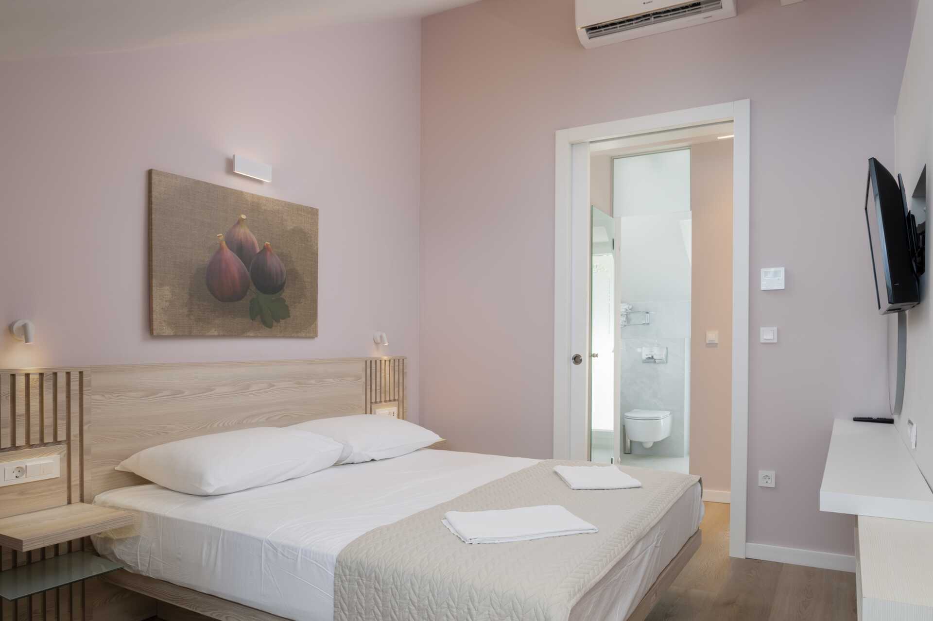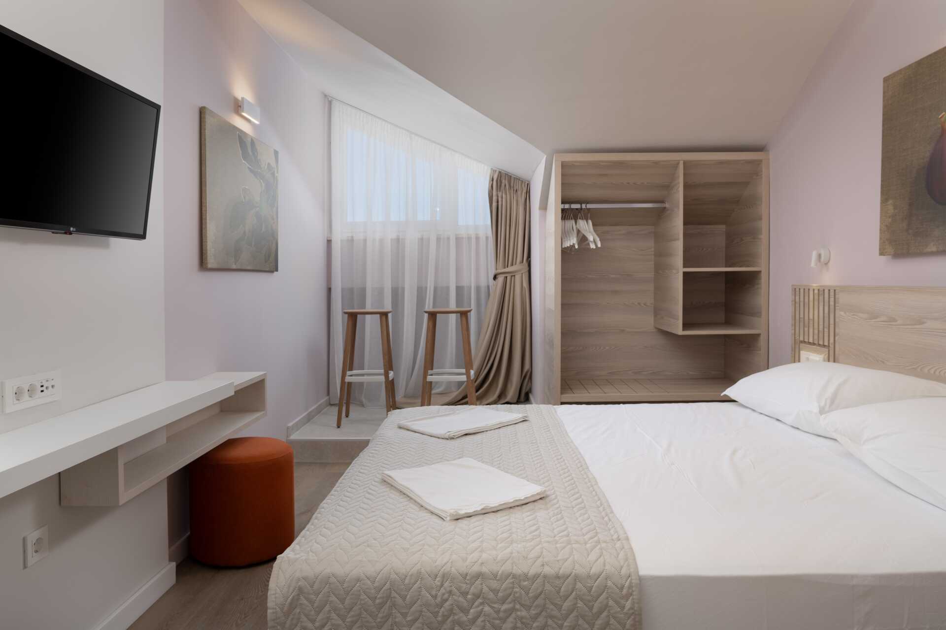 Kahden hengen huone parvekkeella ja merinäköalalla. Kahden hengen huoneet ja parvekkeet ovat erikokoisia. Parivuode. Lisävuodemahdollisuus vuodesohvasta. Pieni keittiötila, jossa jääkaappi, vedenkeitin, kahvinkeitin ja yksinkertainen keittiövarustus. Keittolevyt puuttuvat. Maksuton wifi, ilmastointi ja tallelokero. Tv paikallisilla kanavilla. Hiustenkuivain. Kylpyhuoneessa suihku ja wc. Siivous 7 krt/viikko.