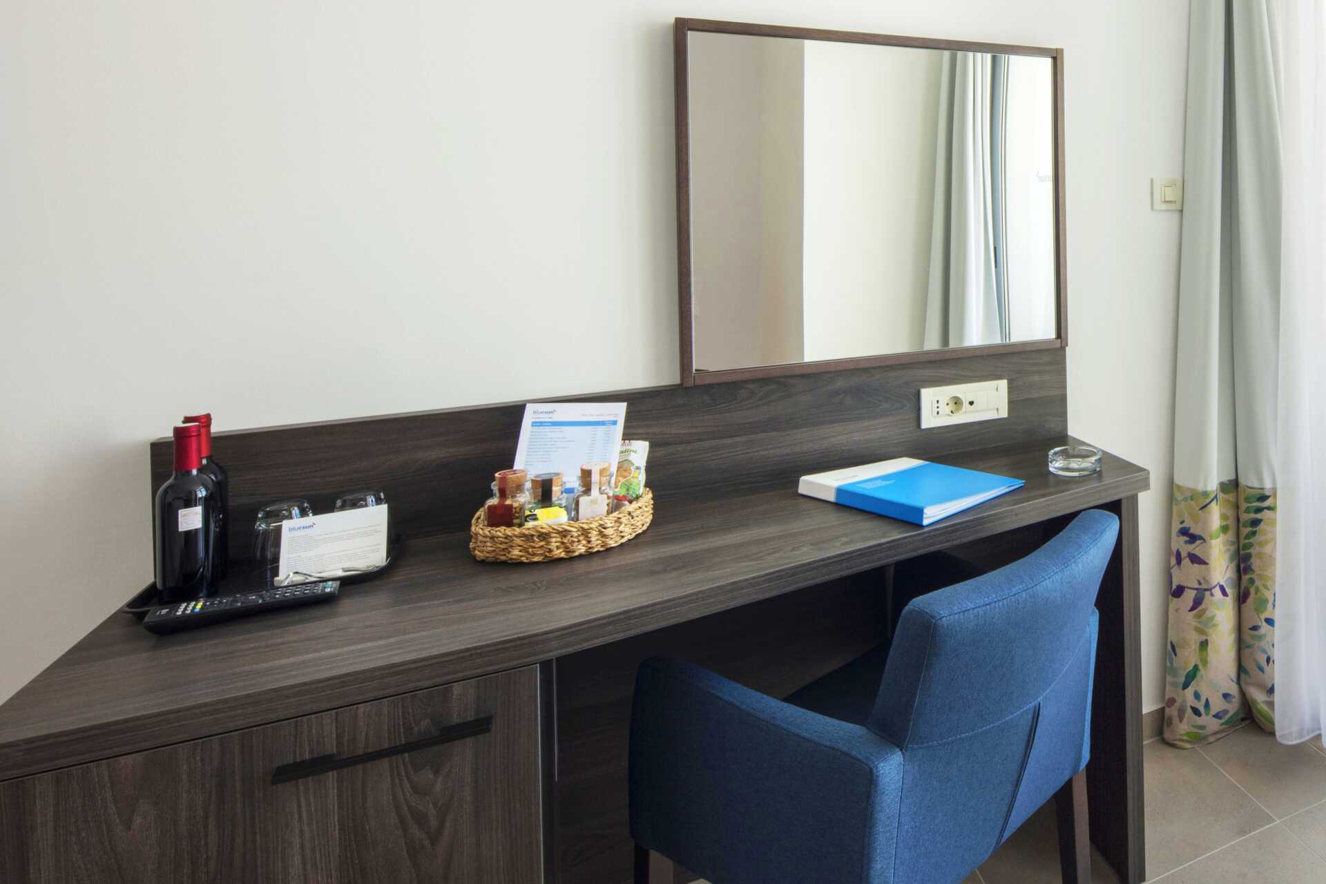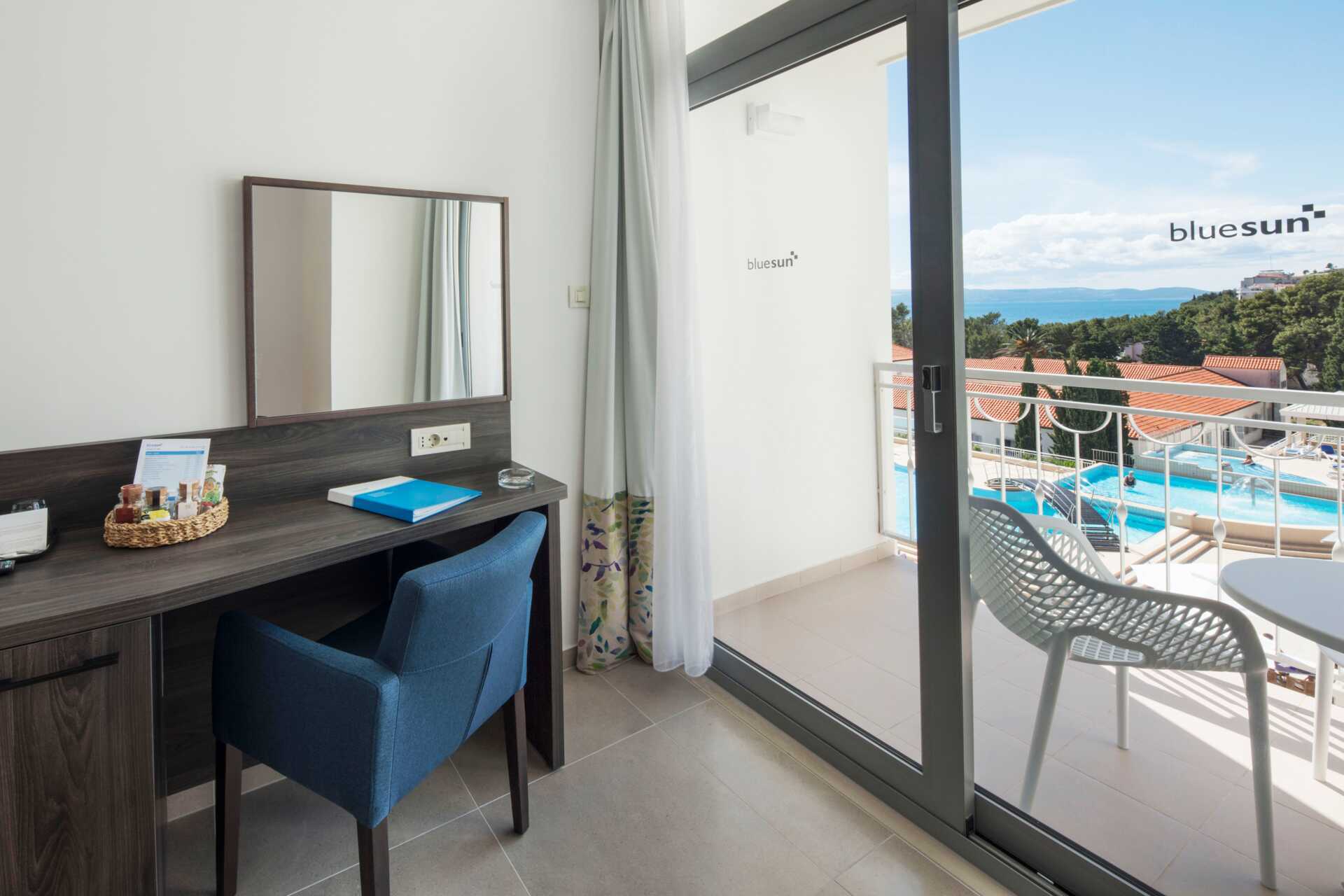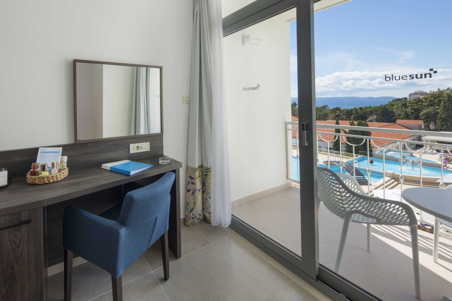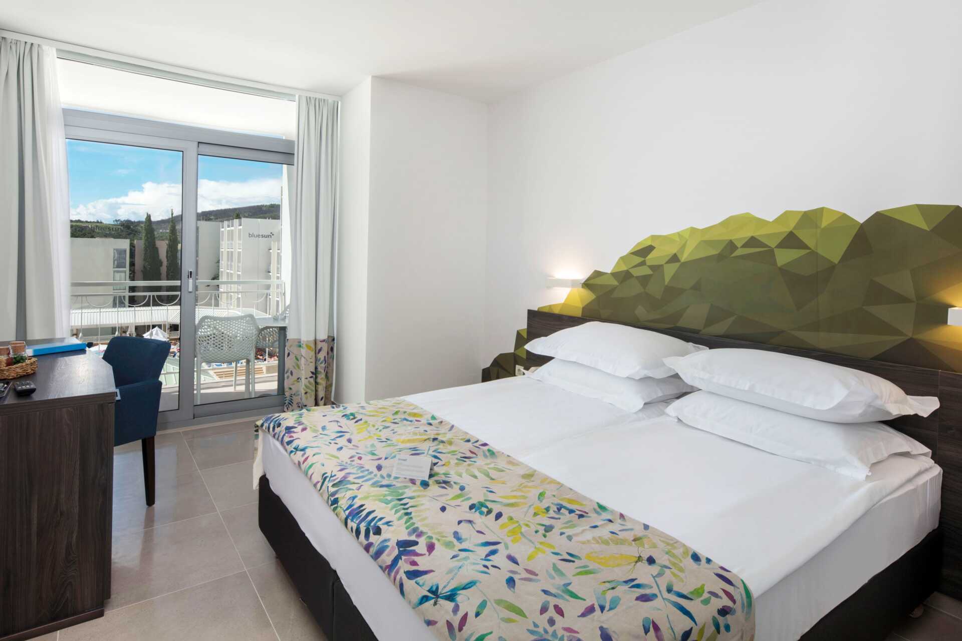 Kahden hengen huoneita, joissa on parveke, osassa rajoitettu merinäköala. Kaksi yhden hengen vuodetta. Maksuton wifi, ilmastointi ja tallelokero. Minibaari. Tv kansainvälisillä kanavilla. Hiustenkuivain. Suihku ja wc. Siivous 7 krt/viikko.