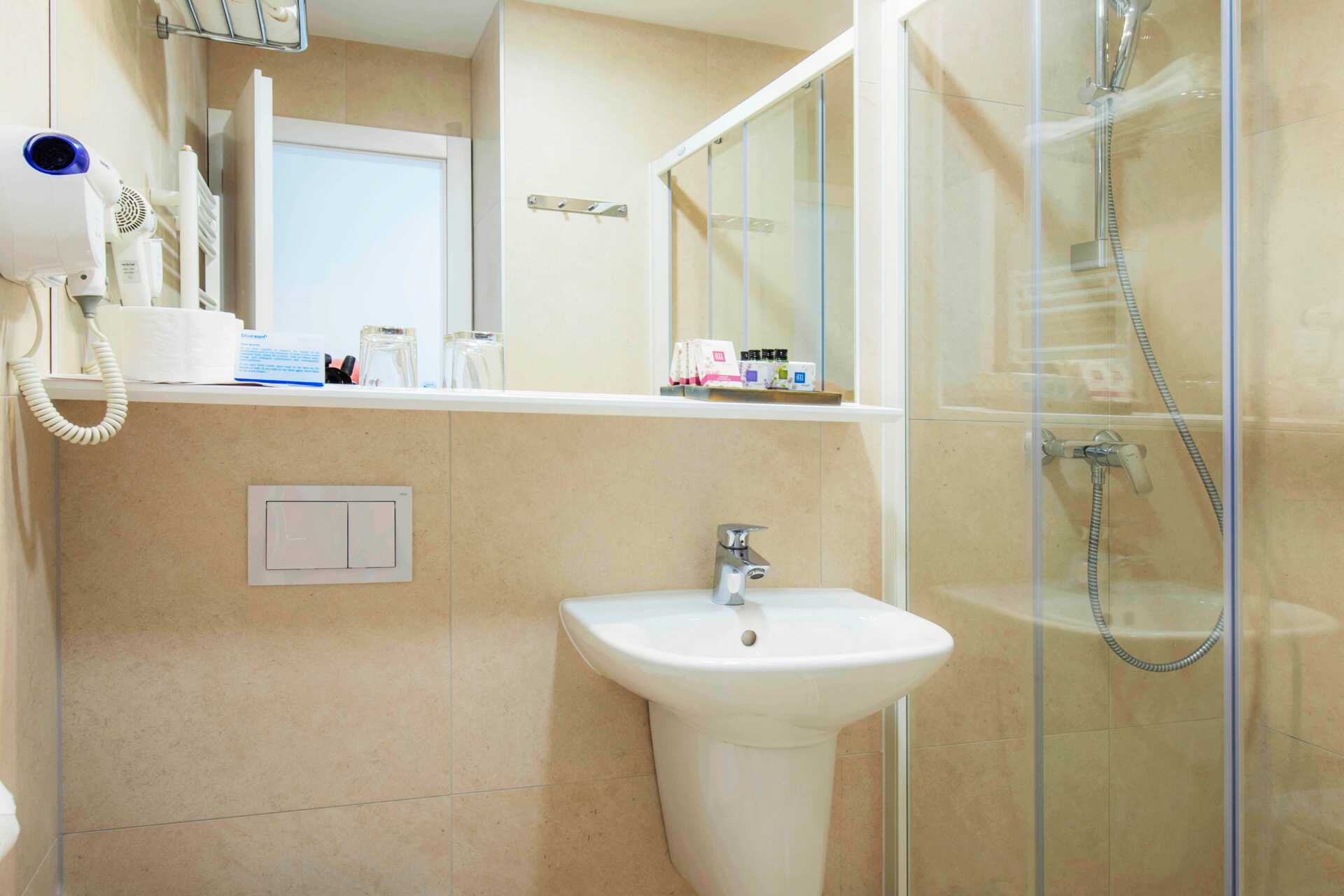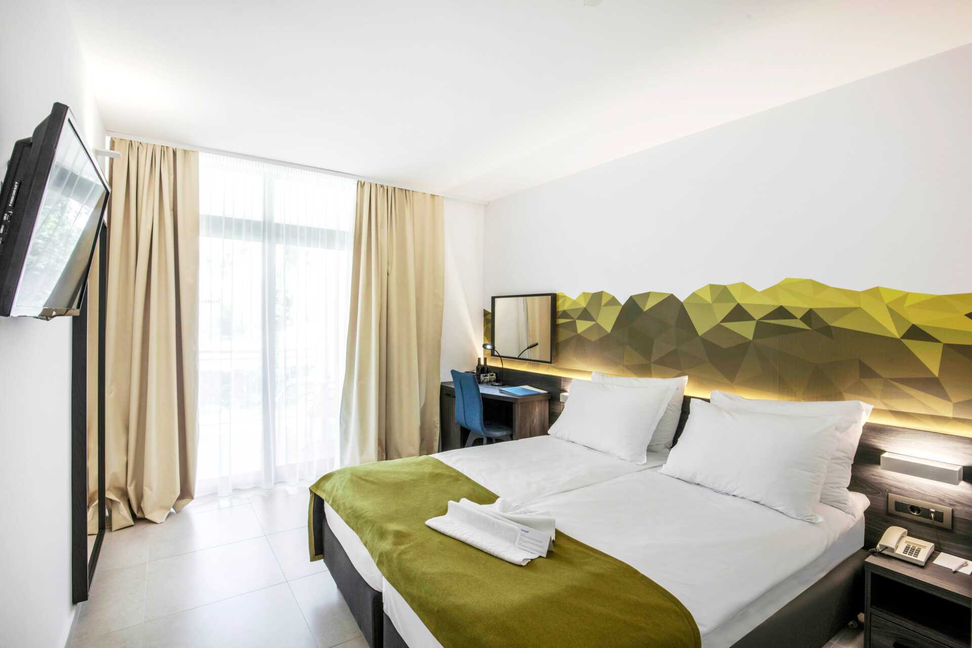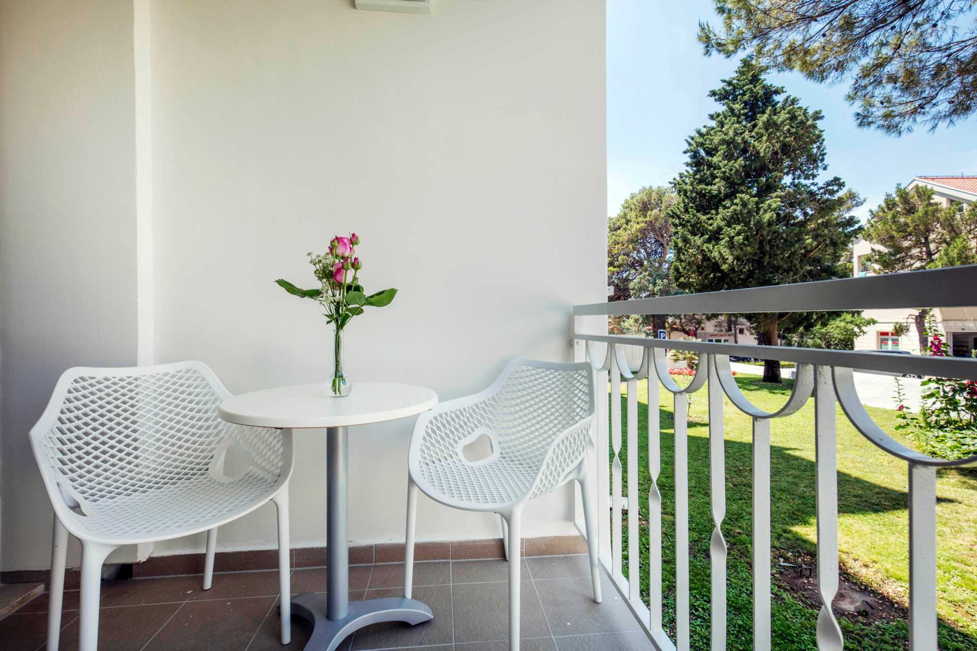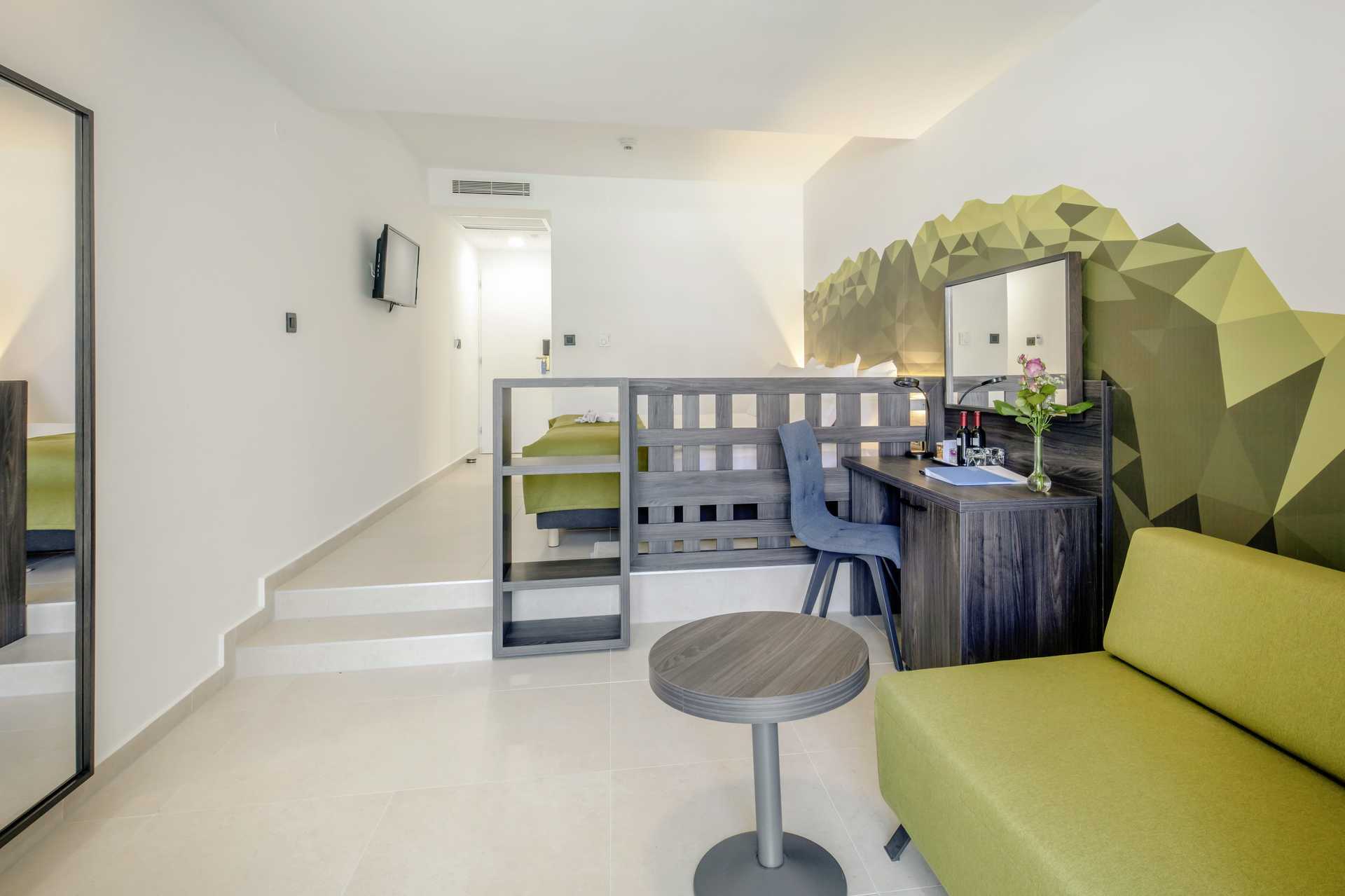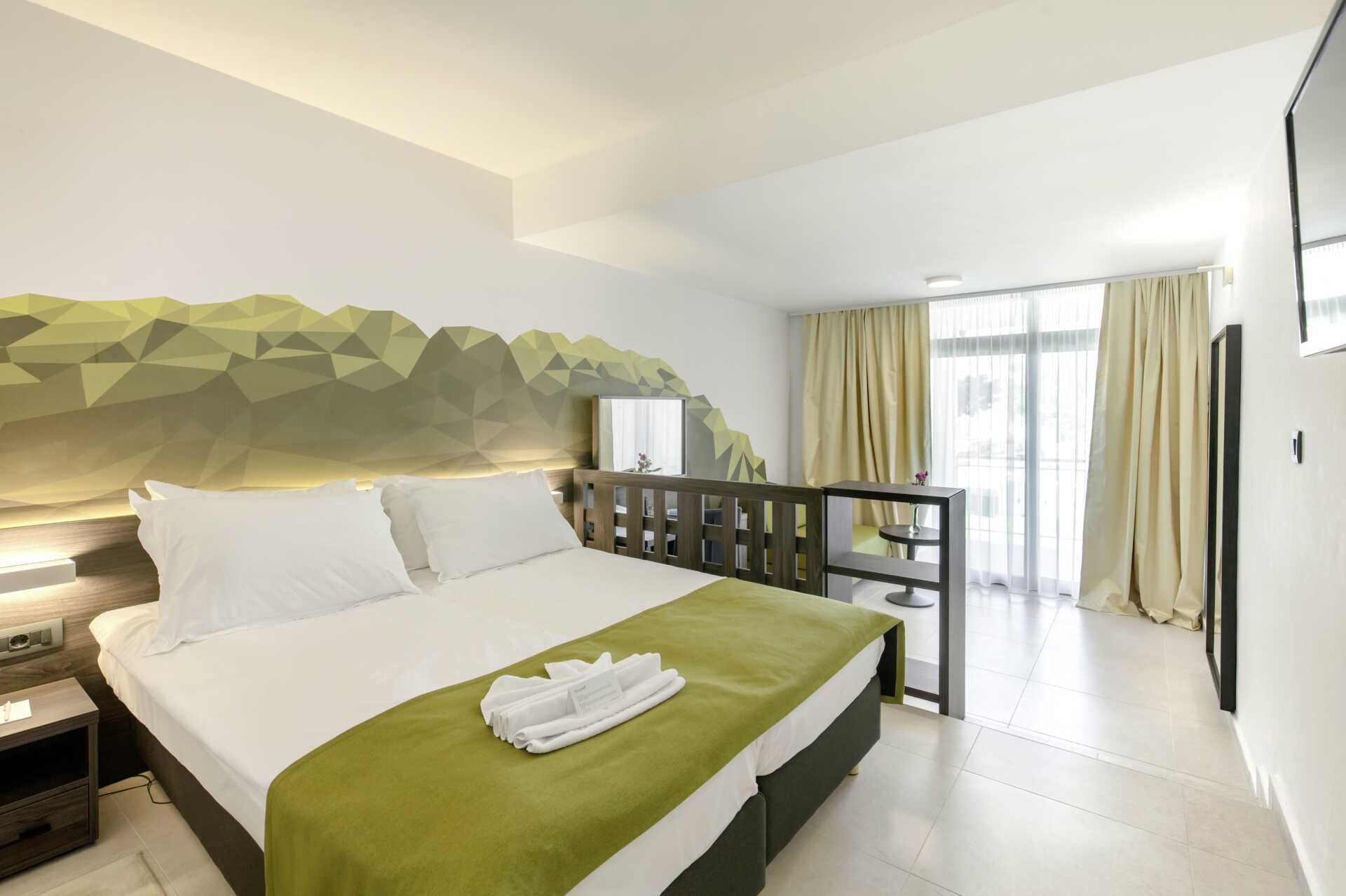 Kahden hengen huoneita, joissa on parveke, osassa rajoitettu merinäköala. Kaksi yhden hengen vuodetta. Maksuton wifi, ilmastointi ja tallelokero. Minibaari. Tv kansainvälisillä kanavilla. Hiustenkuivain. Suihku ja wc. Siivous 7 krt/viikko.